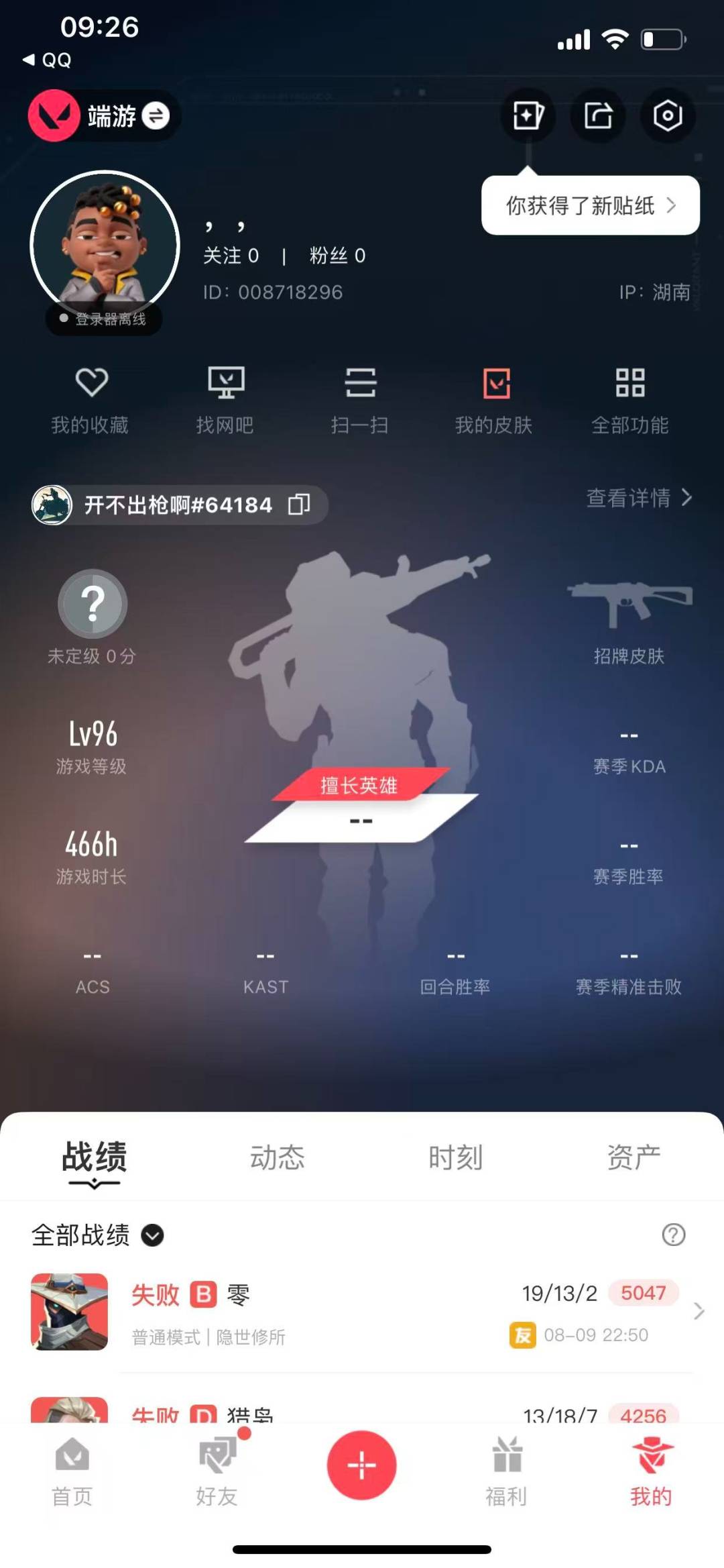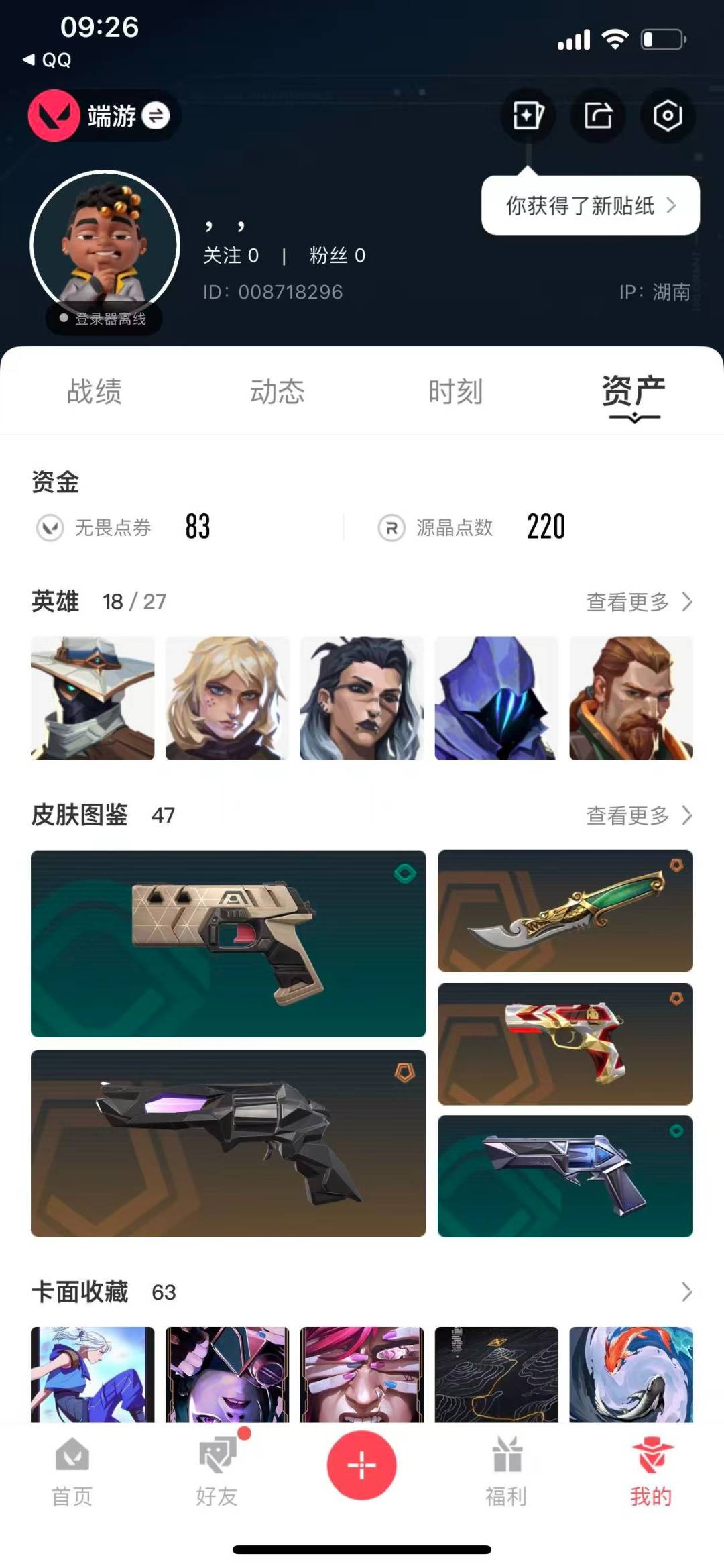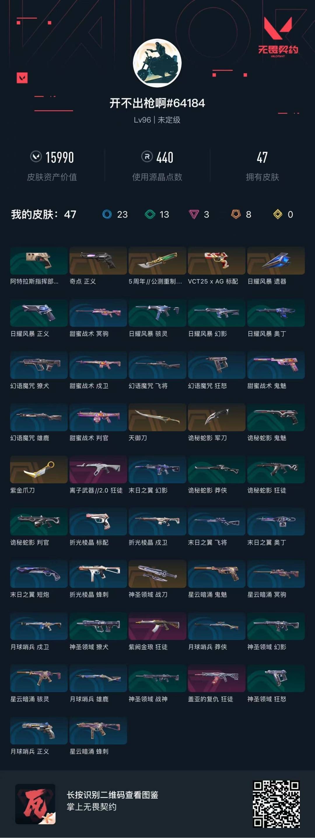 8橙皮 3紫皮 47皮肤 18英雄 63卡面 440已用源晶 未定级 优质装备:正义-奇点狂徒-紫阙金琅狂徒-盖亚的复仇紫金爪刀天御刀神圣领域 战刀诡秘蛇影苍龙之刃 佩呛皮肤:标配-vct25xag 步呛皮肤:狂徒-离子武器2.0