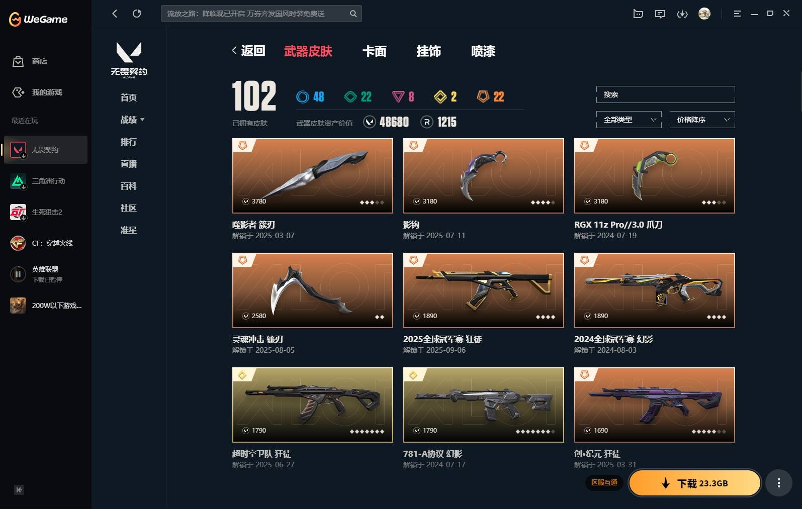 XL 【实名情况】可二次实名 【排位情况】可排位 【账号状态】无封号 【区服】QQ 【游戏等级】Lv101 【游戏段位】超凡III 【剩余V点】53 【剩余R点】15 【皮肤资产价值】48680 【使用R点】1215 【英雄数量】21 【皮肤数量】102 【卡面数量】124 【喷漆数量】119 【挂件数量】90 【拥有套装】噬影者套装(噬影者-狂徒噬影者-戍卫噬影者-蜂刺噬影者-鬼魅噬影者-簇刃)RGX-11z-Pro//3.0套装(RGX-11z-Pro//3.0-莽侠RGX-11z-Pro//3.0-正义RGX-11z-Pro//3.0-爪刀) 【拥有近战武器】阿特拉斯指挥部-甩棍,神圣领域-战刀,超能偶像-应援棒,流星兵团-短剑,影钩,灵魂冲击-镰刃, 【拥有步枪】创·纪元-狂徒,混沌序曲-狂徒,全息波普//2.0-狂徒,2025全球冠军赛-狂徒,2024全球冠军赛-幻影,偃月苍龙-狂徒,超时空卫队-狂徒,781-A协议-幻影,离子武器//2.0-狂徒,侦察力量-幻影,海洋之星-狂徒,日冕雄师-獠犬,掠影-狂徒,掠影-戍卫,阿特拉斯指挥部-狂徒,诡秘蛇影-狂徒,神圣领域-獠犬,神圣领域-幻影,超限闪存-幻影,超能偶像-戍卫,超能偶像-狂徒,流星兵团-狂徒,悠闲猫生-幻影,太空穿梭-戍卫,悠闲猫生-獠犬,末日之翼-幻影,折光棱晶-戍卫,月球哨兵-戍卫,模拟赫兹-獠犬,浮光跃金-戍卫,聚合之力-幻影,采蜜小蜂队-獠犬,星航勇进-狂徒,战术熊与伙伴们-戍卫, 【拥有狙击枪】堕天遗武-冥驹,阿特拉斯指挥部-莽侠,诡秘蛇影-莽侠,超限闪存-莽侠,悠闲猫生-飞将,末日之翼-飞将,星云暗涌-冥驹,月球哨兵-莽侠,模拟赫兹-冥驹,聚合之力-飞将,战术熊与伙伴们-飞将,纤云弄巧-莽侠, 【拥有机枪】神圣领域-战神,流星兵团-奥丁,太空穿梭-战神,末日之翼-奥丁,浮光跃金-战神,采蜜小蜂队-战神, 【拥有冲锋枪】阿特拉斯指挥部-骇灵,超限闪存-蜂刺,流星兵团-骇灵,折光棱晶-蜂刺,星云暗涌-蜂刺,星云暗涌-骇灵,浮光跃金-骇灵,聚合之力-蜂刺,纤云弄巧-蜂刺, 【拥有霰弹枪】诡秘蛇影-判官,超能偶像-判官,太空穿梭-判官,月球哨兵-雄鹿,模拟赫兹-雄鹿,采蜜小蜂队-判官, 【拥有手枪】VCT-x-TE-标配,塑水宗-正义,侦察力量-鬼魅,阿特拉斯指挥部-标配,神圣领域-狂怒,超能偶像-标配,流星兵团-鬼魅,太空穿梭-正义,悠闲猫生-短炮,折光棱晶-标配,末日之翼-短炮,月球哨兵-正义,星云暗涌-鬼魅,浮光跃金-标配,模拟赫兹-鬼魅,聚合之力-狂怒,采蜜小蜂队-鬼魅,纤云弄巧-正义,战术熊与伙伴们-狂怒,纤云弄巧-短炮,战术熊与伙伴们-标配, 【稀有挂件】V25第三幕神话挂饰,第九季超凡挂饰,无畏契约GO第一卷芮娜挂饰,无畏契约GO第一卷零挂饰,熔岩灯挂饰,糖葫芦挂饰,袖珍捷风挂饰,超能偶像挂饰,迷你浓缩挂饰,采蜜小蜂队挂饰,第八季钻石挂饰,金属蝶翼挂饰,终章迷你机甲挂饰,战术河童挂饰,2021冠军巡回赛花火挂饰,迷你机甲挂饰,章鱼烧先生挂饰,云开见日挂饰,传世莲华挂饰, 【卡面信息】我眼中的世界卡面,我见识过的恐惧卡面,噬影者卡面,万圣夜卡面,双城之战拥抱卡面,超能偶像卡面,RGX11zPro30卡面,无畏