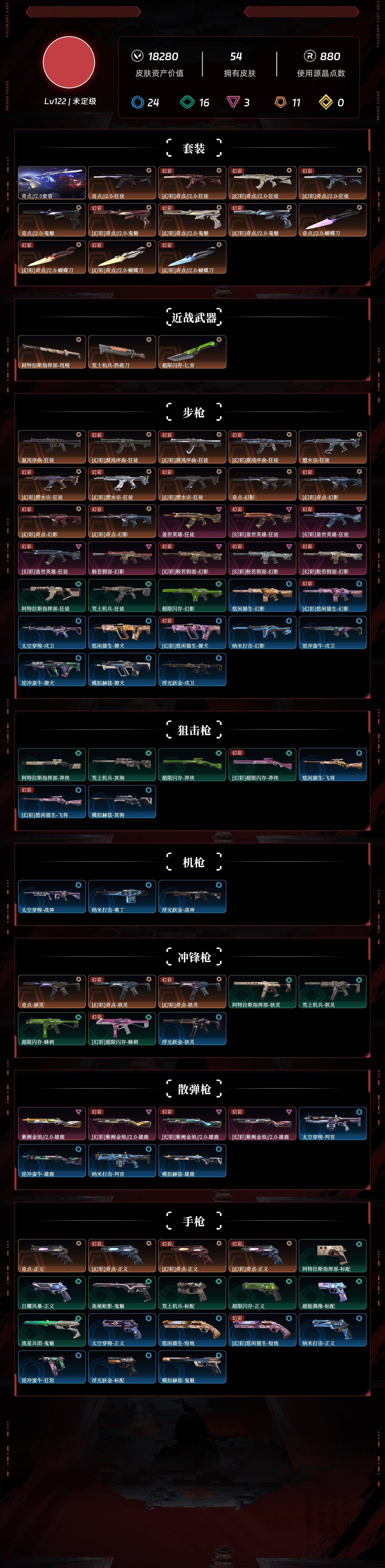 [11802002]r30478 无二次 剩余点券:223 lv122 ,皮肤总价值18280,未定级,总皮肤54,刀皮4呛皮50传奇7卓越3,套装1传奇1,奇点2.0套装,具体详情看图