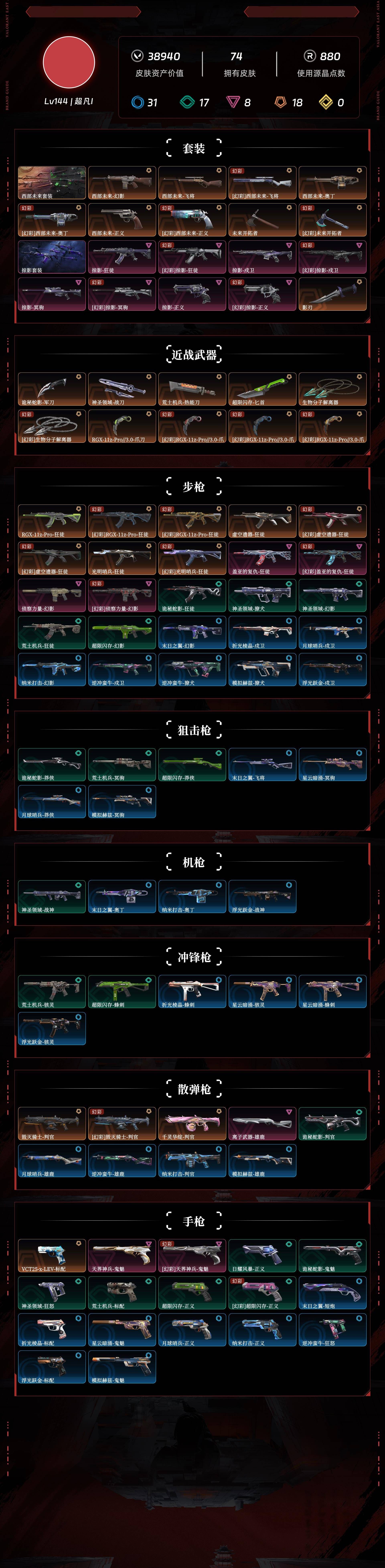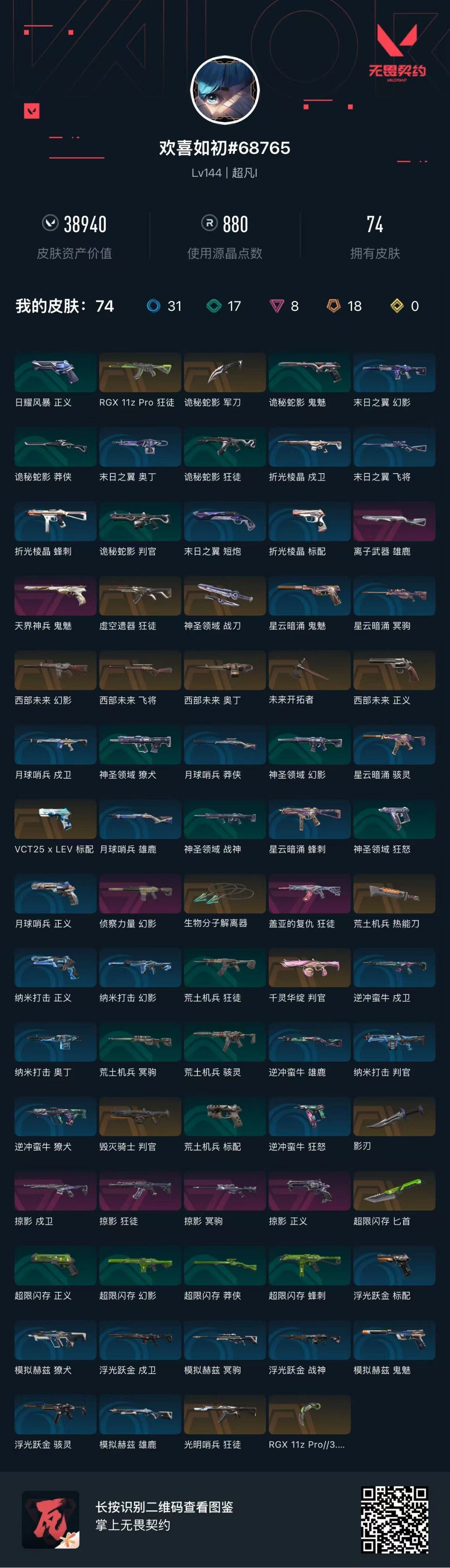 [11935519]r29033 lv144 ,皮肤总价值38940,超凡i,总皮肤74,刀皮8呛皮66传奇10卓越8,套装2传奇1卓越1,具体详情看图