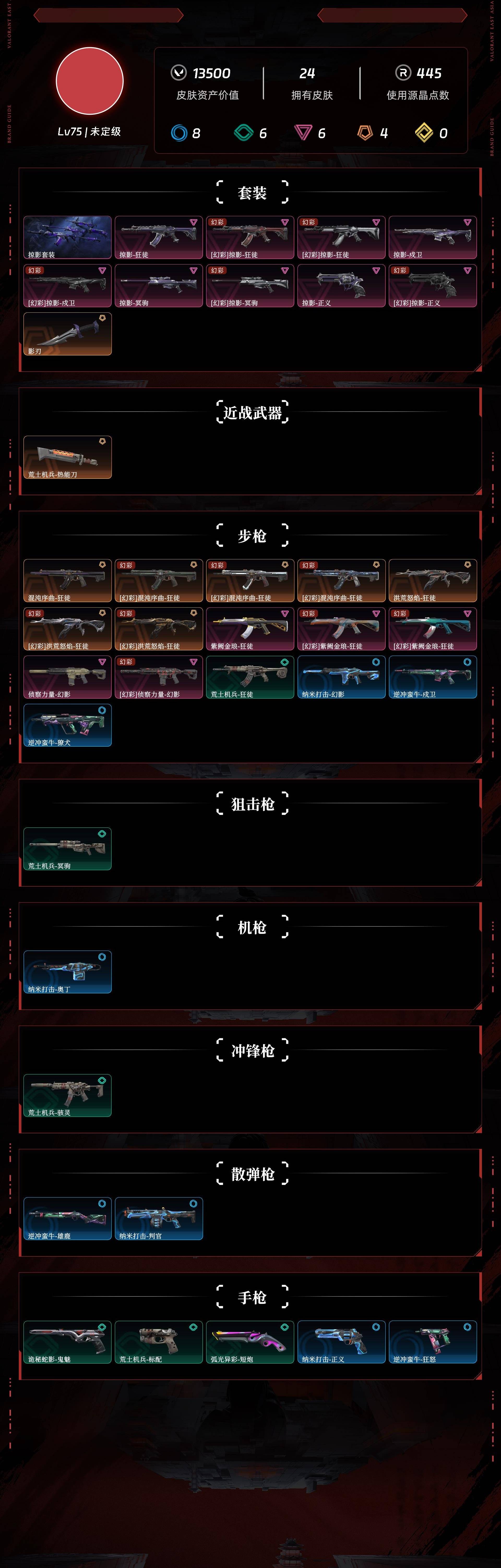 [12163637]r31606 lv75 ,皮肤总价值13500,未定级,总皮肤24,刀皮2呛皮22传奇2卓越6,套装1卓越1,具体详情看图
