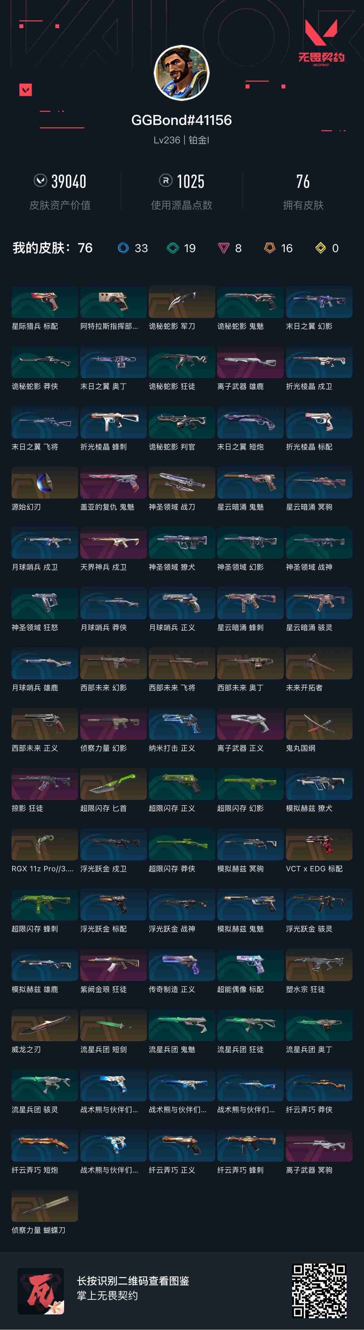 鑫 【实名情况】可二次实名 【排位情况】可排位 【账号状态】无封号 【区服】QQ 【游戏等级】Lv236 【游戏段位】铂金I 【剩余V点】27 【剩余R点】95 【皮肤资产价值】39040 【使用R点】1025 【英雄数量】27 【皮肤数量】76 【卡面数量】122 【喷漆数量】116 【挂件数量】88 【拥有套装】西部未来套装(西部未来-幻影西部未来-奥丁西部未来-飞将西部未来-正义未来开拓者) 【拥有近战武器】诡秘蛇影-军刀,神圣领域-战刀,超限闪存-匕首,流星兵团-短剑,源始幻刃,鬼丸国纲,RGX-11z-Pro//3.0-爪刀,侦察力量-蝴蝶刀,威龙之刃, 【拥有步枪】塑水宗-狂徒,天界神兵-戍卫,紫阙金琅-狂徒,侦察力量-幻影,掠影-狂徒,诡秘蛇影-狂徒,神圣领域-獠犬,神圣领域-幻影,超限闪存-幻影,流星兵团-狂徒,末日之翼-幻影,折光棱晶-戍卫,月球哨兵-戍卫,模拟赫兹-獠犬,浮光跃金-戍卫,战术熊与伙伴们-戍卫, 【拥有狙击枪】离子武器-冥驹,诡秘蛇影-莽侠,超限闪存-莽侠,末日之翼-飞将,星云暗涌-冥驹,月球哨兵-莽侠,模拟赫兹-冥驹,战术熊与伙伴们-飞将,纤云弄巧-莽侠, 【拥有机枪】神圣领域-战神,流星兵团-奥丁,末日之翼-奥丁,浮光跃金-战神, 【拥有冲锋枪】超限闪存-蜂刺,流星兵团-骇灵,折光棱晶-蜂刺,星云暗涌-蜂刺,星云暗涌-骇灵,浮光跃金-骇灵,纤云弄巧-蜂刺, 【拥有霰弹枪】离子武器-雄鹿,诡秘蛇影-判官,月球哨兵-雄鹿,模拟赫兹-雄鹿, 【拥有手枪】VCT-x-EDG-标配,盖亚的复仇-鬼魅,离子武器-正义,星际猎兵-标配,阿特拉斯指挥部-标配,诡秘蛇影-鬼魅,神圣领域-狂怒,超限闪存-正义,超能偶像-标配,流星兵团-鬼魅,末日之翼-短炮,折光棱晶-标配,星云暗涌-鬼魅,月球哨兵-正义,纳米打击-正义,浮光跃金-标配,模拟赫兹-鬼魅,传奇制造-正义,战术熊与伙伴们-标配,纤云弄巧-短炮,战术熊与伙伴们-狂怒,纤云弄巧-正义, 【稀有挂件】V25第三幕钻石挂饰,晴空飞猪挂饰,春节吉祥结挂饰,传世莲华挂饰,第九季超凡挂饰,终章猫猫木乃伊挂饰,无畏契约GO第一卷芮娜挂饰,无畏契约GO第一卷零挂饰,拳击战术熊挂饰,熔岩灯挂饰,袖珍捷风挂饰,糖葫芦挂饰,迷你浓缩挂饰,终章迷你机甲挂饰,迷你机甲挂饰,云开见日挂饰,章鱼烧先生挂饰,战术河童挂饰, 【卡面信息】九命灵猫卡面,西部未来卡面,先驱者卡面,无畏契约吉祥物卡面,双城之战拥抱卡面,