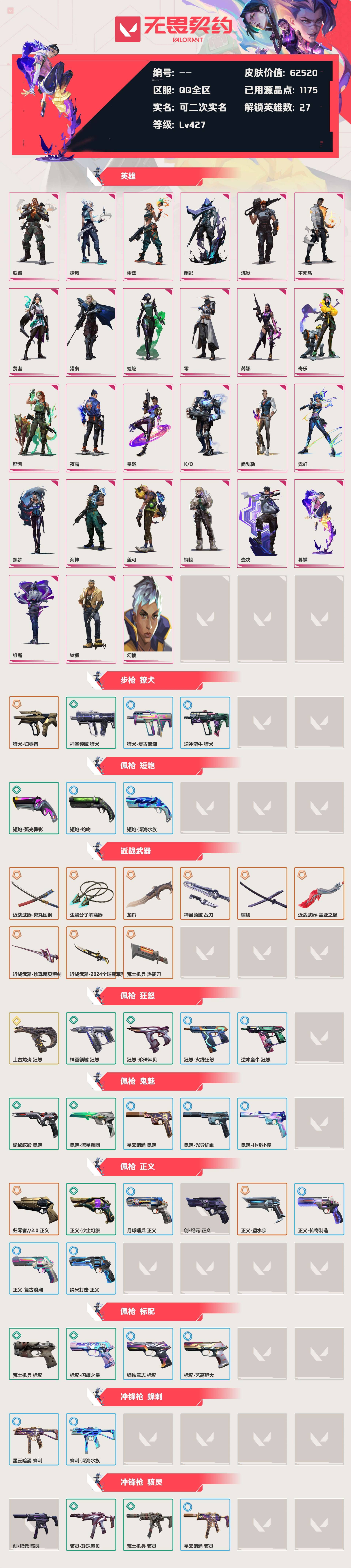 [12666990]等级:lv427 | 未定级/ 已用源晶点:1175/ 皮肤价值:62520/ 英雄数:27/ 【英雄】 铁臂 捷风 雷兹 幽影 炼狱 不死鸟 贤者 猎枭 蝰蛇 零 芮娜 奇乐 斯凯 夜露 星礈 k/o 尚勃勒 霓虹 黑梦 海神 盖可 钢锁 壹决 暮蝶 维斯 钛狐 幻棱 【套装】 盖亚的复仇套装(盖亚的复仇狂徒) 紫阙金琅套装(紫阙金琅狂徒) 归零者套装(归零者狂徒归零者獠犬) 盖世英雄套装(盖世英雄冥驹) 塑水宗套装(塑水宗狂徒塑水宗正义) 般若假面//2.0 礼包(鬼丸国纲) 洪荒怒焰套装(洪荒怒焰幻影) 盖亚的复仇//2.0(盖亚之愠) rgx 11z pro//3.0(rgx11zpro//3.0莽侠) 英雄之选 礼包(紫阙金琅狂徒) 离子武器(离子武器冥驹) 侦察力量(侦察力量幻影) 2024全球冠军赛 礼包(2024全球冠军赛幻影2024全球冠军赛战刀) 混沌序曲 礼包(混沌序曲狂徒) 掠影 礼包(掠影狂徒) 回响礼包 // v25 礼包(侦察力量幻影盖世英雄冥驹) 创·纪元 礼包(创·纪元狂徒创·纪元正义创·纪元骇灵创·纪元莽侠镭切) 上古龙炎 礼包(上古龙炎狂徒上古龙炎冥驹上古龙炎狂怒上古龙炎判官龙爪) 归零者//2.0 礼包(归零者//2.0幻影归零者//2.0正义归零者//2.0莽侠归零者//2.0戍卫生物分子解离器) 【步呛 獠犬】 神圣领域 獠犬 獠犬-复古浪潮 逆冲蛮牛 獠犬 獠犬-归零者 【佩呛 短炮】 短炮-蛇吻 短炮-深海水族 短炮-弧光异彩 【近战武器】 近战武器-鬼丸国纲 生物分子解离器 龙爪 神圣领域 战刀 镭切 近战武器-盖亚之愠 近战武器-珍珠棘贝短剑 近战武器-2024全球冠军赛战刀 荒土机兵 热能刀 【佩呛 狂怒】 神圣领域 狂怒 上古龙炎 狂怒 狂怒-火线狂怒 逆冲蛮牛 狂怒 狂怒-珍珠棘贝 【佩呛 鬼魅】 诡秘蛇影 鬼魅 星云暗涌 鬼魅 鬼魅-光导纤维 鬼魅-扑棱扑棱 鬼魅-流星兵团 【佩呛 正义】 月球哨兵 正义 归零者//2.0 正义 创·纪元 正义 正义-传奇制造 正义-复古浪潮 纳米打击 正义 正义-沙尘幻旅 正义-塑水宗 【佩呛 标配】 钢铁意志 标配 标配-艺高胆大 荒土机兵 标配 标配-闪耀之星 【冲锋呛 蜂刺】 星云暗涌 蜂刺 蜂刺-深海水族 【冲锋呛 骇灵】 创·纪元 骇灵 星云暗涌 骇灵 骇灵-珍珠棘贝 荒土机兵 骇灵 【霰弹呛 雄鹿】 月球哨兵 雄鹿 雄鹿-复古浪潮 逆冲蛮牛 雄鹿 【霰弹呛 判官】 上古龙炎 判官 纳米打击 判官