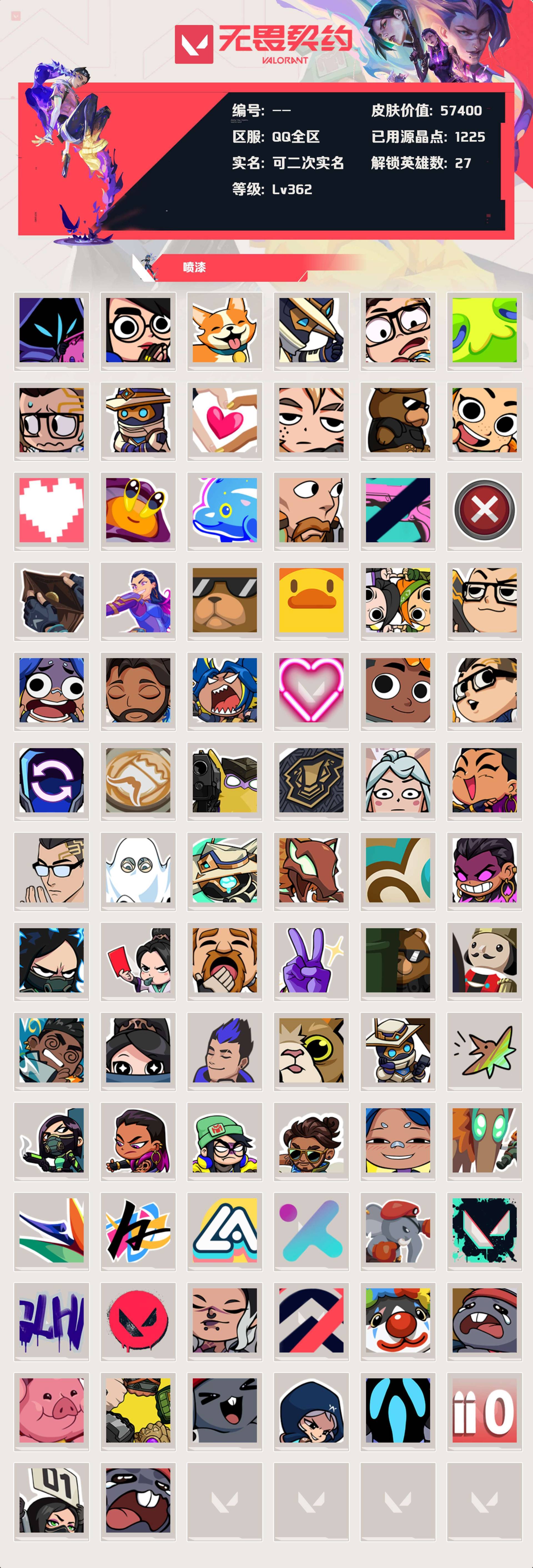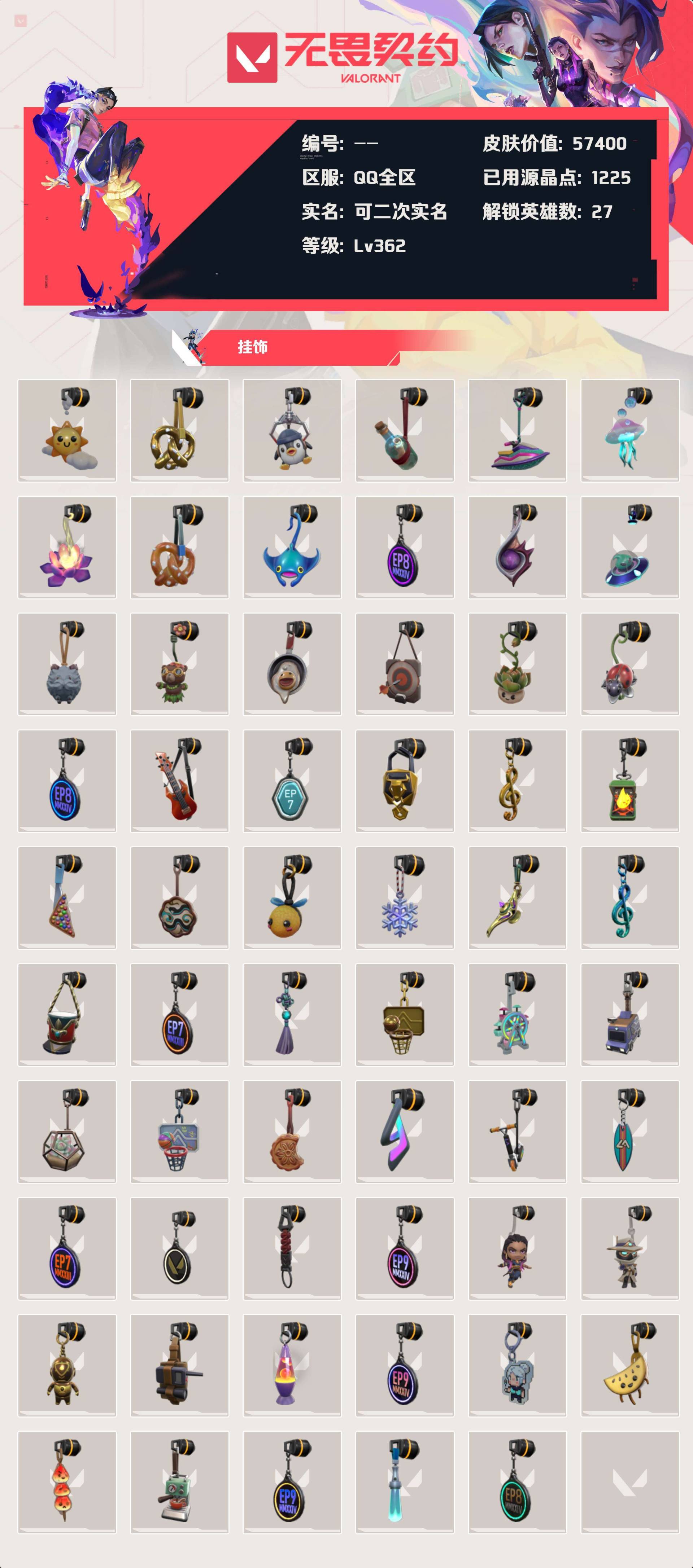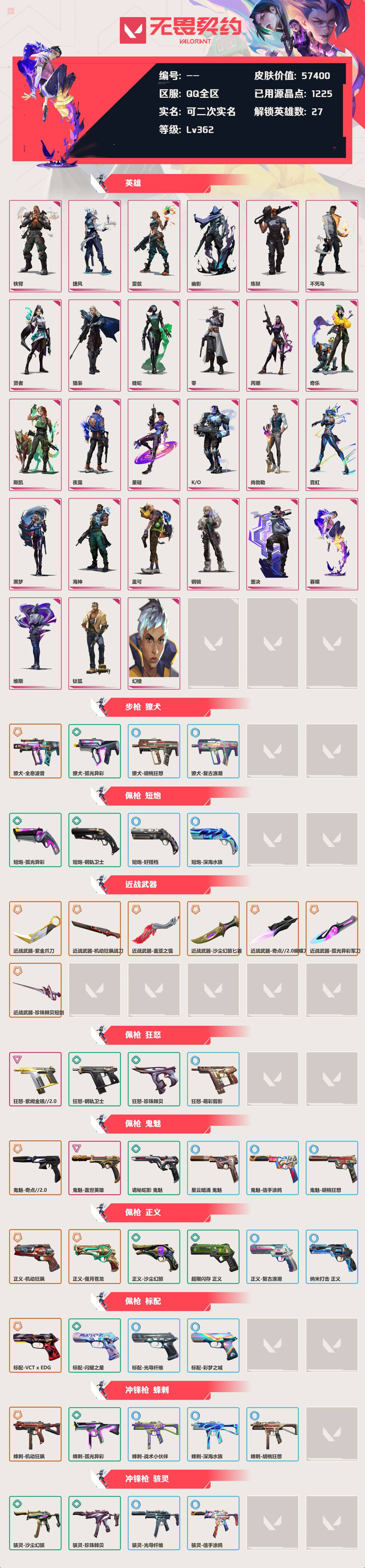 [12726631]等级:lv362 | 未定级/ 已用源晶点:1225/ 皮肤价值:57400/ 英雄数:27/ 【英雄】 铁臂 捷风 雷兹 幽影 炼狱 不死鸟 贤者 猎枭 蝰蛇 零 芮娜 奇乐 斯凯 夜露 星礈 k/o 尚勃勒 霓虹 黑梦 海神 盖可 钢锁 壹决 暮蝶 维斯 钛狐 幻棱 【套装】 偃月苍龙套装(偃月苍龙正义) 盖亚的复仇套装(盖亚的复仇狂徒) 紫阙金琅套装(紫阙金琅狂徒) 天界神兵套装(天界神兵戍卫) 盖世英雄套装(盖世英雄狂徒盖世英雄鬼魅) 机动狂飙套装(机动狂飙战刀机动狂飙狂徒机动狂飙雄鹿机动狂飙蜂刺机动狂飙正义) 全息波普套装(全息波普獠犬) 塑水宗套装(塑水宗狂徒) 堕天遗武套装(堕天遗武冥驹) 盖亚的复仇//2.0(盖亚之愠) vctxedg 队伍礼包(vctxedg标配) 英雄之选 礼包(天界神兵戍卫堕天遗武冥驹紫阙金琅狂徒) 海洋之星(海洋之星狂徒) 侦察力量(侦察力量幻影) 2024全球冠军赛 礼包(2024全球冠军赛幻影) 紫阙金琅//2.0(紫阙金琅//2.0幻影紫阙金琅//2.0奥丁紫阙金琅//2.0狂怒紫阙金琅//2.0雄鹿紫金爪刀) 混沌序曲 礼包(混沌序曲狂徒) 奇点//2.0 礼包(奇点//2.0狂徒奇点//2.0鬼魅奇点//2.0蝴蝶刀) 回火礼包:奇点 礼包(奇点//2.0狂徒奇点//2.0鬼魅奇点//2.0蝴蝶刀) 回响礼包 // v25 礼包(侦察力量幻影) 离子武器//2.0 礼包(离子武器//2.0狂徒) 【步呛 獠犬】 獠犬-胡桃狂想 獠犬-复古浪潮 獠犬-弧光异彩 獠犬-全息波普 【佩呛 短炮】 短炮-好搭档 短炮-深海水族 短炮-弧光异彩 短炮-钢轨卫士 【近战武器】 近战武器-紫金爪刀 近战武器-机动狂飙战刀 近战武器-盖亚之愠 近战武器-沙尘幻旅匕首 近战武器-奇点//2.0蝴蝶刀 近战武器-弧光异彩军刀 近战武器-珍珠棘贝短剑 【佩呛 狂怒】 狂怒-萌彩剪影 狂怒-钢轨卫士 狂怒-珍珠棘贝 狂怒-紫阙金琅//2.0 【佩呛 鬼魅】 诡秘蛇影 鬼魅 星云暗涌 鬼魅 鬼魅-信手涂鸦 鬼魅-胡桃狂想 鬼魅-盖世英雄 鬼魅-奇点//2.0 【佩呛 正义】 正义-复古浪潮 纳米打击 正义 正义-沙尘幻旅 超限闪存 正义 正义-机动狂飙 正义-偃月苍龙 【佩呛 标配】 标配-光导纤维 标配-彩梦之城 标配-闪耀之星 标配-vct x edg 【冲锋呛 蜂刺】 蜂刺-战术小伙伴 蜂刺-深海水族 蜂刺-胡桃狂想 蜂刺-弧光异彩 蜂刺-机动狂飙 【冲锋呛 骇灵】 骇灵-光导纤维 骇灵-信手涂鸦 骇灵-沙尘幻旅 骇灵-珍珠棘贝 【霰弹呛 雄鹿】 雄鹿-复古浪潮 雄鹿-彩梦之城 雄鹿-紫阙金琅//2.0 雄鹿-机动狂飙 【霰弹呛 判官】 判官-萌彩剪影