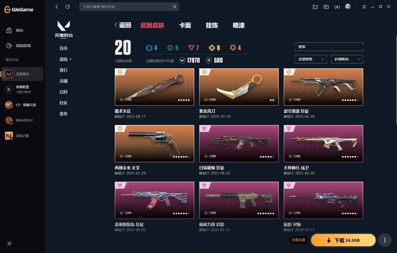 XL 【实名情况】可二次实名 【排位情况】可排位 【账号状态】无封号 【区服】QQ 【游戏等级】Lv158 【游戏段位】未定级 【剩余V点】41 【剩余R点】110 【皮肤资产价值】17970 【使用R点】580 【英雄数量】25 【皮肤数量】20 【卡面数量】73 【喷漆数量】45 【挂件数量】51 【拥有套装】 【拥有近战武器】紫金爪刀,魔术火花, 【拥有步枪】虚空遗器-狂徒,天界神兵-戍卫,盖亚的复仇-狂徒,侦察力量-幻影,起源-狂徒,日冕雄师-狂徒,咒缚双界-狂徒, 【拥有狙击枪】掠影-冥驹, 【拥有机枪】 【拥有冲锋枪】 【拥有霰弹枪】 【拥有手枪】西部未来-正义,星际猎兵-标配,阿特拉斯指挥部-标配,日耀风暴-正义,诡秘蛇影-鬼魅,超限闪存-正义,硬道理-短炮,游戏结束-正义,星云暗涌-鬼魅,纳米打击-正义, 【稀有挂件】金属蝶翼挂饰,无畏契约GO第一卷芮娜挂饰,无畏契约GO第一卷捷风挂饰,V25第三幕白银挂饰,第九季青铜挂饰,终章猫猫木乃伊挂饰,熔岩灯挂饰,迷你浓缩挂饰,袖珍捷风挂饰,好运福爪挂饰, 【卡面信息】我见识过的恐惧卡面,我眼中的世界卡面,势不可挡芮娜卡面,双城之战拥抱卡面,月光灵狐卡面,无畏