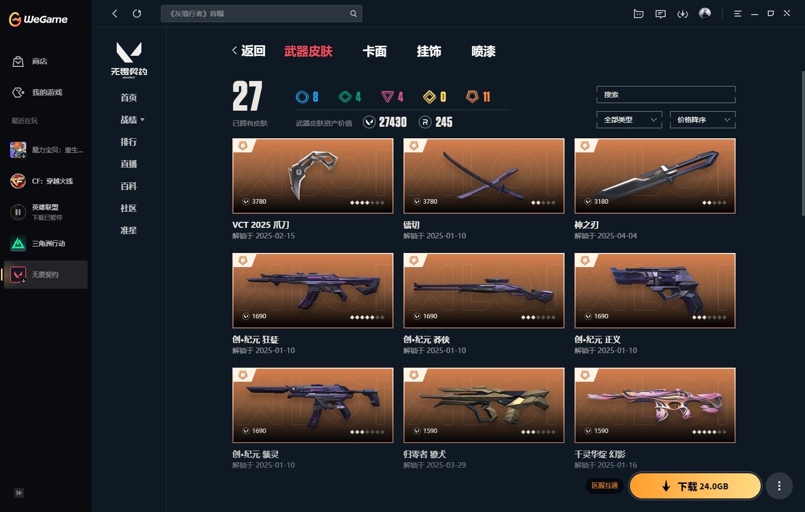 XL 【实名情况】可二次实名 【排位情况】可排位 【账号状态】无封号 【区服】QQ 【游戏等级】Lv31 【游戏段位】未定级 【剩余V点】5 【剩余R点】5 【皮肤资产价值】27430 【使用R点】245 【英雄数量】13 【皮肤数量】27 【卡面数量】37 【喷漆数量】24 【挂件数量】26 【拥有套装】神中神罚套装(神中神罚-幻影神中神罚-莽侠神中神罚-骇灵神中神罚-狂怒神之刃)创纪元套装(创·纪元-狂徒创·纪元-莽侠创·纪元-骇灵创·纪元-正义镭切) 【拥有近战武器】神圣领域-战刀,VCT-2025-爪刀, 【拥有步枪】千灵华绽-幻影,归零者-獠犬,神圣领域-獠犬,神圣领域-幻影,月球哨兵-戍卫, 【拥有狙击枪】星云暗涌-冥驹,月球哨兵-莽侠, 【拥有机枪】神圣领域-战神, 【拥有冲锋枪】星云暗涌-骇灵,星云暗涌-蜂刺, 【拥有霰弹枪】月球哨兵-雄鹿, 【拥有手枪】VCT25-x-BLG-标配,神圣领域-狂怒,星云暗涌-鬼魅,月球哨兵-正义, 【稀有挂件】 【卡面信息】VCT2025CN联赛卡面,无畏