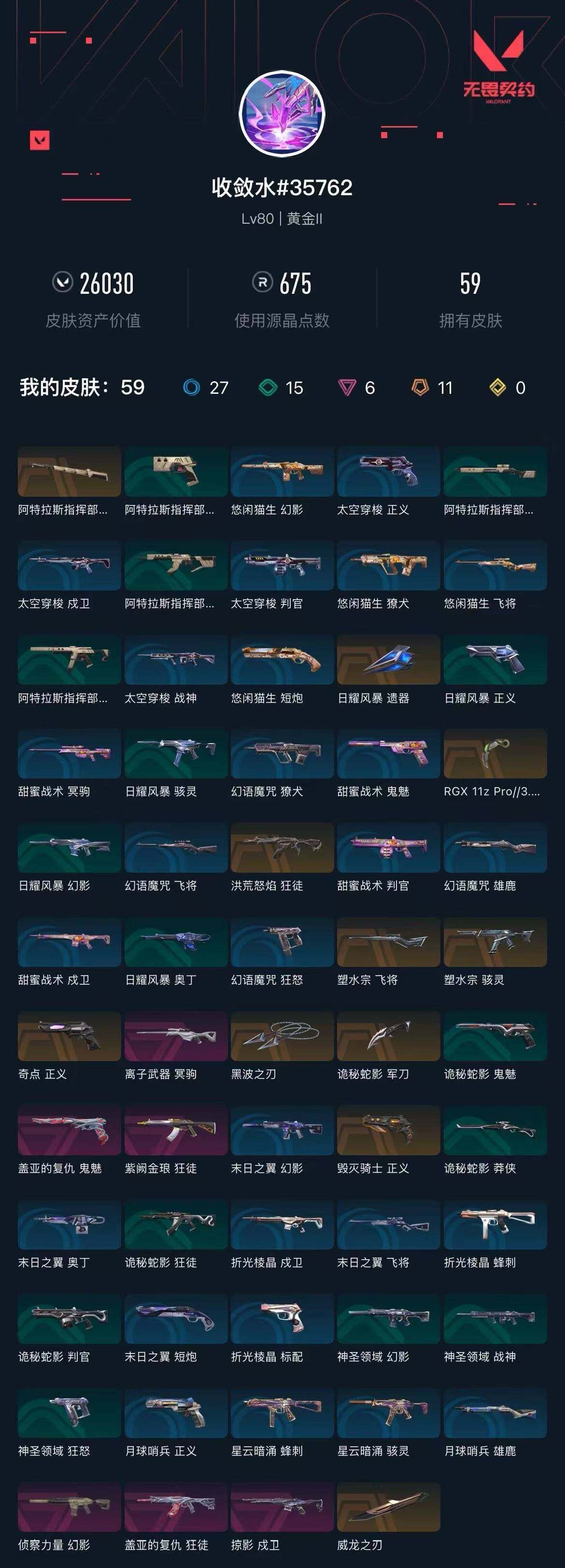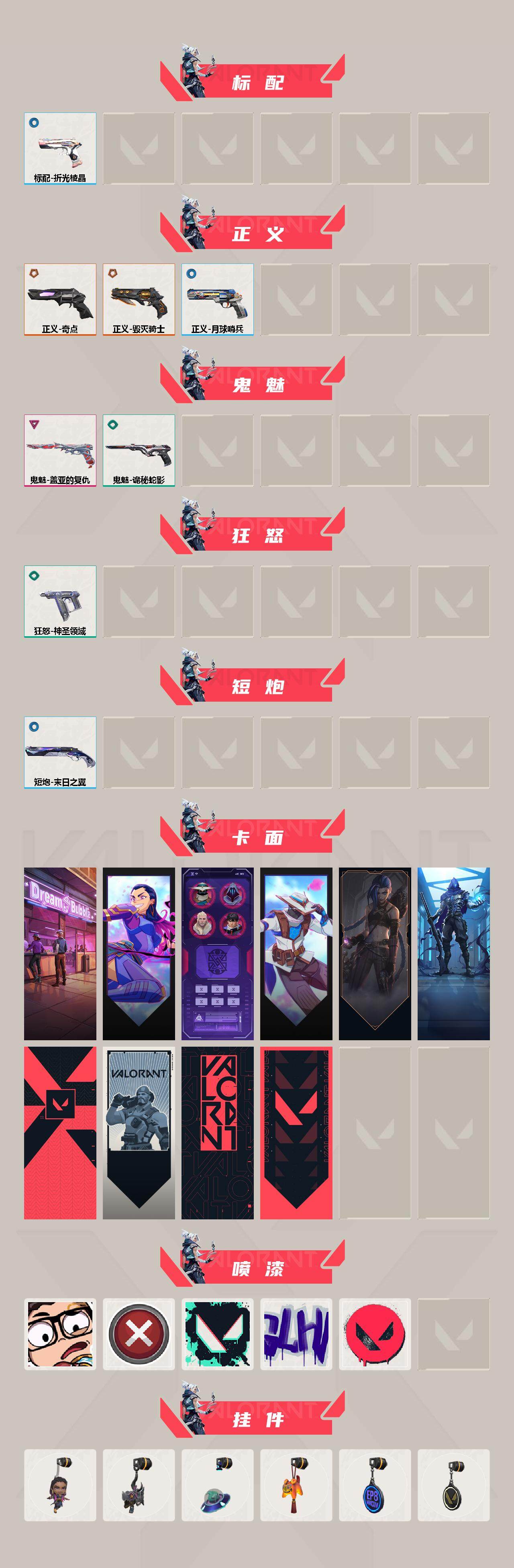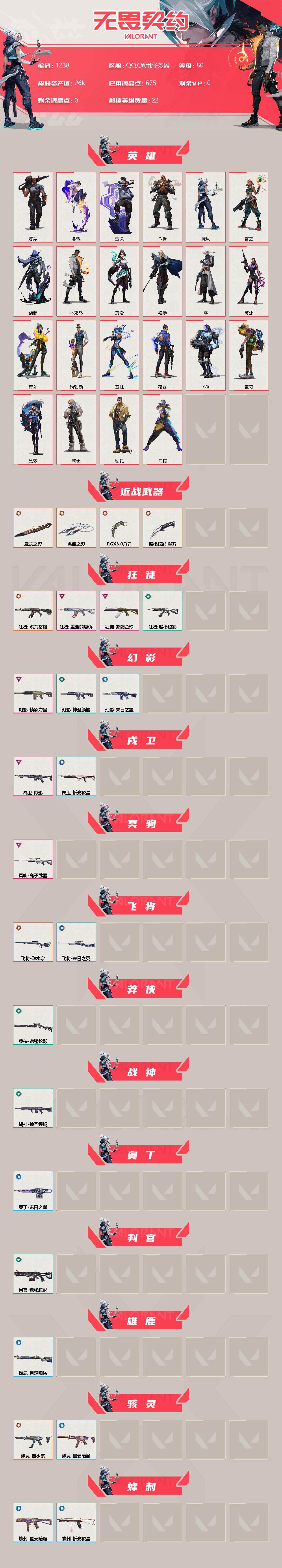 [12808177]【英雄】:幻棱,炼狱,暮蝶,钛狐,壹决,铁臂,捷风,雷兹,幽影,不死鸟,贤者,猎枭,零,芮娜,奇乐,尚勃勒,霓虹,夜露,k/o,盖可,黑梦,钢锁 【近战 武器】:近战武器-rgx 11z pro//3.0 爪刀,近战武器-黑波之刃,近战武器-威龙之刃,近战武器-诡秘蛇影 军刀 【狂徒】:狂徒-洪荒怒焰,狂徒-盖亚的复仇,狂徒-紫阙金琅,狂徒-诡秘蛇影 【幻影】:幻影-侦察力量,幻影-神圣领域,幻影-末日之翼 【戍卫】:戍卫-掠影,戍卫-折光棱晶 【冥驹】:冥驹-离子武器 【飞将】:飞将-塑水宗,飞将-末日之翼 【莽侠】:莽侠-诡秘蛇影 【战神】:战神-神圣领域 【奥丁】:奥丁-末日之翼 【判官】:判官-诡秘蛇影 【雄鹿】:雄鹿-月球哨兵 【骇灵】:骇灵-塑水宗,骇灵-星云暗涌 【蜂刺】:蜂刺-星云暗涌,蜂刺-折光棱晶 【标配】:标配-折光棱晶 【正义】:正义-毁灭骑士,正义-奇点,正义-月球哨兵 【鬼魅】:鬼魅-盖亚的复仇,鬼魅-诡秘蛇影 【狂怒】:狂怒-神圣领域 【短炮】:短炮-末日之翼 【卡面】:梦幻奶茶 卡面,无畏契约go!第一卷:芮娜 卡面,清除名单 卡面,无畏契约go!第一卷:零 卡面,《双城之战》金克丝 卡面,暗呛 卡面,代号红色 卡面,新兵报到 卡面,v契约 卡面,无畏契约 卡面 【喷漆】:新潮流 喷漆,买装还是存钱 喷漆,胜利属于无畏契约 喷漆,glhf 喷漆,无畏契约 喷漆 【挂饰】:无畏契约go!第一卷 芮娜 挂饰,鱼骨头 挂饰,天外飞客 挂饰,好运福爪 挂饰,第八季//第一幕 纪念币 挂饰,无畏契约 纪念币 挂饰