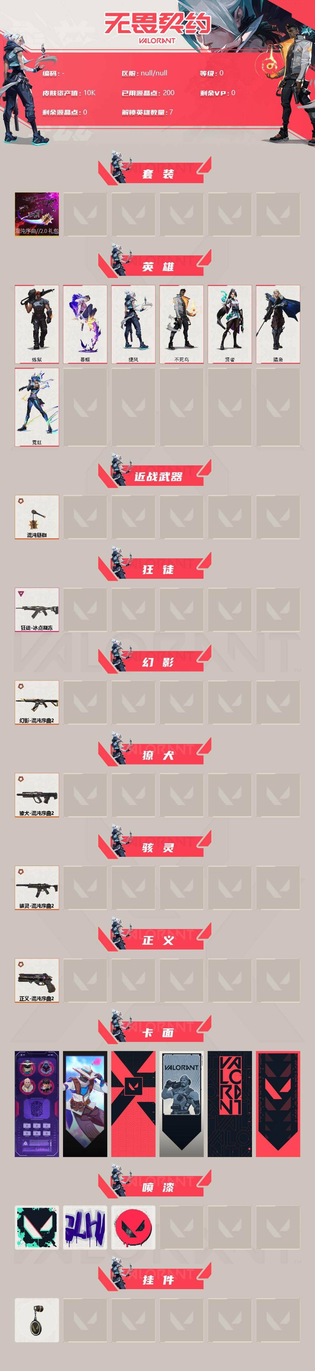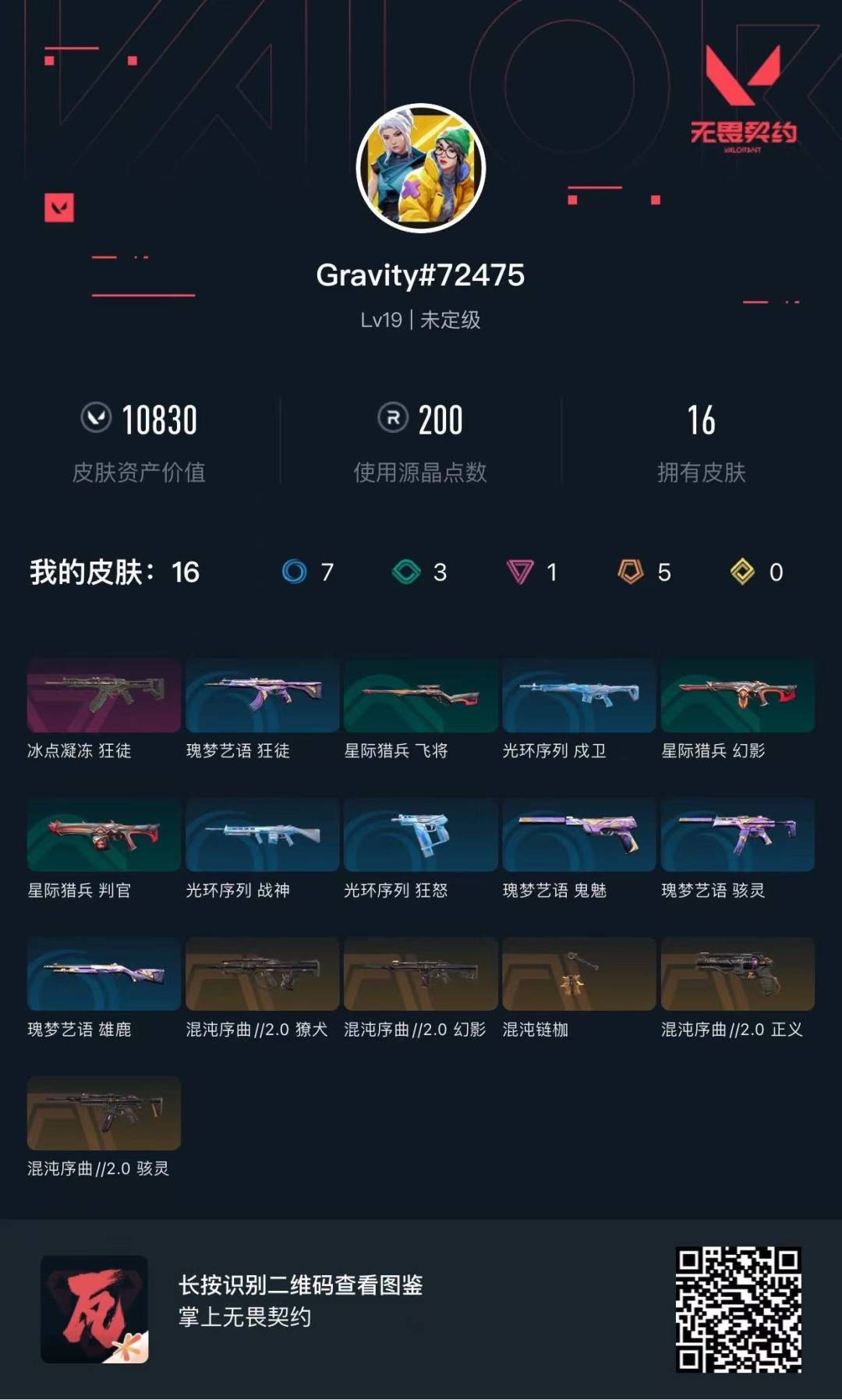 5橙皮 1紫皮 16皮肤 7英雄 21卡面 200已用源晶 未定级 【近战武器皮肤】:混沌链枷 【佩呛皮肤】:正义-混沌序曲2.0 【冲锋呛皮肤】:骇灵-混沌序曲2.0 【步呛皮肤】:獠犬-混沌序曲2.0幻影-混沌序曲2.0狂徒-冰点凝冻 【挂饰】:frgmtx皮蛋挂饰