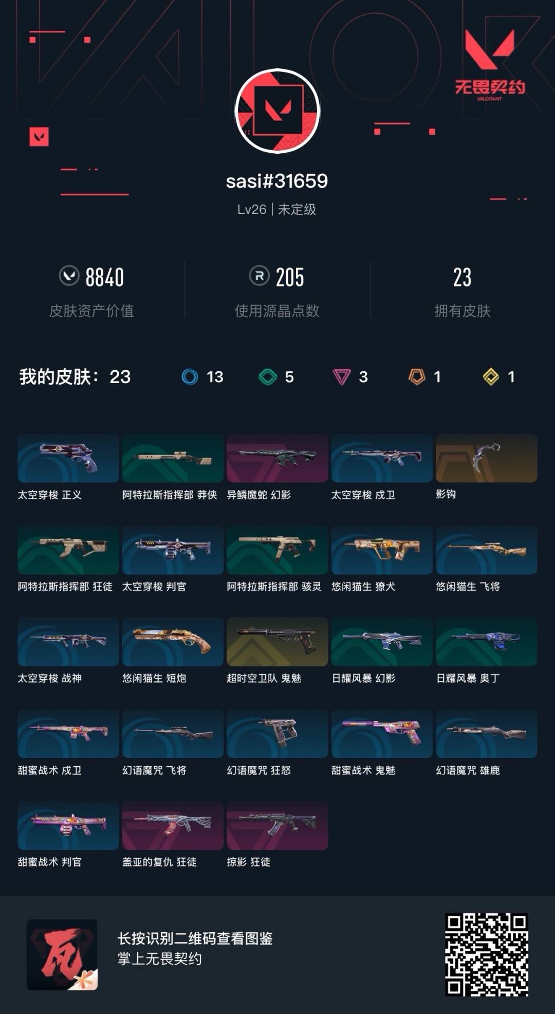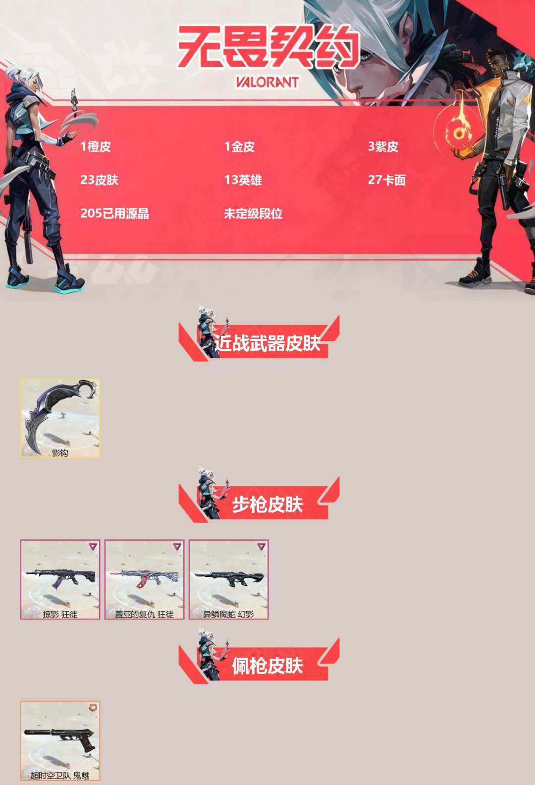 [12918343]1橙皮 1金皮 3紫皮 23皮肤 13英雄 27卡面 205已用源晶 未定级段位 【近战武器皮肤】:影钩 【佩呛皮肤】:鬼魅-超时空卫队 【步呛皮肤】:狂徒-掠影幻影-异鳞魔蛇狂徒-盖亚的复仇