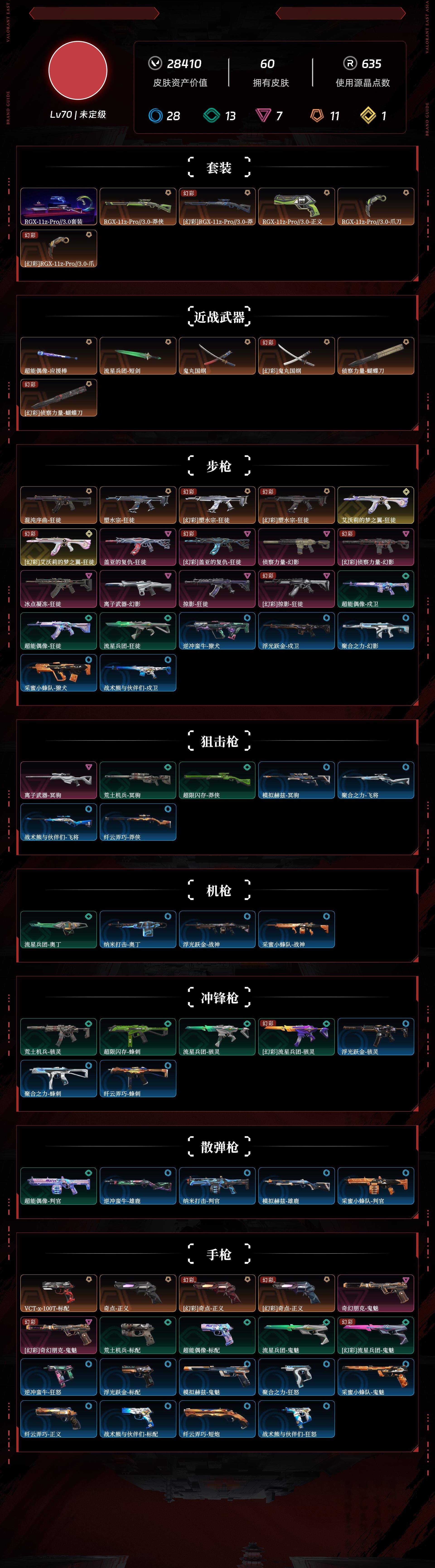 [13084652]r31708 无二次 剩余点券:125 lv70 ,皮肤总价值28410,未定级,总皮肤60,刀皮5呛皮55终极1传奇6卓越7,套装1传奇1,rgx-11z-pro//3.0套装,具体详情看图