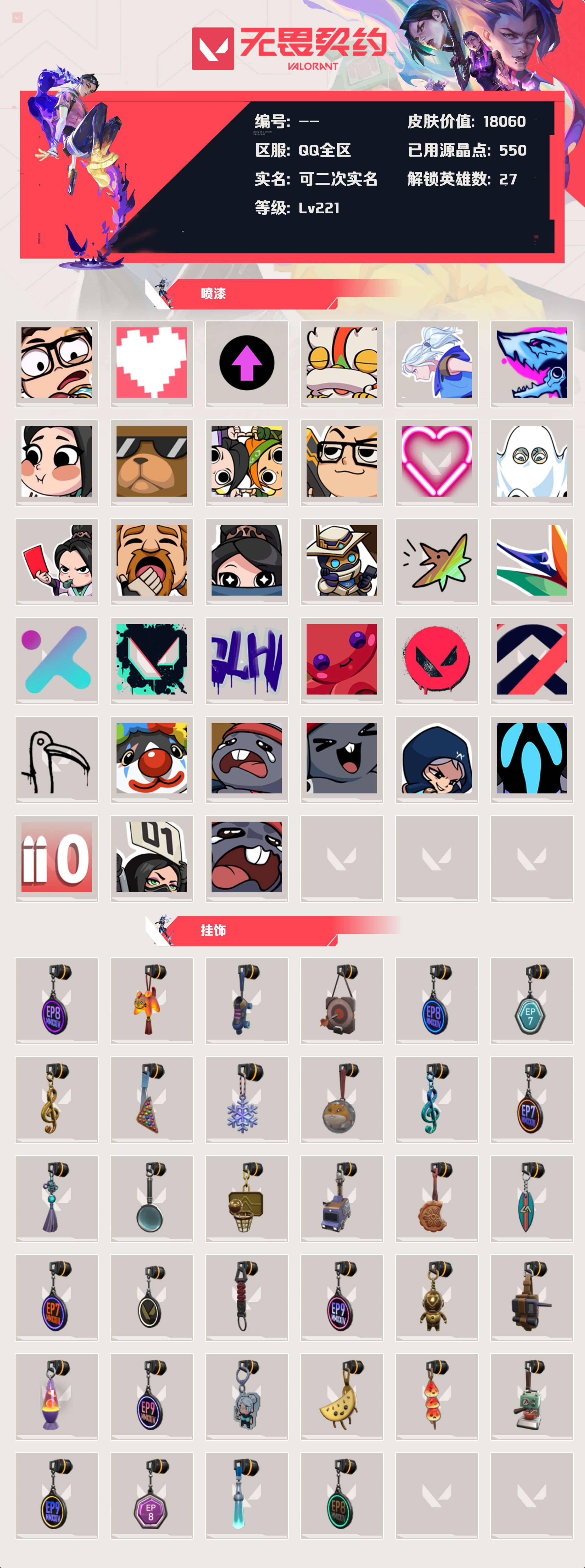 [13343898]等级:lv221 | 未定级/ 已用源晶点:550/ 皮肤价值:18060/ 英雄数:27/ 【英雄】 铁臂 捷风 雷兹 幽影 炼狱 不死鸟 贤者 猎枭 蝰蛇 零 芮娜 奇乐 斯凯 夜露 星礈 k/o 尚勃勒 霓虹 黑梦 海神 盖可 钢锁 壹决 暮蝶 维斯 钛狐 幻棱 【套装】 白日幻梦套装(白日幻梦撬棍) 机动狂飙套装(机动狂飙狂徒) 洪荒怒焰套装(洪荒怒焰狂徒) 耀鳞威龙(耀鳞威龙鬼魅) 浪漫雪国(浪漫雪国幻影) 混沌序曲 礼包(混沌序曲狂徒) 回响礼包 // v25 礼包(耀鳞威龙鬼魅) 西部未来 礼包(西部未来正义) 【佩呛 短炮】 短炮-弧光异彩 【近战武器】 近战武器-白日幻梦撬棍 【佩呛 鬼魅】 星云暗涌 鬼魅 鬼魅-流星兵团 鬼魅-耀鳞威龙 【佩呛 正义】 西部未来 正义 纳米打击 正义 正义-沙尘幻旅 超限闪存 正义 【佩呛 标配】 标配-闪耀之星 【步呛 幻影】 幻影-浪漫雪国 【步呛 狂徒】 狂徒-混沌序曲 狂徒-机动狂飙 狂徒-洪荒怒焰 【卡面】 精灵大战 南瓜盛典 终章:战术桌游 战术打碟 修车达人 正义的化身 终章:生意人麦宝 时间到 最高舞台 铁之华 声感陷阱设计图 梦幻奶茶 源能反应 零点嗅探设计图 逮到一个 清除名单 深海水族 《双城之战》金克丝 蝰蛇vs幽影 完美调谐 暗呛 别冒尖 终章:黑影先生的咖啡! "luie" 铁臂vs雷兹 夯实根基 热烈欢迎 铁臂设计图 归乡 军团 手臂摔跤 幽影行者 友军火力 宁静海岸 终章:不要松手 百弹不侵 纳米炸弹 弧光异彩 冰淇淋店 数码咒术 代号红色 冠军小队 爆弹机器人设计图 新兵报到 v契约 无畏契约 【喷漆】 新潮流 双击点赞 秘笈顺序 醒狮贺春 无畏契约go!第一卷:捷风 暴走萝莉 辣得好下饭 旅行小熊 又一个梦幻组合 是大风刮来的 蕊形灯 凌空惊吓 红牌退场 老铁困了 口袋贤者 拆弹陷阱 简笔画小队 纸鹤花 弧光异彩 胜利属于无畏契约 glhf 章鱼小弟 无畏契约 控场勿近 食腐鸟 小丑猫 熊抱 超级粉丝 捷风差距 惊声尖叫 拼一呛 我觉得不行 我的刀呢? 【挂饰】 第八季//第二幕 好运福爪 酷闪轮滑 瞄这里 第八季//第一幕 第七季:铂金 终章:高音谱号 彩糖面包 冬日絮语 蓄势待滚 高音谱号 第七季//第三幕 幸运中国结 案件调查 终章:空中接力 秘食餐车 中秋月饼 彩梦之城 第七季//第二幕 无畏契约 伞绳 第九季//第三幕 终章:k/o小金人 工具腰带 熔岩灯 第九季//第二幕 袖珍捷风 终章:这瓜保熟 糖葫芦 迷你浓缩 第九季//第一幕 第八季:钻石 荧光棒 第八季//第三幕