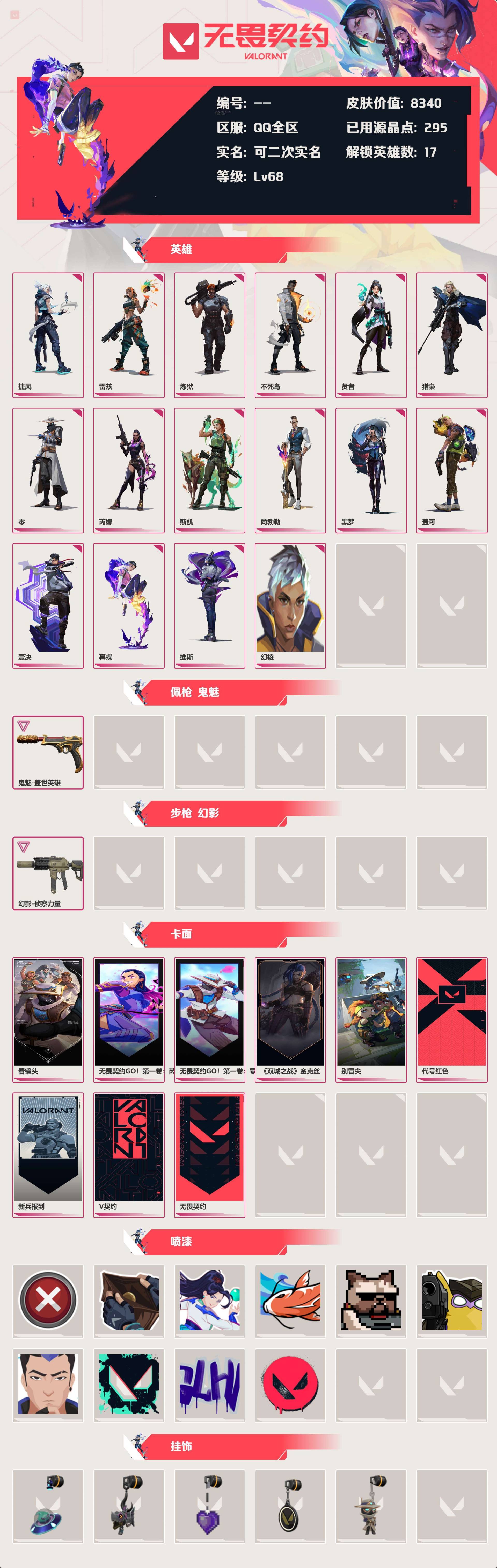 [13344002]等级:lv68 | 青铜i/ 已用源晶点:295/ 皮肤价值:8340/ 英雄数:17/ 【英雄】 捷风 雷兹 炼狱 不死鸟 贤者 猎枭 零 芮娜 斯凯 尚勃勒 黑梦 盖可 壹决 暮蝶 维斯 幻棱 【套装】 盖世英雄套装(盖世英雄鬼魅) 侦察力量(侦察力量幻影) 回响礼包 // v25 礼包(侦察力量幻影) 【佩呛 鬼魅】 鬼魅-盖世英雄 【步呛 幻影】 幻影-侦察力量 【卡面】 看镜头 无畏契约go!第一卷:芮娜 无畏契约go!第一卷:零 《双城之战》金克丝 别冒尖 代号红色 新兵报到 v契约 无畏契约 【喷漆】 买装还是存钱 囊中羞涩 无畏契约go!第一卷:贤者 红鳞 关门放狗 放下武器 智商200 胜利属于无畏契约 glhf 无畏契约 【挂饰】 天外飞客 鱼骨头 薰衣草之心 无畏契约 无畏契约go!第一卷