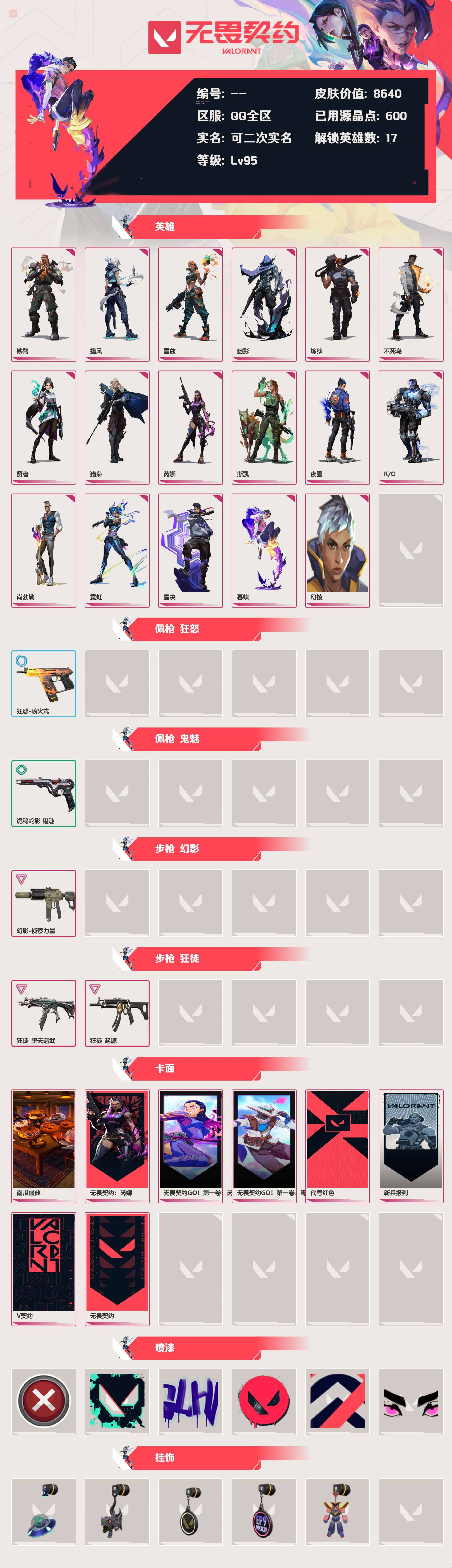 [13344188]等级:lv95 | 未定级/ 已用源晶点:600/ 皮肤价值:8640/ 英雄数:17/ 【英雄】 铁臂 捷风 雷兹 幽影 炼狱 不死鸟 贤者 猎枭 芮娜 斯凯 夜露 k/o 尚勃勒 霓虹 壹决 暮蝶 幻棱 【套装】 起源套装(起源狂徒) 堕天遗武套装(堕天遗武狂徒) 侦察力量(侦察力量幻影) 回响礼包 // v25 礼包(侦察力量幻影) 【佩呛 狂怒】 狂怒-喷火式 【佩呛 鬼魅】 诡秘蛇影 鬼魅 【步呛 幻影】 幻影-侦察力量 【步呛 狂徒】 狂徒-堕天遗武 狂徒-起源 【卡面】 南瓜盛典 无畏契约:芮娜 无畏契约go!第一卷:芮娜 无畏契约go!第一卷:零 代号红色 新兵报到 v契约 无畏契约 【喷漆】 买装还是存钱 胜利属于无畏契约 glhf 无畏契约 控场勿近 睥睨 【挂饰】 天外飞客 鱼骨头 无畏契约 第九季//第三幕 迷你机甲