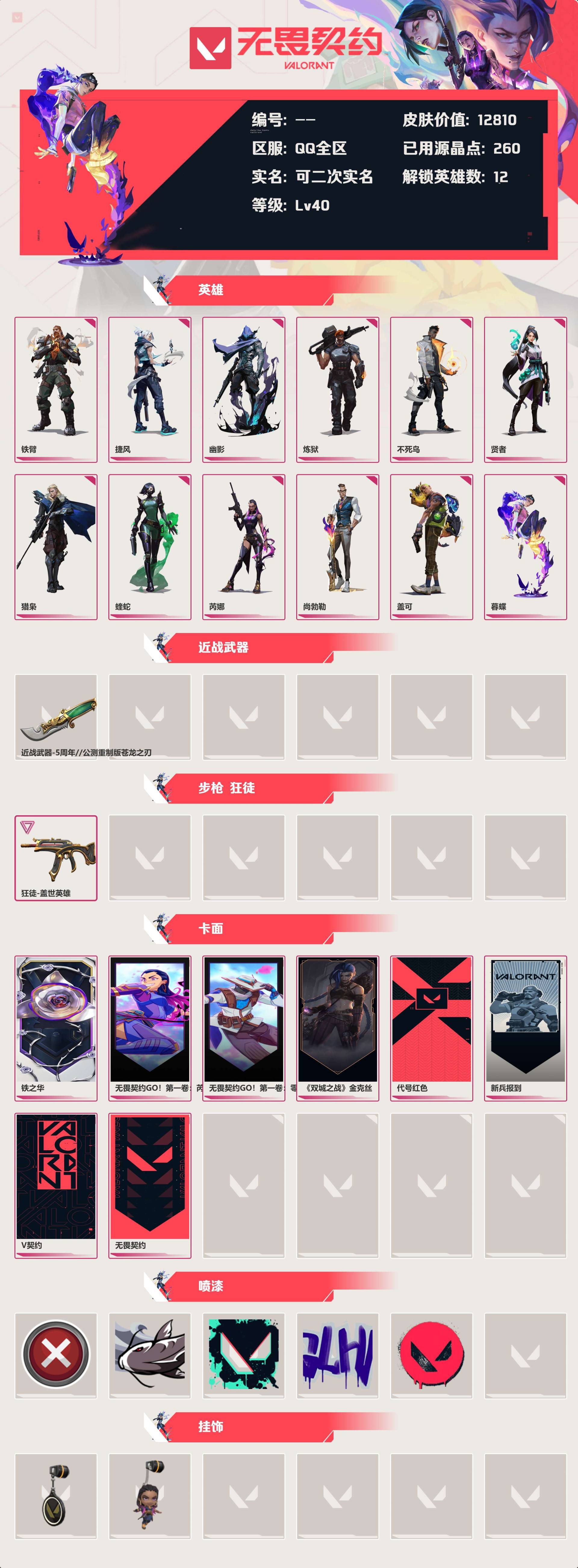 [13344607]等级:lv40 | 白银i/ 已用源晶点:260/ 皮肤价值:12810/ 英雄数:12/ 【英雄】 铁臂 捷风 幽影 炼狱 不死鸟 贤者 猎枭 蝰蛇 芮娜 尚勃勒 盖可 暮蝶 【套装】 盖世英雄套装(盖世英雄狂徒) 【近战武器】 近战武器-5周年//公测重制版苍龙之刃 【步呛 狂徒】 狂徒-盖世英雄 【卡面】 铁之华 无畏契约go!第一卷:芮娜 无畏契约go!第一卷:零 《双城之战》金克丝 代号红色 新兵报到 v契约 无畏契约 【喷漆】 买装还是存钱 松叶 胜利属于无畏契约 glhf 无畏契约 【挂饰】 无畏契约 无畏契约go!第一卷