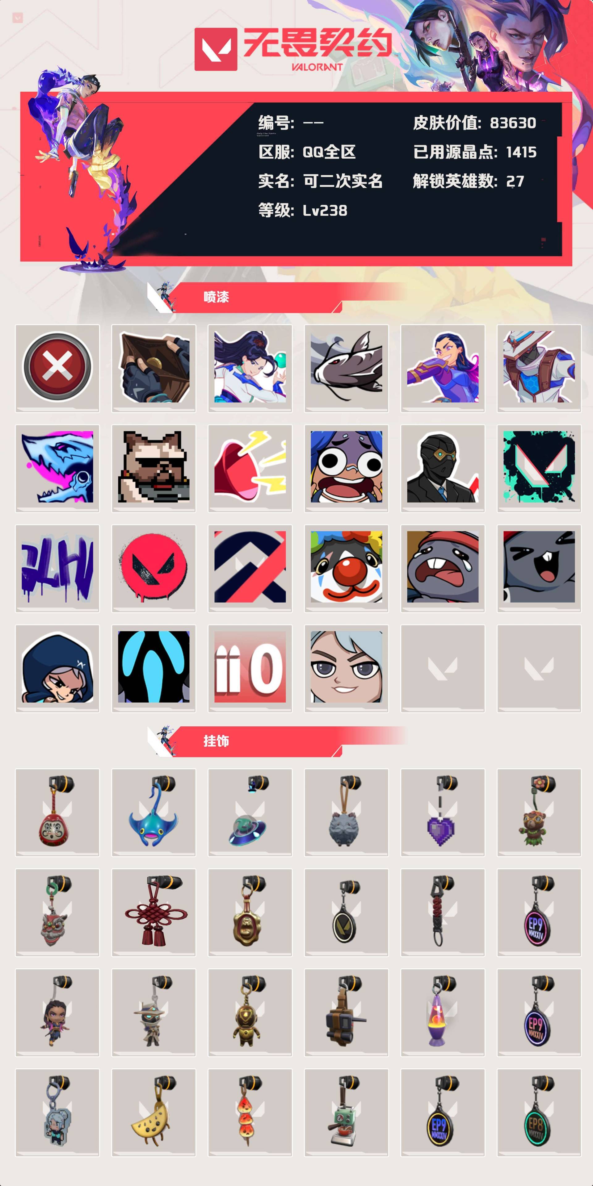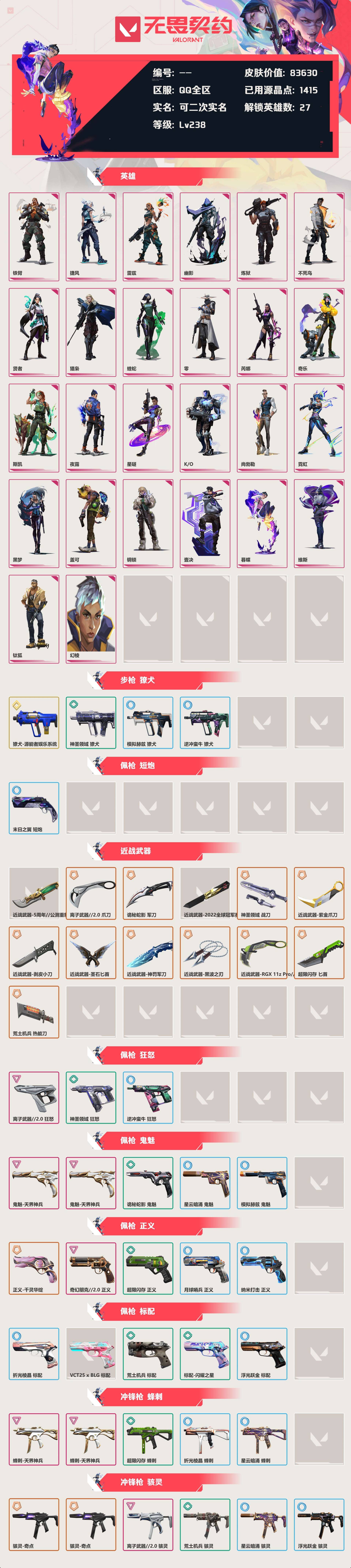 [13347227]等级:lv238 | 神话i/ 已用源晶点:1415/ 皮肤价值:83630/ 英雄数:27/ 【英雄】 铁臂 捷风 雷兹 幽影 炼狱 不死鸟 贤者 猎枭 蝰蛇 零 芮娜 奇乐 斯凯 夜露 星礈 k/o 尚勃勒 霓虹 黑梦 盖可 钢锁 壹决 暮蝶 维斯 钛狐 幻棱 【套装】 偃月苍龙套装(偃月苍龙狂徒) 盖亚的复仇套装(盖亚的复仇狂徒) 紫阙金琅套装(紫阙金琅狂徒) 天界神兵套装(天界神兵蜂刺天界神兵鬼魅) 盖世英雄套装(盖世英雄狂徒) 机动狂飙套装(机动狂飙狂徒) 塑水宗套装(黑波之刃) 堕天遗武套装(堕天遗武狂徒堕天遗武冥驹) 洪荒怒焰套装(洪荒怒焰狂徒) 异形猎人(剥皮小刀) rgx 11z pro//3.0(rgx11zpro//3.0莽侠rgx11zpro//3.0爪刀) 英雄之选 礼包(天界神兵鬼魅堕天遗武冥驹天界神兵蜂刺紫阙金琅狂徒) 全息波普//2.0(全息波普//2.0狂徒) 源能者娱乐系统(源能者娱乐系统獠犬) 离子武器(离子武器雄鹿) 艾沃莉的梦之翼(艾沃莉的梦之翼奥丁) 侦察力量(侦察力量幻影) 千灵华绽套装(千灵华绽幻影千灵华绽正义千灵华绽判官) 光明哨兵 礼包(光明哨兵狂徒) 光明哨兵//2.0(圣石匕首) 紫阙金琅//2.0(紫金爪刀) 混沌序曲 礼包(混沌序曲狂徒) 掠影 礼包(掠影狂徒掠影戍卫) 2022全球冠军赛套装(2022全球冠军赛蝴蝶刀2022全球冠军赛幻影) 回火礼包:奇点 礼包(奇点骇灵) 回响礼包 // v25 礼包(侦察力量幻影) 离子武器//2.0 礼包(离子武器//2.0狂徒离子武器//2.0骇灵离子武器//2.0狂怒离子武器//2.0战神离子武器//2.0爪刀) 奇幻朋克//2.0 礼包(奇幻朋克//2.0正义) rgx 11z pro//2.0 礼包(rgx11zpro//2.0幻影)
