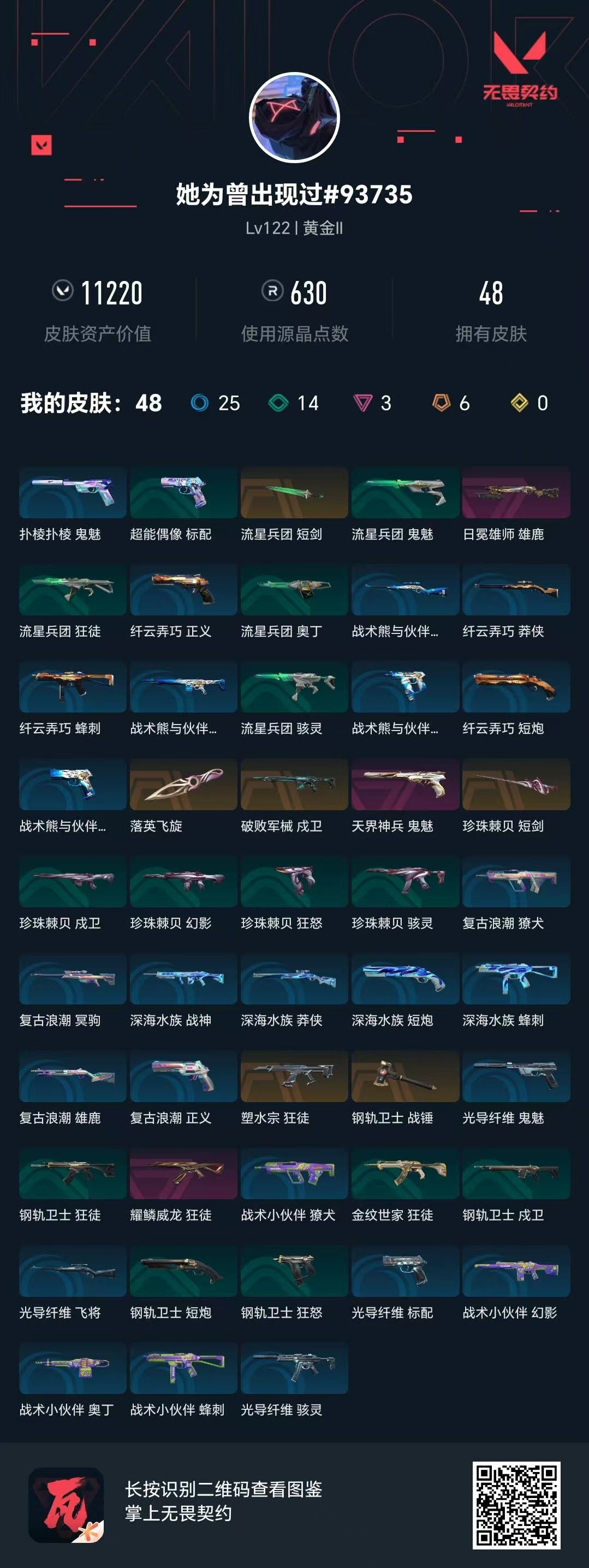 6橙皮 3紫皮 48皮肤 27英雄 72卡面 630已用源晶 未定级段位 【近战武器皮肤】:战锤-钢轨卫士短剑-流星兵团短剑-珍珠棘贝落英飞旋 【佩呛皮肤】:鬼魅-天界神兵 【霰弹呛皮肤】:雄鹿-日冕雄师 【步呛皮肤】:狂徒-塑水宗狂徒-耀鳞威龙戍卫-破败军械 【挂饰】:袖珍捷风挂饰传