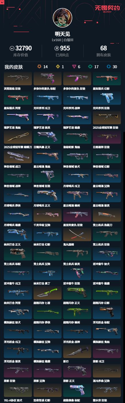 wl565qq区库存价值32790皮肤数量68卡面数量105喷漆数量88挂件数量70拥有套装2025全球冠军赛套装2025全球冠军赛狂徒2025全球冠军赛蝴蝶刀掠影套装掠影狂徒掠影冥驹掠影戍卫掠影正义影刃拥有近战武器神圣领域战刀荒土机兵热