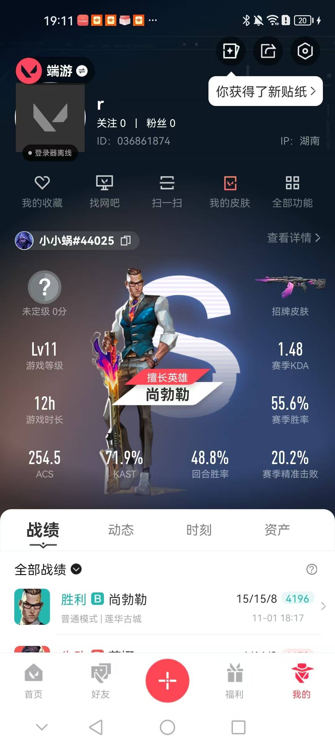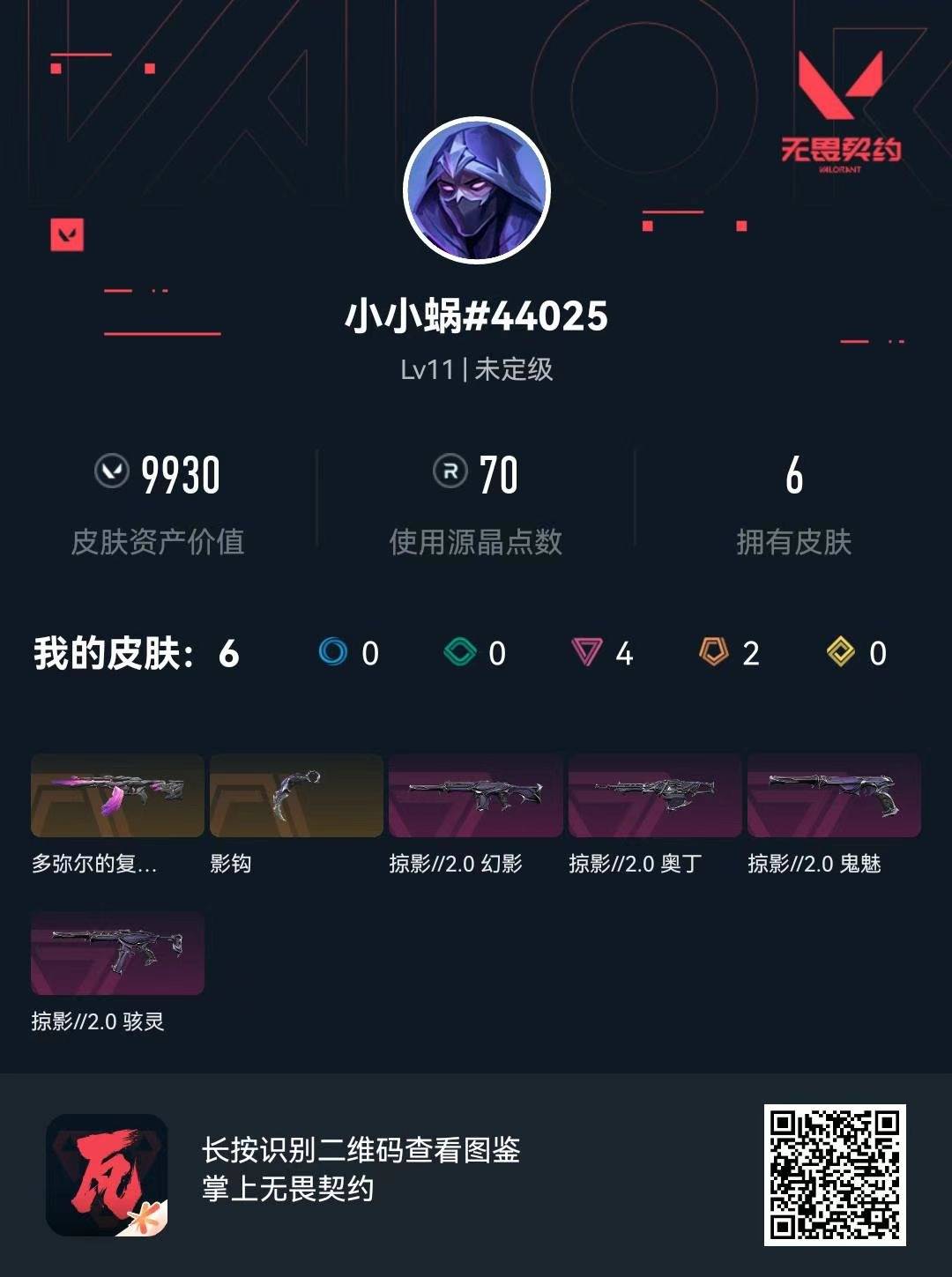 [13572178]2橙皮 4紫皮 6皮肤 7英雄 17卡面 70已用源晶 未定级段位 【套装】:掠影2.0套装 【近战武器皮肤】:影钩 【佩呛皮肤】:鬼魅-掠影2.0 【冲锋呛皮肤】:骇灵-掠影2.0 【步呛皮肤】:幻影-掠影2.0多弥尔的复仇 狂徒 【机呛皮肤】:奥丁-掠影2.0 【挂饰】:双城之战魄罗挂饰