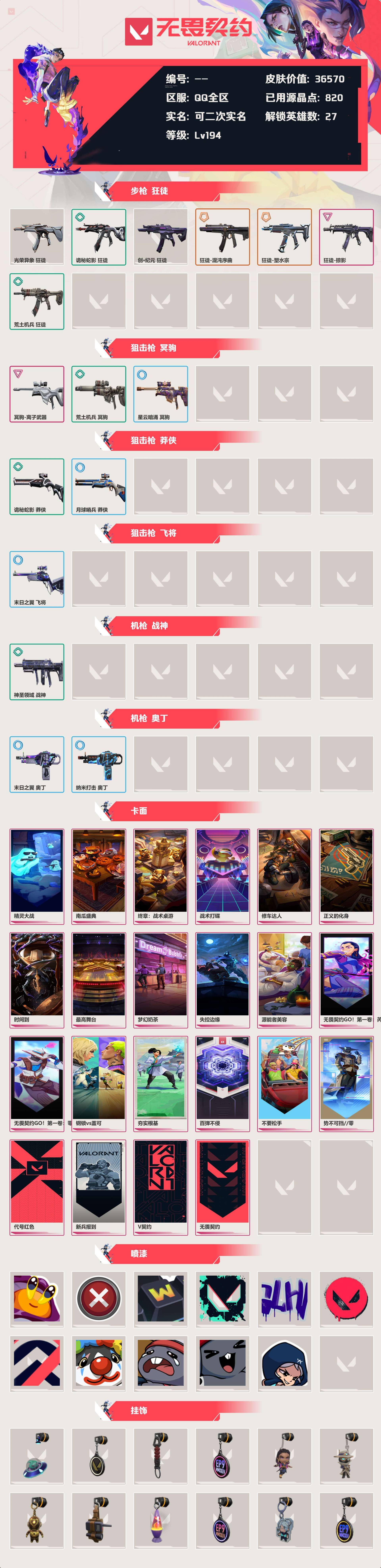 [12664893]等级:lv194 | 未定级/ 已用源晶点:820/ 皮肤价值:36570/ 英雄数:27/ 【英雄】 铁臂 捷风 雷兹 幽影 炼狱 不死鸟 贤者 猎枭 蝰蛇 零 芮娜 奇乐 斯凯 夜露 星礈 k/o 尚勃勒 霓虹 黑梦 海神 盖可 钢锁 壹决 暮蝶 维斯 钛狐 幻棱 【套装】 盖亚的复仇套装(盖亚的复仇鬼魅) 紫阙金琅套装(紫阙金琅标配) 塑水宗套装(塑水宗狂徒黑波之刃) 异形猎人(剥皮小刀) rgx 11z pro//3.0(rgx11zpro//3.0正义) 源能者娱乐系统(源能者娱乐系统鬼魅源能者娱乐系统獠犬) 离子武器(离子武器正义离子武器冥驹) 光明哨兵//2.0(光明哨兵//2.0幻影光明哨兵//2.0骇灵) 黯夜怪谈 礼包(黯夜怪谈幻影) 混沌序曲 礼包(混沌序曲狂徒) 掠影 礼包(掠影狂徒掠影戍卫) 回响礼包 // v25 礼包(紫阙金琅标配) 光荣异象 礼包(光荣异象狂徒) vct 2025 赛季 礼包(vct2025爪刀) 创·纪元 礼包(创·纪元狂徒) 【步呛 獠犬】 神圣领域 獠犬 逆冲蛮牛 獠犬 獠犬-源能者娱乐系统 【佩呛 短炮】 末日之翼 短炮