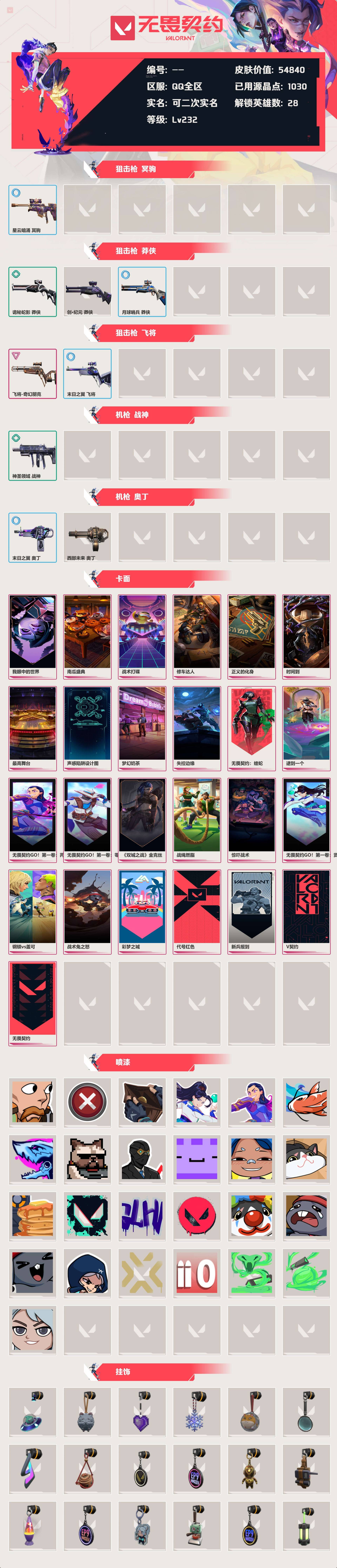 [13635138]等级:lv232 | 神话i/ 已用源晶点:1030/ 皮肤价值:54840/ 英雄数:28/ 【英雄】 铁臂 捷风 雷兹 幽影 炼狱 不死鸟 贤者 猎枭 蝰蛇 零 芮娜 奇乐 斯凯 夜露 星礈 k/o 尚勃勒 霓虹 黑梦 海神 盖可 钢锁 壹决 暮蝶 维斯 钛狐 幻棱 【套装】 偃月苍龙套装(偃月苍龙判官) 归零者套装(归零者短炮) 天界神兵套装(天玄刀) 日冕雄师(日冕雄师狂徒) 源能者危机001套装(源能者危机001幻影) 奇幻朋克套装(奇幻朋克飞将) 异形猎人(剥皮小刀) 全息波普//2.0(全息波普//2.0狂徒) 离子武器(离子武器正义) 侦察力量(侦察力量幻影) 紫阙金琅//2.0(紫金爪刀) 回火礼包:奇点 礼包(奇点正义) 回响礼包 // v25 礼包(侦察力量幻影) 光荣异象 礼包(光荣异象狂徒) rgx 11z pro 礼包(rgx11zpro狂徒) 离子武器//2.0 礼包(离子武器//2.0狂徒) 噬影者 礼包(噬影者戍卫) 虚空遗器 礼包(虚空遗器狂徒) 西部未来 礼包(西部未来奥丁) 创·纪元 礼包(创·纪元狂徒创·纪元正义创·纪元骇灵创·纪元莽侠镭切) 般若假面(般若假面幻影) 【步呛 獠犬】 神圣领域 獠犬 【佩呛 短炮】 末日之翼 短炮 短炮-蛇吻 短炮-归零者 【近战武器】 诡秘蛇影 军刀 神圣领域 战刀 镭切 近战武器-紫金爪刀 近战武器-剥皮小刀 近战武器-天玄刀 【佩呛 狂怒】 神圣领域 狂怒 【佩呛 鬼魅】 诡秘蛇影 鬼魅 星云暗涌 鬼魅