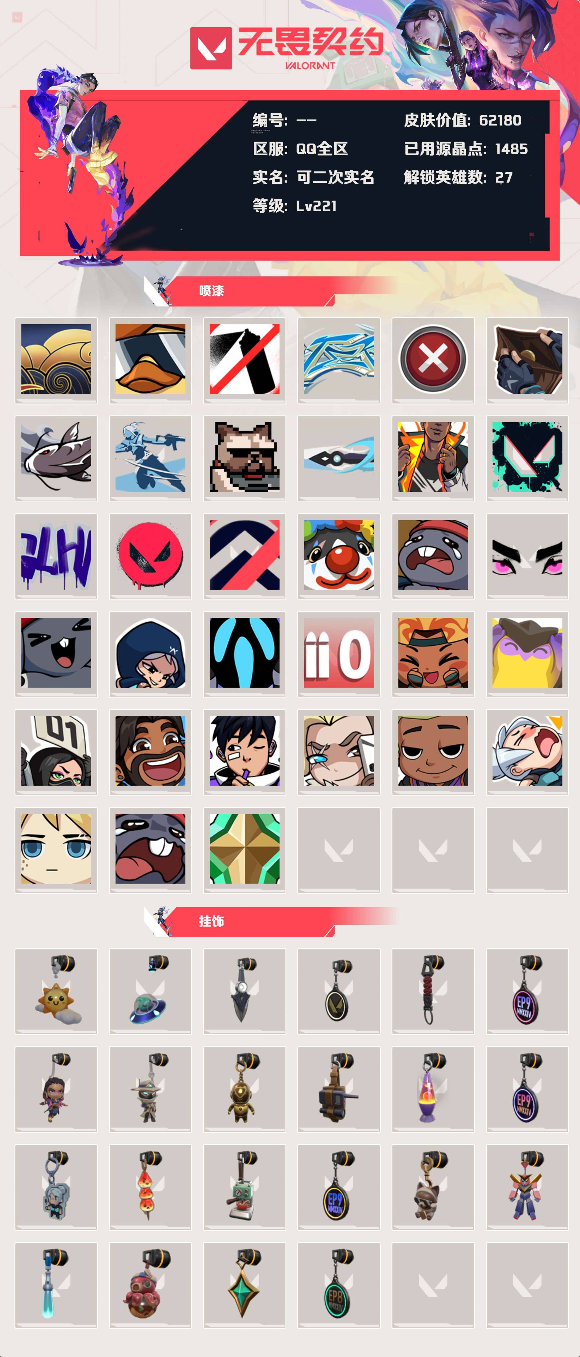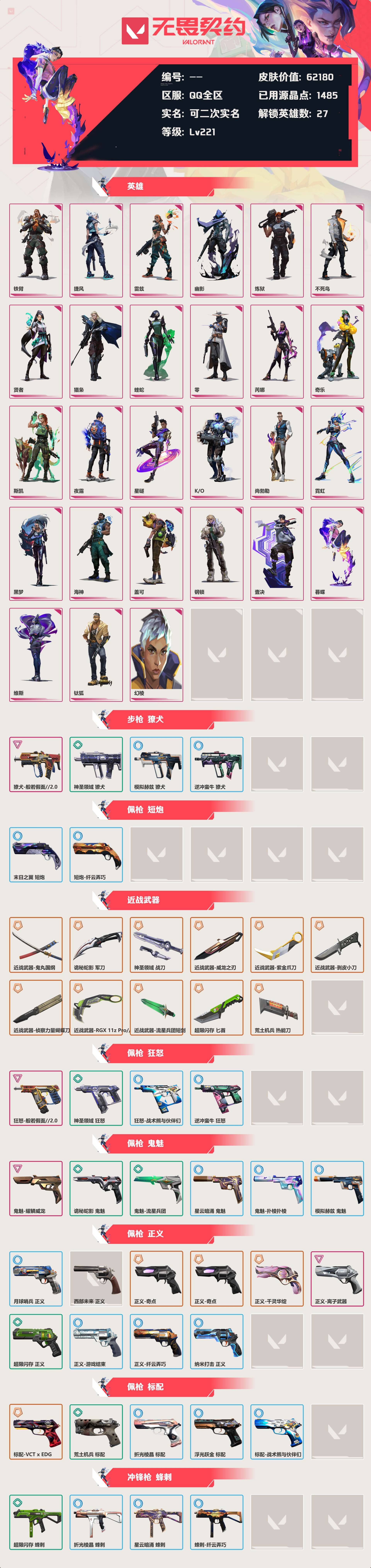 [13635415]等级:lv221 | 超凡ii/ 已用源晶点:1485/ 皮肤价值:62180/ 英雄数:27/ 【英雄】 铁臂 捷风 雷兹 幽影 炼狱 不死鸟 贤者 猎枭 蝰蛇 零 芮娜 奇乐 斯凯 夜露 星礈 k/o 尚勃勒 霓虹 黑梦 海神 盖可 钢锁 壹决 暮蝶 维斯 钛狐 幻棱 【套装】 盖亚的复仇套装(盖亚的复仇狂徒) 紫阙金琅套装(紫阙金琅狂徒) 塑水宗套装(塑水宗狂徒塑水宗骇灵塑水宗飞将) 堕天遗武套装(堕天遗武狂徒堕天遗武冥驹) 般若假面//2.0 礼包(般若假面//2.0狂徒般若假面//2.0战神般若假面//2.0狂怒般若假面//2.0獠犬鬼丸国纲) 异形猎人(剥皮小刀) rgx 11z pro//3.0(rgx11zpro//3.0爪刀) 天界神兵//2.0(天界神兵//2.0幻影) 耀鳞威龙(耀鳞威龙鬼魅威龙之刃) vctxedg 队伍礼包(vctxedg标配) 英雄之选 礼包(堕天遗武冥驹紫阙金琅狂徒) 离子武器(离子武器正义离子武器幻影) 艾沃莉的梦之翼(艾沃莉的梦之翼狂徒) 侦察力量(侦察力量幻影侦察力量蝴蝶刀) 千灵华绽套装(千灵华绽正义) 紫阙金琅//2.0(紫金爪刀) 混沌序曲 礼包(混沌序曲狂徒) 掠影 礼包(掠影狂徒掠影戍卫) 回火礼包:奇点 礼包(奇点正义) 回响礼包 // v25 礼包(侦察力量幻影耀鳞威龙鬼魅) rgx 11z pro 礼包(rgx11zpro狂徒) 虚空遗器 礼包(虚空遗器狂徒) 西部未来 礼包(西部未来正义) 异鳞魔蛇 礼包(异鳞魔蛇幻影) 【步呛 獠犬】 獠犬-般若假面//2.0 神圣领域 獠犬 模拟赫兹 獠犬 逆冲蛮牛 獠犬 【佩呛 短炮】 末日之翼 短炮 短炮-纤云弄巧 【近战武器】 近战武器-鬼丸国纲 诡秘蛇影 军刀 神圣领域 战刀 近战武器-威龙之刃 近战武器-紫金爪刀 近战武器-剥皮小刀 近战武器-侦察力量蝴蝶刀 近战武器-rgx 11z pro//3.0爪刀 近战武器-流星兵团短剑 超限闪存 匕首 荒土机兵 热能刀 【佩呛 狂怒】 神圣领域 狂怒 狂怒-般若假面//2.0 狂怒-战术熊与伙伴们 逆冲蛮牛 狂怒 【佩呛 鬼魅】 诡秘蛇影 鬼魅 星云暗涌 鬼魅 鬼魅-扑棱扑棱 模拟赫兹 鬼魅 鬼魅-流星兵团 鬼魅-耀鳞威龙 【佩呛 正义】 月球哨兵 正义 西部未来 正义 正义-游戏结束 正义-纤云弄巧 纳米打击 正义 超限闪存 正义 正义-离子武器 正义-奇点 正义-奇点 正义-千灵华绽 【佩呛 标配】 折光棱晶 标配 浮光跃金 标配 标配-战术熊与伙伴们 荒土机兵 标配 标配-vct x edg 【冲锋呛 蜂刺】 折光棱晶 蜂刺 星云暗涌 蜂刺 蜂刺-纤云弄巧 超限闪存 蜂刺 【