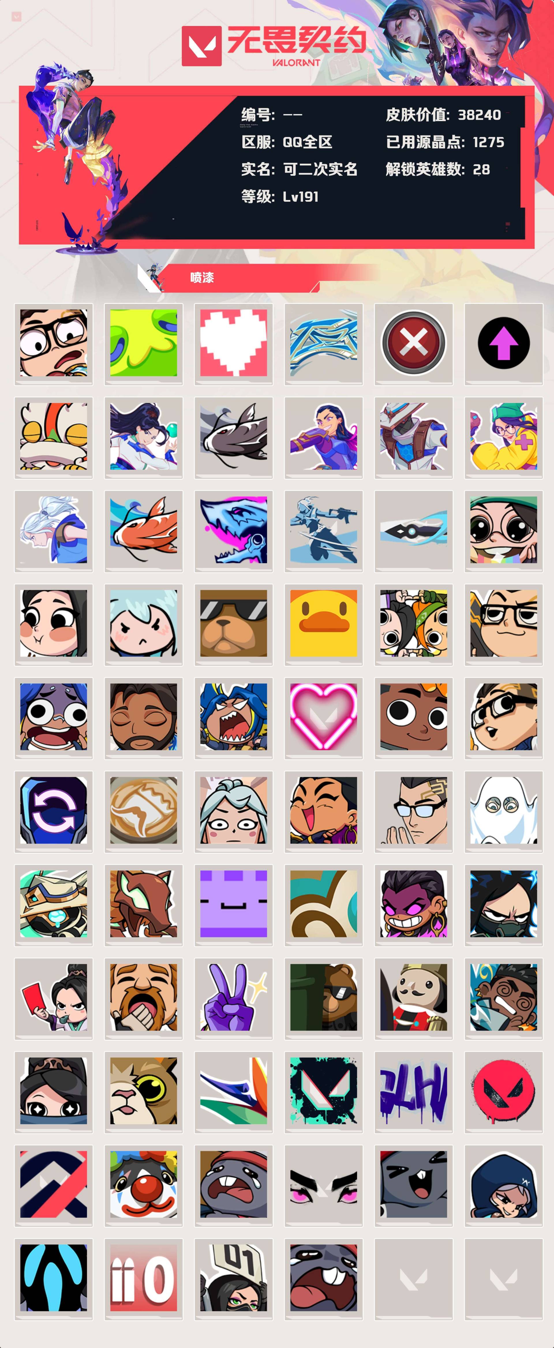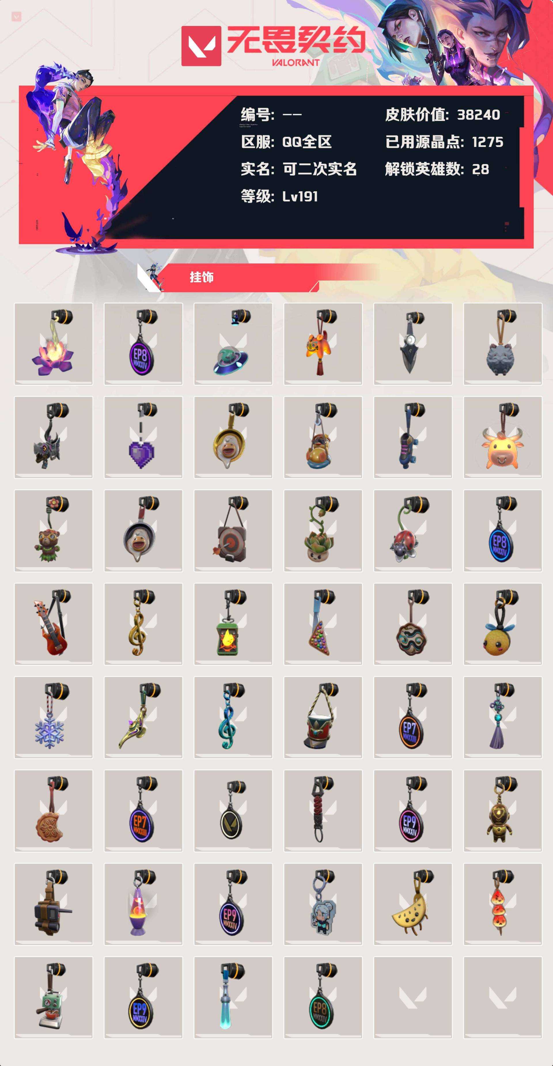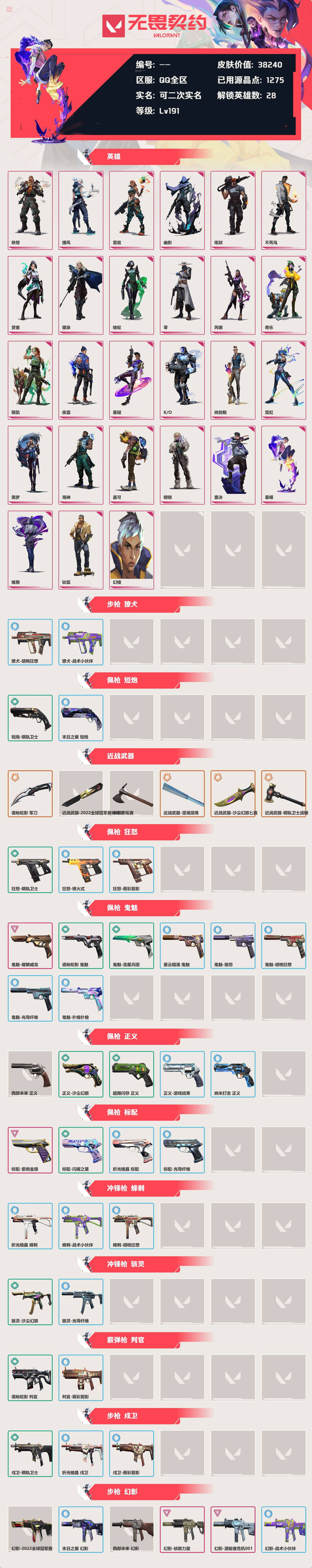 [13635545]等级:lv191 | 超凡iii/ 已用源晶点:1275/ 皮肤价值:38240/ 英雄数:28/ 【英雄】 铁臂 捷风 雷兹 幽影 炼狱 不死鸟 贤者 猎枭 蝰蛇 零 芮娜 奇乐 斯凯 夜露 星礈 k/o 尚勃勒 霓虹 黑梦 海神 盖可 钢锁 壹决 暮蝶 维斯 钛狐 幻棱 【套装】 盖亚的复仇套装(盖亚的复仇狂徒) 紫阙金琅套装(紫阙金琅狂徒紫阙金琅标配) 归零者套装(归零者狂徒) 日冕雄师(日冕雄师狂徒) 源能者危机001套装(源能者危机001幻影) 堕天遗武套装(堕天遗武狂徒) 洪荒怒焰套装(洪荒怒焰狂徒) 《双城之战》收藏套装 礼包(双城之战狂徒) 耀鳞威龙(耀鳞威龙鬼魅) 英雄之选 礼包(紫阙金琅狂徒) 离子武器(离子武器冥驹) 侦察力量(侦察力量幻影) 2022全球冠军赛套装(2022全球冠军赛蝴蝶刀2022全球冠军赛幻影) 回响礼包 // v25 礼包(紫阙金琅标配侦察力量幻影耀鳞威龙鬼魅) 光荣异象 礼包(光荣异象狂徒) rgx 11z pro 礼包(rgx11zpro狂徒) 西部未来 礼包(西部未来幻影西部未来飞将西部未来奥丁西部未来正义未来开拓者) 创·纪元 礼包(创·纪元狂徒) 【步呛 獠犬】 獠犬-胡桃狂想 獠犬-战术小伙伴 【佩呛 短炮】 末日之翼 短炮 短炮-钢轨卫士 【近战武器】 诡秘蛇影 军刀 近战武器-2022全球冠军赛蝴蝶刀 未来开拓者 近战武器-澄湖潋滟 近战武器-沙尘幻旅匕首 近战武器-钢轨卫士战锤 【佩呛 狂怒】 狂怒-喷火式 狂怒-萌彩剪影 狂怒-钢轨卫士 【佩呛 鬼魅】 诡秘蛇影 鬼魅 星云暗涌 鬼魅 鬼魅-宿怨 鬼魅-胡桃狂想 鬼魅-光导纤维 鬼魅-扑棱扑棱 鬼魅-流星兵团 鬼魅-耀鳞威龙 【佩呛 正义】 西部未来 正义 正义-游戏结束 纳米打击 正义 正义-沙尘幻旅 超限闪存 正义 【佩呛 标配】 折光棱晶 标配 标配-光导纤维 标配-闪耀之星 标配-紫阙金琅 【冲锋呛 蜂刺】 折光棱晶 蜂刺 蜂刺-战术小伙伴 蜂刺-胡桃狂想 【冲锋呛 骇灵】 骇灵-光导纤维 骇灵-沙尘幻旅 【霰弹呛 判官】 诡秘蛇影 判官 判官-萌彩剪影 【步呛 戍卫】 折光棱晶 戍卫 戍卫-萌彩剪影 戍卫-钢轨卫士 【步呛 幻影】 幻影-2022全球冠军赛 末日之翼 幻影 西部未来 幻影 幻影-战术小伙伴 幻影-侦察力量 幻影-源能者危机001 【步呛 狂徒】 rgx 11z pro 狂徒 光荣异象 狂徒 诡秘蛇影 狂徒 创·纪元 狂徒 狂徒-沙尘幻旅 狂徒-钢轨卫士 狂徒-日冕雄师 狂徒-紫阙金琅 狂徒-盖亚的复仇 狂徒-紫阙金琅 狂徒-堕天遗武 狂徒-双城之战 狂徒-归零者 狂徒-洪荒怒焰 【狙击呛 冥驹】 冥驹-胡桃狂想 冥驹-离子武器 【狙击呛 莽侠】 诡秘蛇影 莽侠