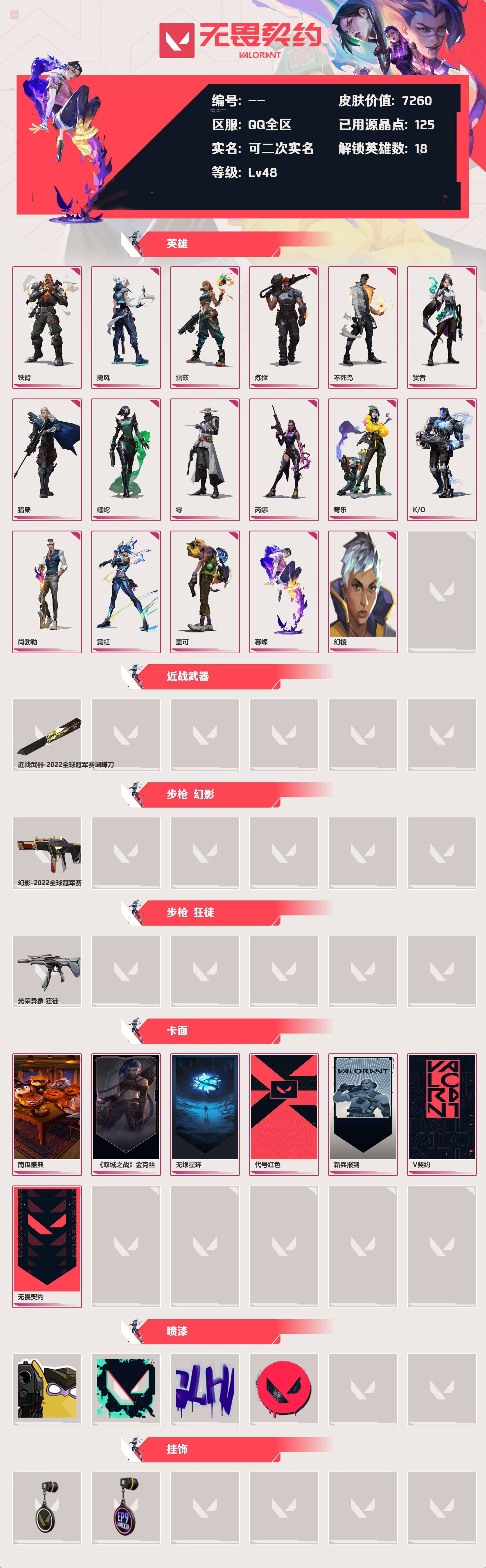 [13636107]等级:lv48 | 铂金ii/ 已用源晶点:125/ 皮肤价值:7260/ 英雄数:18/ 【英雄】 铁臂 捷风 雷兹 炼狱 不死鸟 贤者 猎枭 蝰蛇 零 芮娜 奇乐 k/o 尚勃勒 霓虹 盖可 暮蝶 幻棱 【套装】 2022全球冠军赛套装(2022全球冠军赛蝴蝶刀2022全球冠军赛幻影) 光荣异象 礼包(光荣异象狂徒) 【近战武器】 近战武器-2022全球冠军赛蝴蝶刀 【步呛 幻影】 幻影-2022全球冠军赛 【步呛 狂徒】 光荣异象 狂徒 【卡面】 南瓜盛典 《双城之战》金克丝 无垠星环 代号红色 新兵报到 v契约 无畏契约 【喷漆】 放下武器 胜利属于无畏契约 glhf 无畏契约 【挂饰】 无畏契约 第九季//第三幕