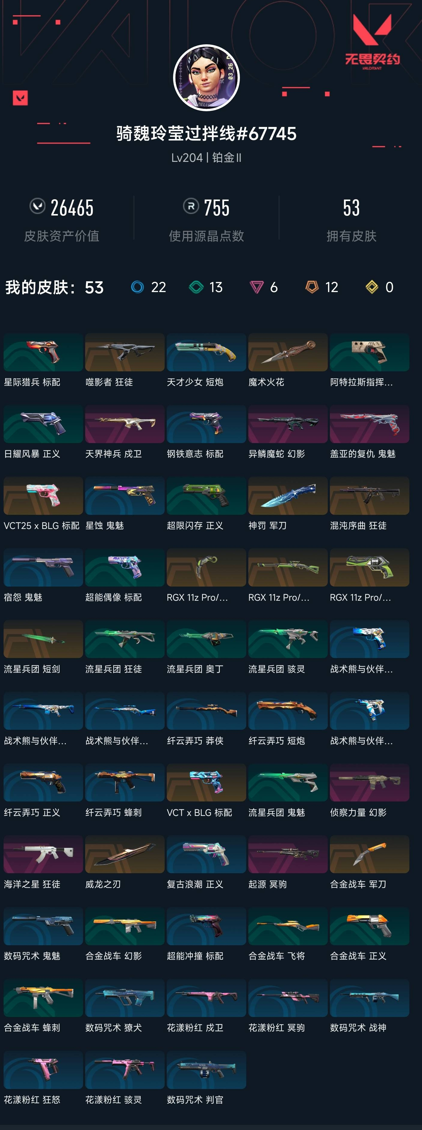【无畏契约】【yhwww5068】等级:204,已用无畏点26465,已用源晶点755,橙皮:标配-vct x blg|近战-rgx 11z pro3.0 爪刀|近战-流星兵团 短剑|近战-神罚 军刀|近战-威龙之刃|莽侠-rgx 11z pro3.0|狂徒-混沌序曲|正义-rgx 11z pro3.0|近战-合金战车 军刀|标配-vct25 x blg|狂徒-噬影者|近战-魔术火花__紫皮:鬼魅-盖亚的复仇|幻影-侦察力量|狂徒-海洋之星|戍卫-天界神兵|冥驹-起源|幻影-异鳞魔蛇__蓝皮:正义-复古浪潮|标配-超能冲撞|短炮-天才少女|狂怒-花漾粉红|骇灵-花漾粉红|戍卫-花漾粉红|冥驹-花漾粉红|战神-数码咒术|獠犬-数码咒术|判官-数码咒术|鬼魅-数码咒术|鬼魅-宿怨|鬼魅-星蚀|标配-钢铁意志|莽侠-纤云弄巧|正义-纤云弄巧|短炮-纤云弄巧|蜂刺-纤云弄巧|飞将-战术熊与伙伴们|狂怒-战术熊与伙伴们|戍卫-战术熊与伙伴们|标配-战术熊与伙伴们|标配-阿特拉斯指挥部__段位:铂金__绿皮:蜂刺-合金战车|正义-合金战车|幻影-合金战车|飞将-合金战车|标配-超能偶像|正义-超限闪存|骇灵-流星兵团|鬼魅-流星兵团|狂徒-流星兵团|奥丁-流星兵团|正义-日耀风暴|标配-星际猎兵__英雄:尚勃勒|维斯|黑梦|斯凯|暮蝶|盖可|霓虹|壹决|星礈|k/o|幽影|夜露|钢锁|海神|奇乐|炼狱|铁臂|贤者|猎枭|钛狐|芮娜|零|捷风|蝰蛇|不死鸟|幻棱|雷兹
