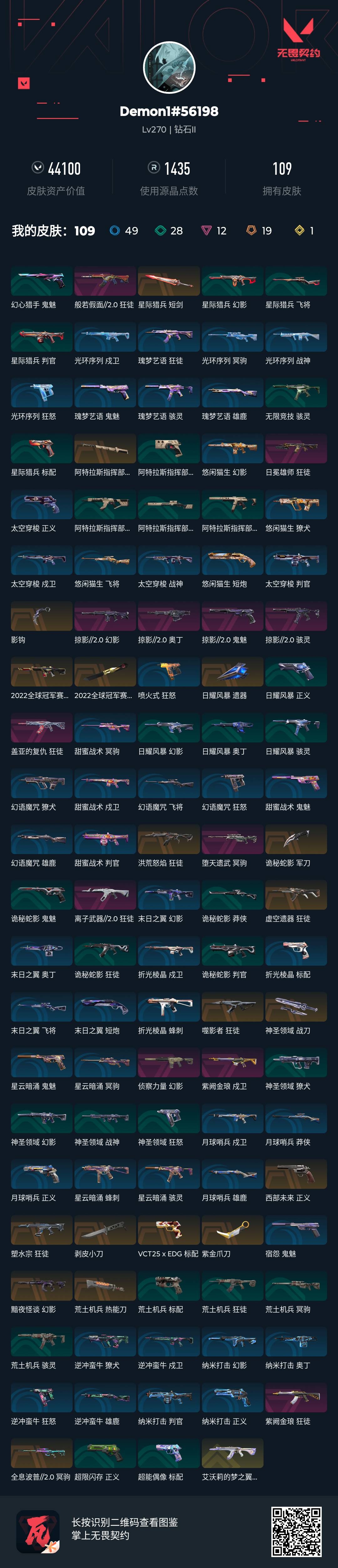 [13661150]q191816 (掠影//2.0套装/2022全球冠军赛套装)无畏契约/等级270/段位钻石2/英雄28/皮肤109资产44100/已使用r点1435/剩余r点0/掠影//2.0-幻影掠影//2.0-奥丁掠影//2.0-骇灵掠影//2.0-鬼魅影钩,2022全球冠军赛-幻影2022全球冠军赛-蝴蝶刀,星际猎兵-短剑,阿特拉斯指挥部-甩棍,日耀风暴-遗器,诡秘蛇影-军刀,神圣领域-战刀,荒土机兵-热能刀,紫金爪刀,剥皮小刀,虚空遗器-狂徒,噬影者-狂徒,黯夜怪谈-幻影,洪荒怒焰-狂徒,塑水宗-狂徒,艾沃莉的梦之翼-狂徒,离子武器//2.0-狂徒,般若假面//2.0-狂徒,紫阙金琅-戍卫,紫阙金琅-狂徒,盖亚的复仇-狂徒,侦察力量-幻影,日冕雄师-狂徒,全息波普//2.0-冥驹,堕天遗武-冥驹,vct25-x-edg-标配,西部未来-正义
