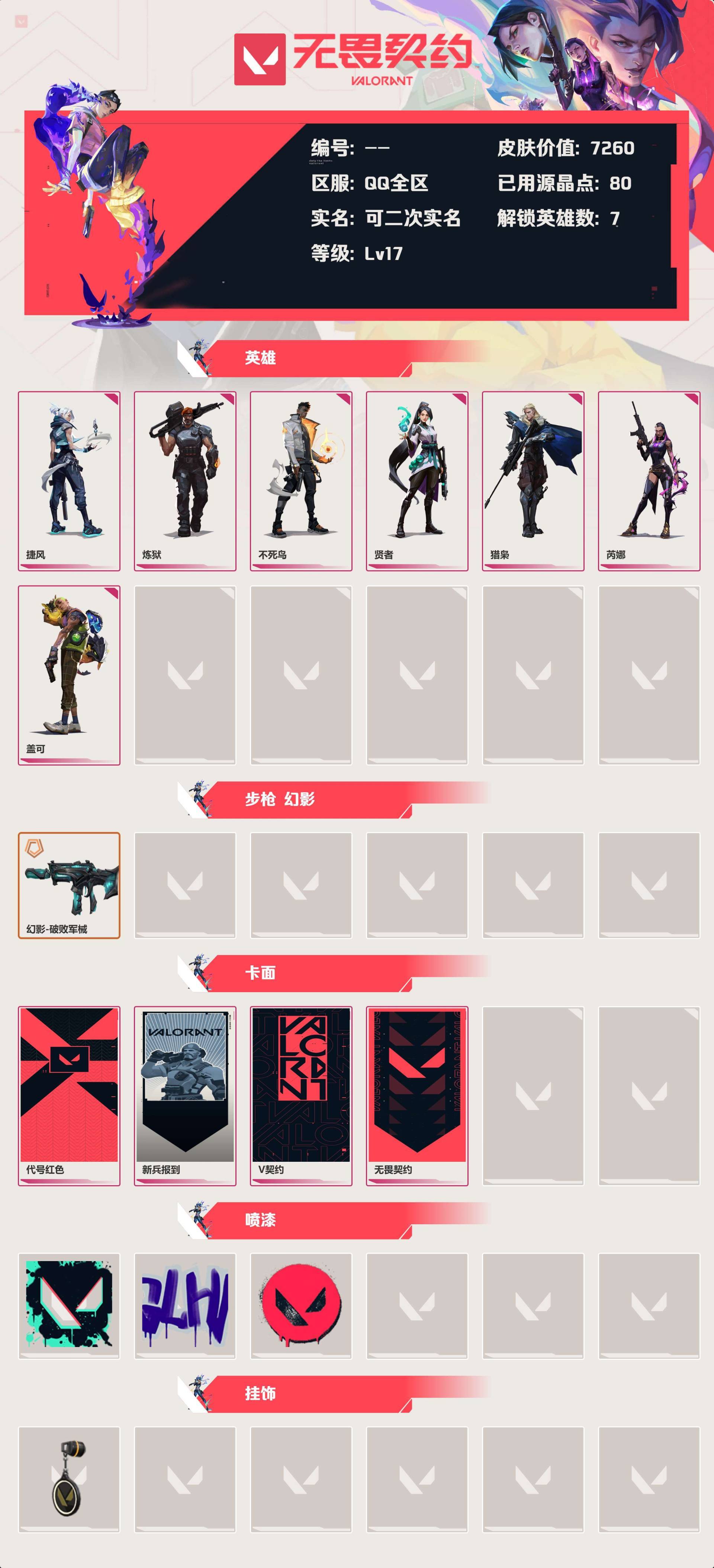 [13667167]等级:lv17 | 未定级/ 已用源晶点:80/ 皮肤价值:7260/ 英雄数:7/ 【英雄】 捷风 炼狱 不死鸟 贤者 猎枭 芮娜 盖可 【套装】 破败军械套装(破败军械幻影) 【步呛 幻影】 幻影-破败军械 【卡面】 代号红色 新兵报到 v契约 无畏契约 【喷漆】 胜利属于无畏契约 glhf 无畏契约 【挂饰】 无畏契约