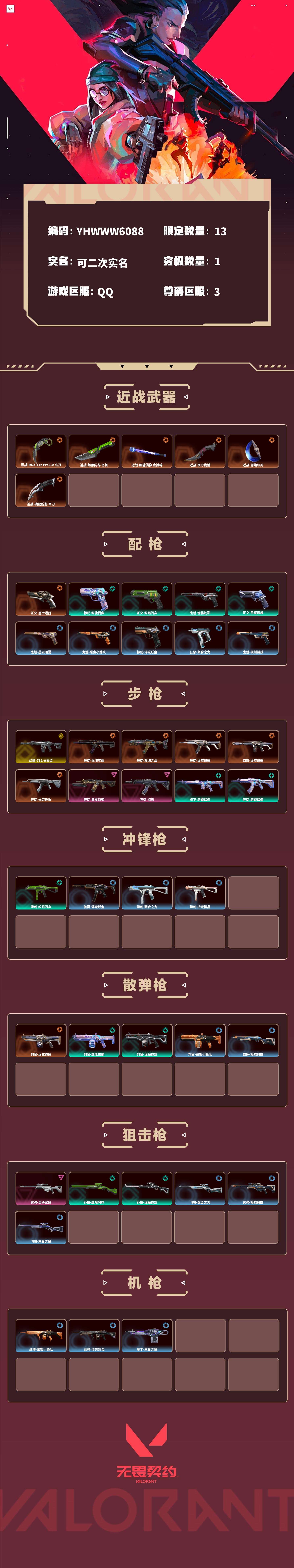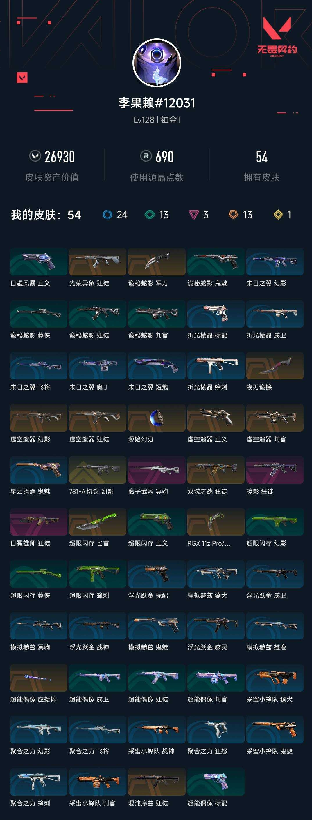 【无畏契约】【yhwww6088】等级:128,已用无畏点26930,已用源晶点690,金皮:幻影-781-a协议__橙皮:近战-rgx 11z pro3.0 爪刀|近战-超限闪存 匕首|近战-超能偶像 应援棒|近战-夜刃诡镰|狂徒-混沌序曲|狂徒-双城之战|正义-虚空遗器|判官-虚空遗器|狂徒-虚空遗器|幻影-虚空遗器|近战-源始幻刃|近战-诡秘蛇影 军刀|狂徒-光荣异象__紫皮:狂徒-日冕雄师|冥驹-离子武器|狂徒-掠影__段位:铂金__蓝皮:鬼魅-星云暗涌|鬼魅-采蜜小蜂队|战神-采蜜小蜂队|獠犬-采蜜小蜂队|判官-采蜜小蜂队|骇灵-浮光跃金|标配-浮光跃金|戍卫-浮光跃金|战神-浮光跃金|蜂刺-聚合之力|幻影-聚合之力|狂怒-聚合之力|飞将-聚合之力|鬼魅-模拟赫兹|獠犬-模拟赫兹|冥驹-模拟赫兹|雄鹿-模拟赫兹|蜂刺-折光棱晶|戍卫-折光棱晶|标配-折光棱晶|飞将-末日之翼|幻影-末日之翼|短炮-末日之翼|奥丁-末日之翼__绿皮:戍卫-超能偶像|标配-超能偶像|狂徒-超能偶像|判官-超能偶像|正义-超限闪存|莽侠-超限闪存|幻影-超限闪存|蜂刺-超限闪存|判官-诡秘蛇影|鬼魅-诡秘蛇影|莽侠-诡秘蛇影|狂徒-诡秘蛇影|正义-日耀风暴__英雄:尚勃勒|维斯|黑梦|斯凯|暮蝶|盖可|霓虹|壹决|星礈|k/o|幽影|夜露|钢锁|海神|奇乐|炼狱|铁臂|贤者|猎枭|钛狐|芮娜|零|捷风|蝰蛇|不死鸟|幻棱|雷兹|禁灭