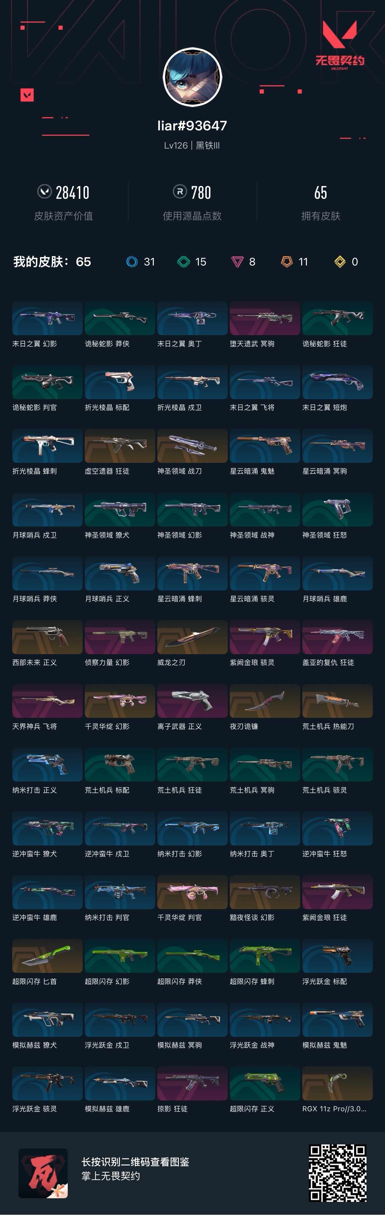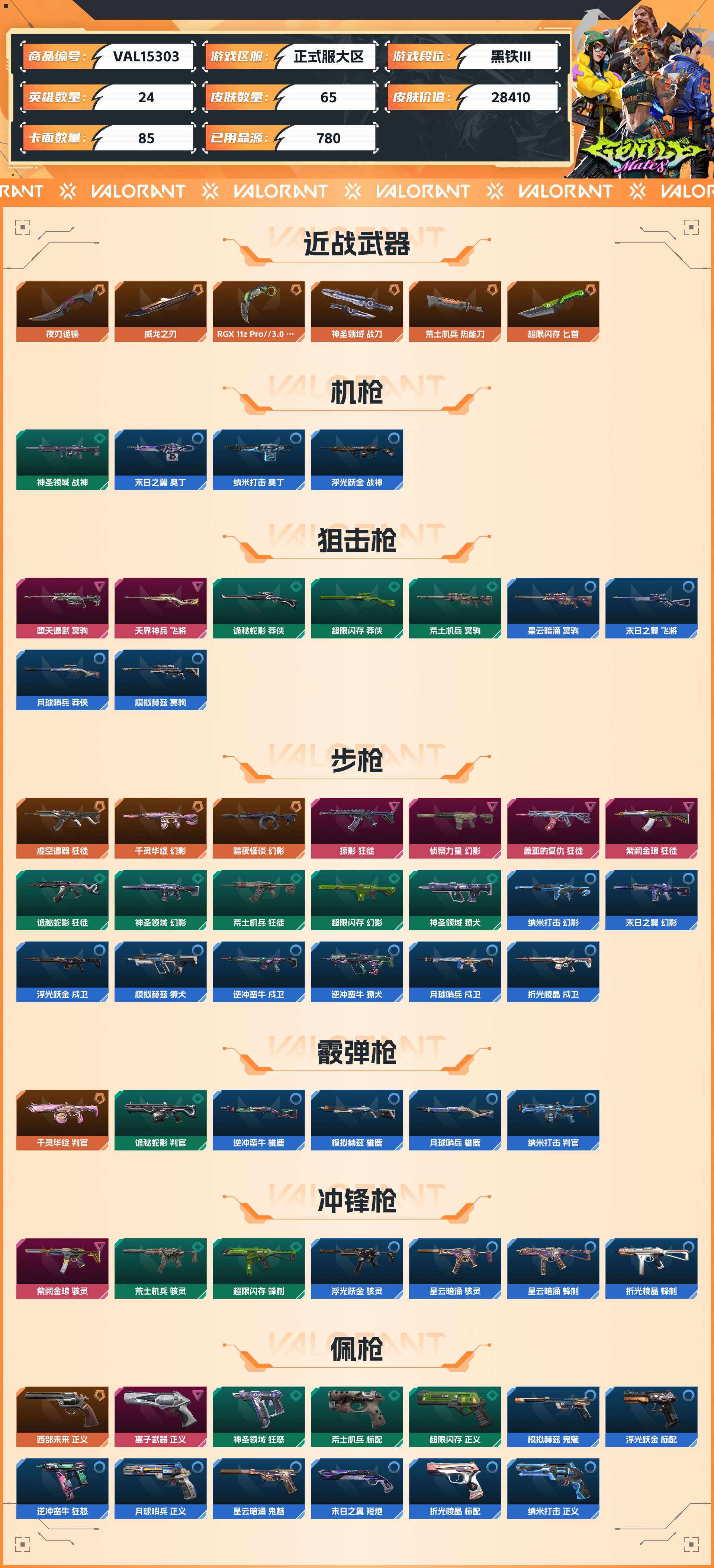 val15303|黑铁iii 皮肤价值28410 已用晶源780 皮肤数量65 限定11 卓越8 奢华15 精选31【拥有皮肤】夜刃诡镰威龙之刃rgx 11z pro//3.0 爪刀神圣领域 战刀荒土机兵 热能