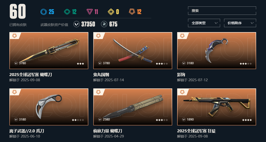 【游戏等级】lv83 【段位】 未定级 【r点】675 【皮肤总价值】37350 【英雄数量】14 【皮肤数量】60 【挂饰数量】50 【卡面数量】74 【喷漆数量】67 【獠犬】獠犬-日冕雄师 獠犬-悠闲猫生 獠犬-幻语魔咒 【标配】标配-vct25xprx 标配-星际猎兵 标配-阿特拉斯指挥部 【近战武器】近战武器-星际猎兵短剑 近战武器-2025全球冠军赛蝴蝶刀 近战