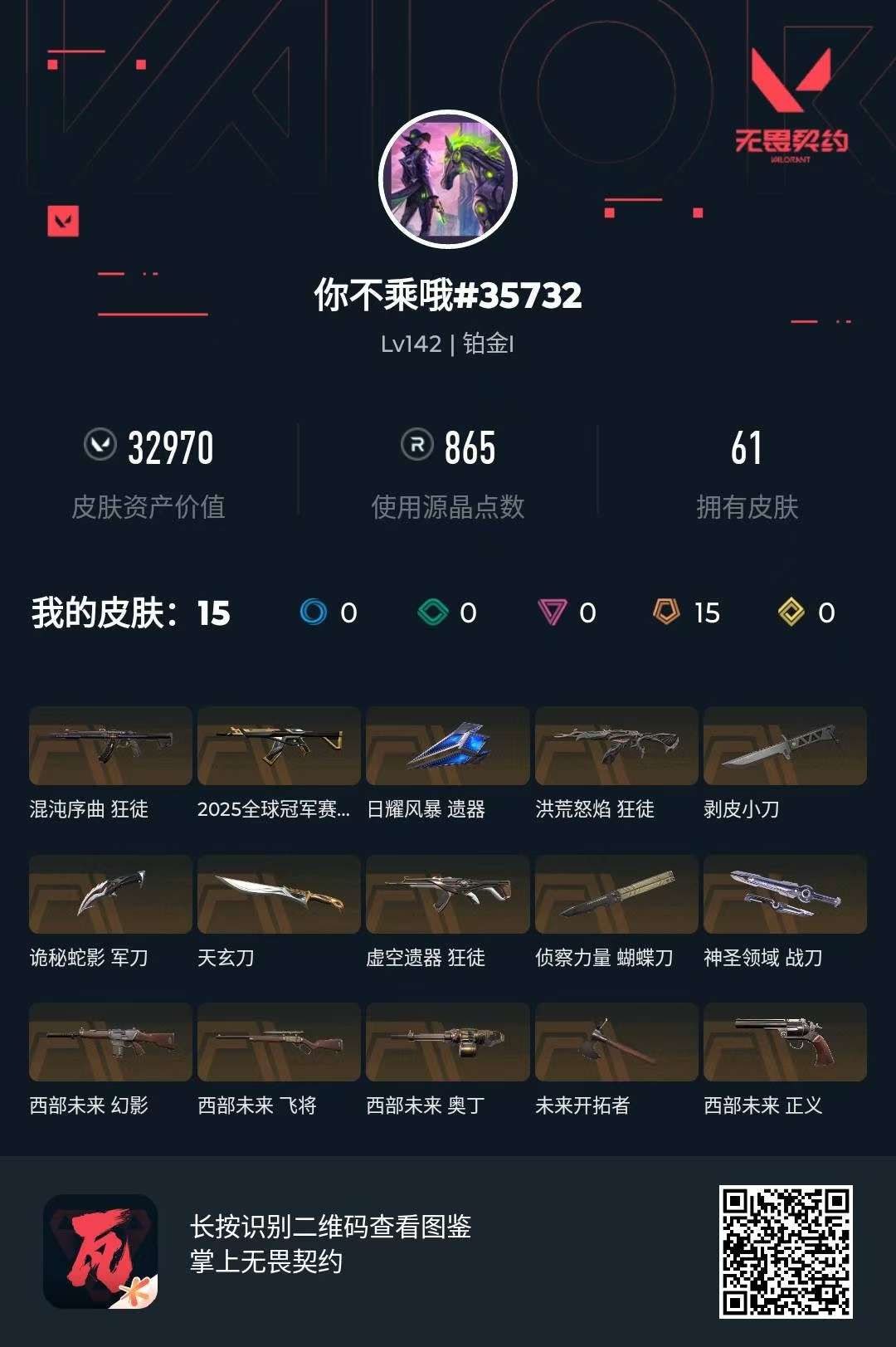 [13745942]s191875(西部未来套装)无畏契约/142等级/铂金段位/27英雄/61皮肤/资产32970/已使用r点865/剩余r点10/ 虚空遗器-狂徒,混沌序曲-狂徒,洪荒怒焰-狂徒,2025全球冠军赛-狂徒,离子武器//2.0-狂徒,紫阙金琅-狂徒,盖亚的复仇-狂徒,侦察力量-幻影,耀鳞威龙-狂徒-,掠影-戍卫,日耀风暴-遗器,诡秘蛇影-军刀,神圣领域-战刀,天玄刀,剥皮小刀,侦察力量-蝴蝶刀,西部未来-幻影西部未来-奥丁西部未来-飞将西部未来-正义未来开拓者,耀鳞威龙-鬼魅