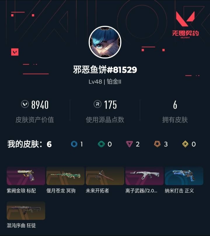【无畏契约】【yhwww6118】等级:48,已用无畏点8940,已用源晶点175,橙皮:狂徒-混沌序曲|冥驹-偃月苍龙|近战-未来开拓者__紫皮:标配-紫阙金琅|狂徒-离子武器2.0__段位:铂金__蓝皮:正义-纳米打击__英雄:暮蝶|盖可|霓虹|星礈|炼狱|贤者|猎枭|芮娜|捷风|不死鸟|幻棱|禁灭
