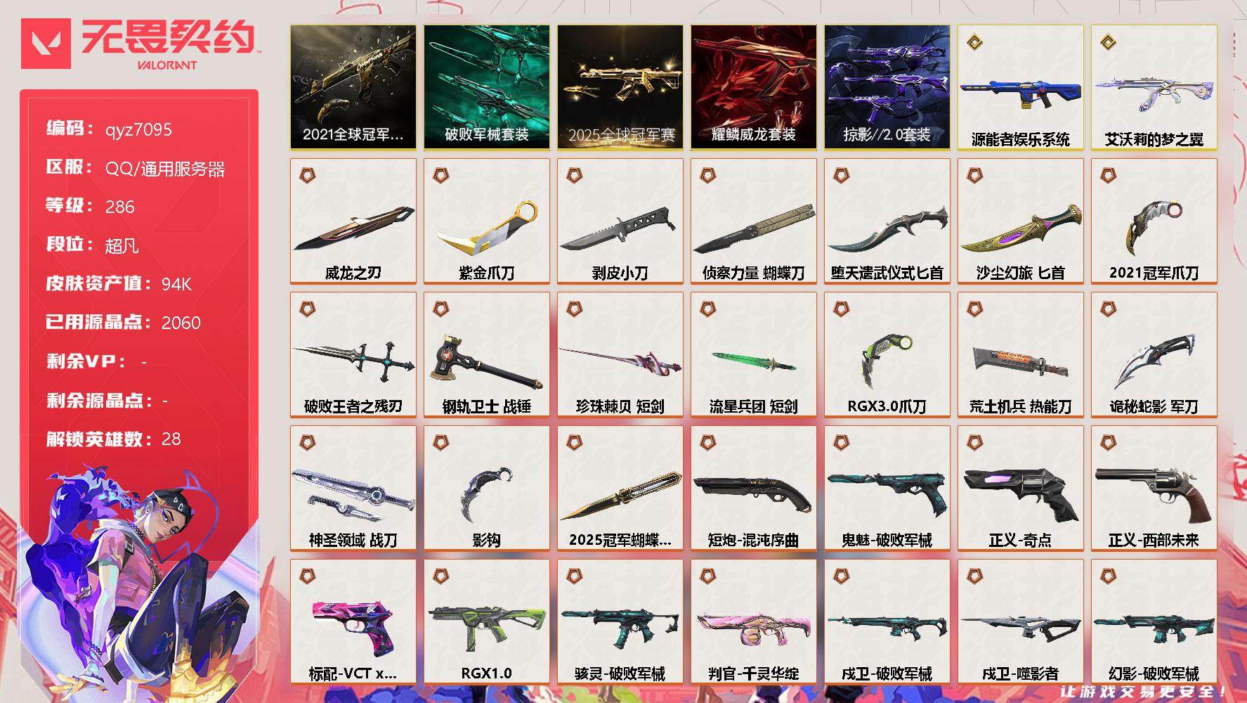 21/25精品限定号-qyz7095-亮点皮肤:-狂徒-2021全球冠军赛爪刀-2021全球冠军赛-套装:-2021全球冠军赛套装破败军械套装耀鳞威龙套装掠影20套装-近战武器皮肤:-蝴蝶刀-侦察力量匕首-沙尘幻旅剥皮小刀紫金爪刀破败王者之残刃威龙之刃堕天遗武-仪式匕首短剑-珍珠棘贝落英飞旋爪刀-rgx-11z-pro-30短剑-流星兵团战锤-钢轨卫士荒土机兵热能刀神圣领域-战刀诡秘蛇影影钩-步呛皮肤:-狂徒-紫阙金琅狂徒-盖亚的复仇幻影-侦察力量狂徒-机动狂飙戍卫-破败军械幻影-破败军械狂徒-塑水宗狂徒-耀鳞威龙狂徒-堕天遗武狂徒-海洋之星幻影-源能者娱乐系统獠犬-日冕雄师狂徒-艾沃莉的梦之翼狂徒-混沌序曲狂徒-创纪元幻影-异鳞魔蛇狂徒-噬影者戍卫-噬影者幻影-掠影20-佩呛皮肤:-正义-奇点鬼魅-破败军械鬼魅-耀鳞威龙标配-vctxprx短炮-混沌序曲正义-西部未来鬼魅-掠影20-狙击呛皮肤:-冥驹-归零者飞将-塑水宗冥驹-堕天遗武冥驹-千灵华绽冥驹-离子武器莽侠-归零者//20-冲锋呛皮肤:-骇灵-破败军械蜂刺-rgx-11z-pro骇灵-掠影20-霰弹呛皮肤:-判官-千灵华绽-机呛皮肤:-战神-奇点奥丁-掠影20-亮点:-【qyz7095】21/25精品限定号-qyz7095-亮点皮肤:-狂徒-2021全球冠军赛爪刀-2021全球冠军赛-套装:-2021全球冠军赛套装破败军械套装耀鳞威龙套装掠影20套装-近战武器皮肤:-蝴蝶刀-侦察力量匕首-沙尘幻旅剥皮小刀紫金爪刀破败王者之残刃威龙之刃堕天遗武-仪式匕首短剑-珍珠棘贝落英飞旋爪刀-rgx-11z-pro-30短剑-流星兵团战锤-钢轨卫士荒土机兵热能刀神圣领域-战刀诡秘蛇影影钩-步呛皮肤:-狂徒-紫阙金琅狂徒-盖亚的复仇幻影-侦察力量狂徒-机动狂飙戍卫-破败军械幻影-破败军械狂徒-塑水宗狂徒-耀鳞威龙狂徒-堕天遗武狂徒-海洋之星幻影-源能者娱乐系统獠犬-日冕雄师狂徒-艾沃莉的梦之翼狂徒-混沌序曲狂徒-创纪元幻影-异鳞魔蛇狂徒-噬影者戍卫-噬影者幻影-掠影20-佩呛皮肤:-正义-奇点鬼魅-破败军械鬼魅-耀鳞威龙标配-vctxprx