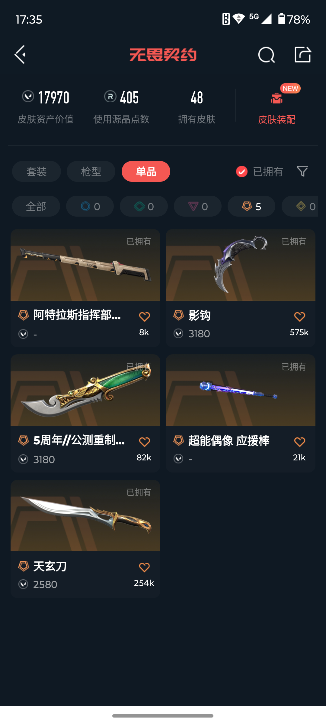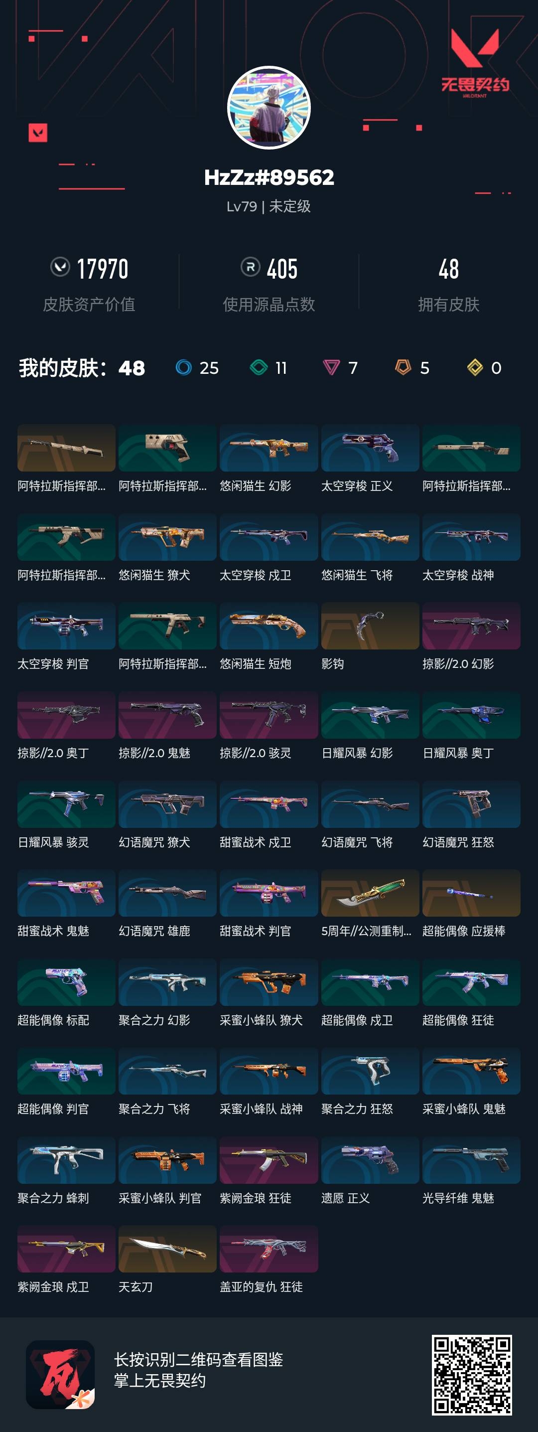 [13856350]q191316 (掠影//2.0套装)无畏契约/等级79/段位未定级/英雄22/皮肤48/资产17970/已使用r点405/剩余r点355/掠影//2.0-幻影掠影//2.0-奥丁掠影//2.0-骇灵掠影//2.0-鬼魅影钩,阿特拉斯指挥部-甩棍,5周年//公测重制版-苍龙之刃,超能偶像-应援棒,天玄刀,紫阙金琅-狂徒,紫阙金琅-戍卫,盖亚的复仇-狂徒,