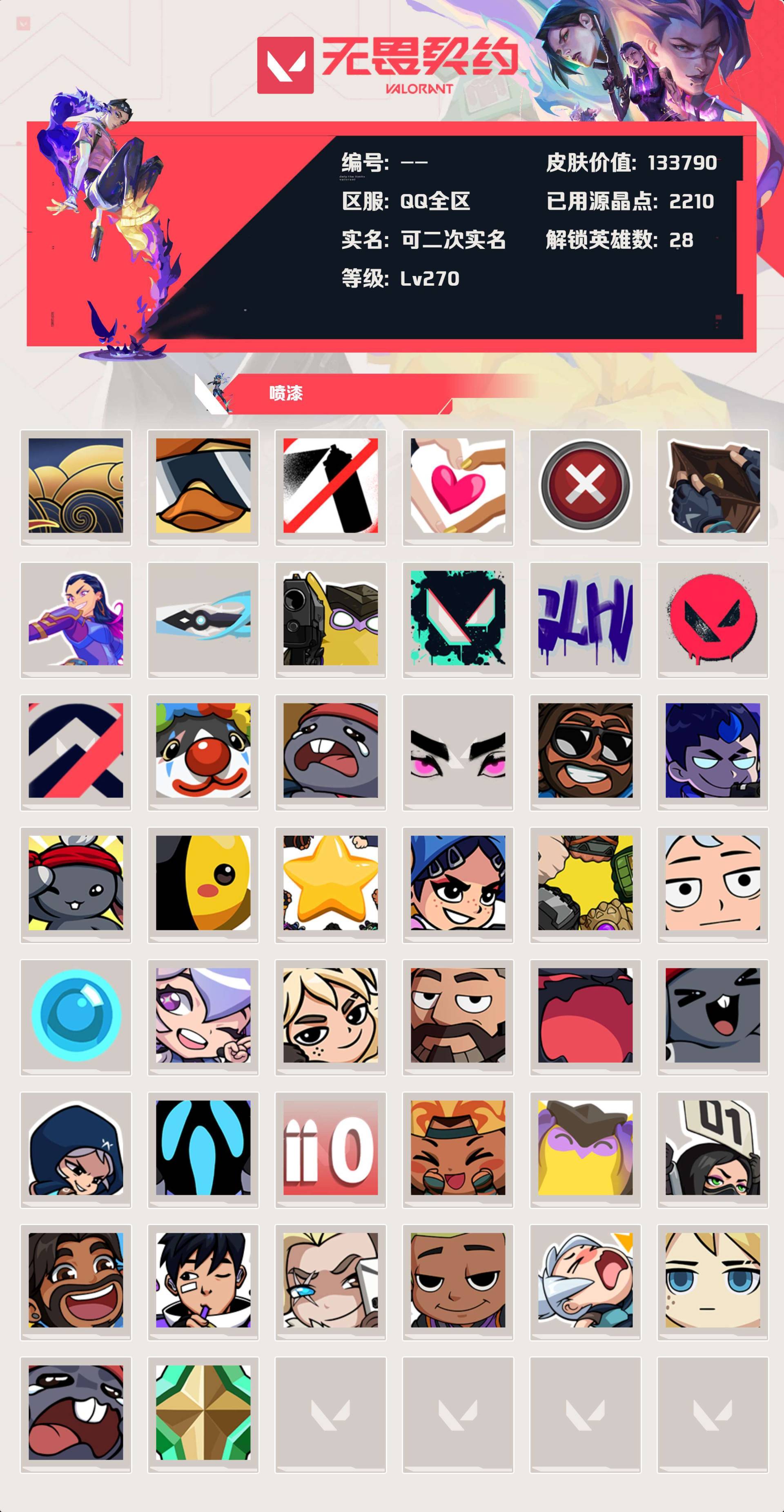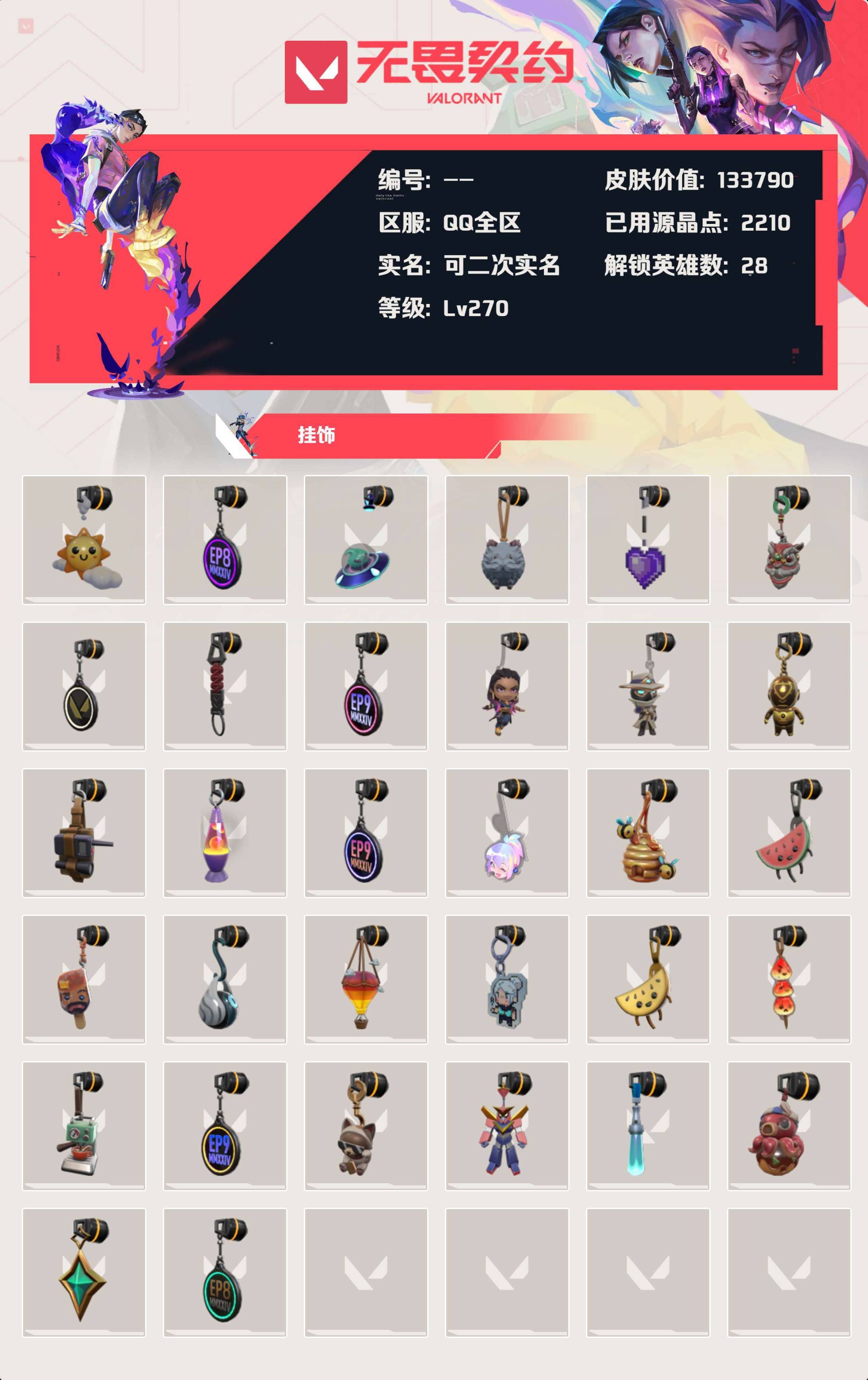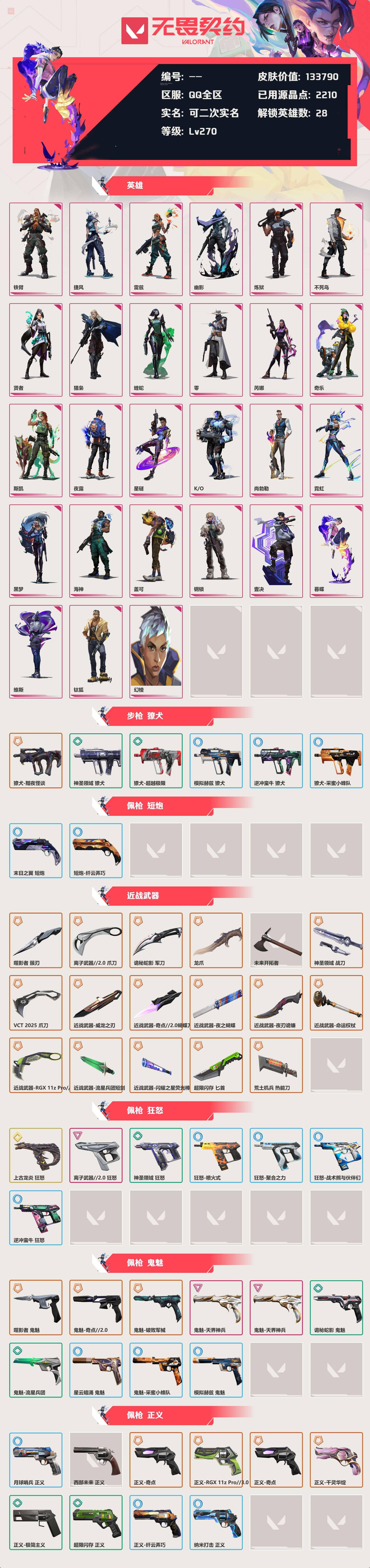 [13861898]等级:lv270 | 钻石ii/ 已用源晶点:2210/ 皮肤价值:133790/ 英雄数:28/ 【英雄】 铁臂 捷风 雷兹 幽影 炼狱 不死鸟 贤者 猎枭 蝰蛇 零 芮娜 奇乐 斯凯 夜露 星礈 k/o 尚勃勒 霓虹 黑梦 海神 盖可 钢锁 壹决 暮蝶 维斯 钛狐 幻棱 【套装】 盖亚的复仇套装(盖亚的复仇戍卫盖亚的复仇狂徒盖亚的复仇飞将) 紫阙金琅套装(紫阙金琅狂徒) 归零者套装(归零者狂徒归零者冥驹) 天界神兵套装(天界神兵鬼魅) 盖世英雄套装(盖世英雄狂徒) 破败军械套装(破败军械鬼魅) 塑水宗套装(塑水宗狂徒) 日冕雄师(日冕雄师狂徒) 781-a协议套装(781-a协议幻影) 洪荒怒焰套装(洪荒怒焰狂徒) 超越极限(超越极限獠犬) 橙色疾影(橙色疾影幻影) rgx 11z pro//3.0(rgx11zpro//3.0莽侠rgx11zpro//3.0正义rgx11zpro//3.0爪刀) 《双城之战》收藏套装 礼包(双城之战狂徒) 命运之手(命运权杖) 极简主义(极简主义正义极简主义骇灵极简主义幻影极简主义冥驹极简主义战神) 耀鳞威龙(威龙之刃) 英雄之选 礼包(天界神兵鬼魅紫阙金琅狂徒) 巨神铁甲(巨神铁甲狂徒) 无畏契约go!第二卷(夜之蝴蝶) 海洋之星(海洋之星狂徒) 离子武器(离子武器冥驹) 侦察力量(侦察力量幻影) 千灵华绽套装(千灵华绽正义) 光明哨兵//2.0(光明哨兵//2.0幻影) 紫阙金琅//2.0(紫阙金琅//2.0奥丁紫阙金琅//2.0雄鹿) 黯夜怪谈 礼包(黯夜怪谈幻影黯夜怪谈飞将黯夜怪谈标配黯夜怪谈獠犬夜刃诡镰) 混沌序曲 礼包(混沌序曲狂徒) 奇点//2.0 礼包(奇点//2.0狂徒奇点//2.0鬼魅奇点//2.0蝴蝶刀) 掠影 礼包(掠影狂徒) 2022全球冠军赛套装(2022全球冠军赛幻影) 回火礼包:奇点 礼包(奇点//2.0狂徒奇点//2.0鬼魅奇点//2.0蝴蝶刀奇点幻影奇点正义奇点骇灵) 回响礼包 // v25 礼包(侦察力量幻影冰点凝冻狂徒) 光荣异象 礼包(光荣异象狂徒) 荒狼之颚 礼包(荒狼之颚狂徒) 离子武器//2.0 礼包(离子武器//2.0狂徒离子武器//2.0骇灵离子武器//2.0狂怒离子武器//2.0战神离子武器//2.0爪刀) 噬影者 礼包(噬影者狂徒噬影者鬼魅噬影者戍卫噬影者蜂刺噬影者簇刃) vct 2025 赛季 礼包(vct2025爪刀) 西部未来 礼包(西部未来幻影西部未来飞将西部未来奥丁西部未来正义未来开拓者) 上古龙炎 礼包(上古龙炎狂徒上古龙炎冥驹上古龙炎狂怒上古龙炎判官龙爪) 【步呛 獠犬】 神圣领域 獠犬 模拟赫兹 獠犬 逆冲蛮牛 獠犬 獠犬-采蜜小蜂队 獠犬-超越极限 獠犬-黯夜怪谈 【佩呛 短炮】 末日之翼 短炮 短炮-纤云弄巧 【近战武器】 噬影者 簇刃 离子武器//2.0 爪刀 诡秘蛇影 军刀 龙爪 未来开拓者 神圣领域 战刀 vct 2025 爪刀 近战武器-威龙之刃 近战武器-奇点//2.0蝴蝶刀 近战武器-夜之蝴蝶 近战武器-夜刃诡镰 近战武器-命运权杖 近战武器-rgx 11z pro//3.0爪刀 近战武器-流星兵团短剑 近战武器-闪耀之星荧光棒 超限闪存 匕首 荒土机兵 热能刀