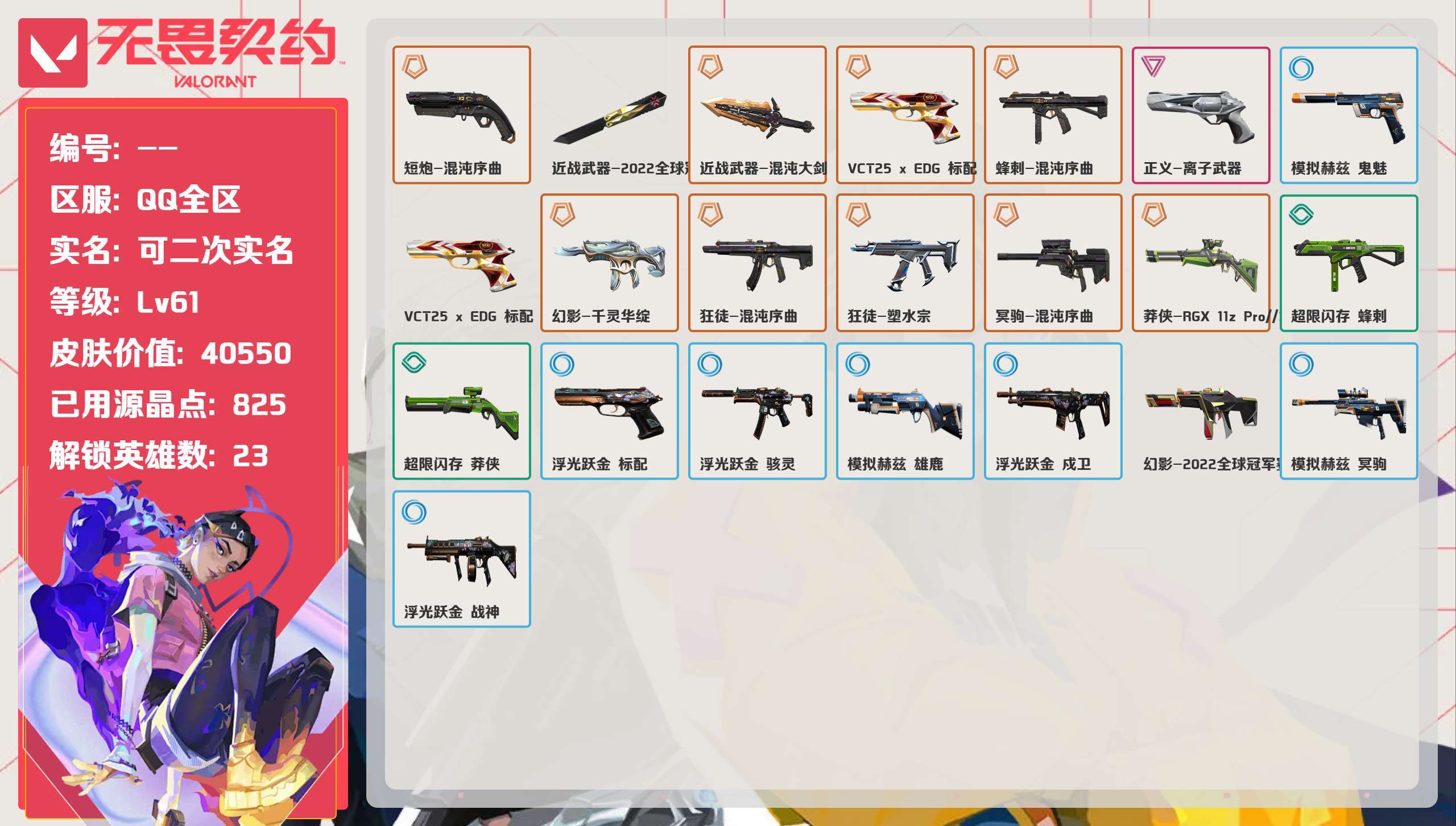 [13862109]等级:lv61 | 白银i/ 已用源晶点:825/ 皮肤价值:40550/ 英雄数:23/ 【英雄】 铁臂 捷风 雷兹 幽影 炼狱 不死鸟 贤者 猎枭 零 芮娜 奇乐 斯凯 k/o 尚勃勒 霓虹 黑梦 盖可 壹决 暮蝶 维斯 钛狐 幻棱 【套装】 塑水宗套装(塑水宗狂徒) rgx 11z pro//3.0(rgx11zpro//3.0莽侠) 离子武器(离子武器正义) 千灵华绽套装(千灵华绽幻影) 混沌序曲 礼包(混沌序曲狂徒混沌序曲蜂刺混沌序曲短炮混沌序曲冥驹混沌大剑) 2022全球冠军赛套装(2022全球冠军赛蝴蝶刀2022全球冠军赛幻影) 【佩呛 短炮】 短炮-混沌序曲 【近战武器】 近战武器-2022全球冠军赛蝴蝶刀 近战武器-混沌大剑 【佩呛 鬼魅】 模拟赫兹 鬼魅 【佩呛 正义】 正义-离子武器 【佩呛 标配】 vct25 x edg 标配 浮光跃金 标配 【佩呛 vct手呛】 vct25 x edg 标配 【冲锋呛 蜂刺】 超限闪存 蜂刺 蜂刺-混沌序曲 【冲锋呛 骇灵】 浮光跃金 骇灵 【霰弹呛 雄鹿】 模拟赫兹 雄鹿 【步呛 戍卫】 浮光跃金 戍卫 【步呛 幻影】 幻影-2022全球冠军赛 幻影-千灵华绽 【步呛 狂徒】 狂徒-混沌序曲 狂徒-塑水宗 【狙击呛 冥驹】 模拟赫兹 冥驹 冥驹-混沌序曲 【狙击呛 莽侠】 超限闪存 莽侠 莽侠-rgx 11z pro//3.0 【机呛 战神】 浮光跃金 战神 【卡面】 我眼中的世界 南瓜盛典 修车达人 正义的化身 时间到 最高舞台 声感陷阱设计图 梦幻奶茶 零点嗅探设计图 逮到一个 沙雕爆能器 清除名单 无畏契约go!第一卷:芮娜 无畏契约go!第一卷:零 龍记 《双城之战》金克丝 红鳞松叶 完美调谐 惊吓战术 暗呛 钢锁vs盖可 别冒尖 夜露vs不死鸟 铁臂设计图 开拓者 代号红色 新兵报到 v契约 无畏契约 【喷漆】 双击点赞 买装还是存钱 秘笈顺序 醒狮贺春 无畏契约go!第一卷:贤者 无畏契约go!第一卷:捷风 暴走萝莉 蕊形灯 放下武器 胜利属于无畏契约 glhf 无畏契约 熊抱 超级粉丝 捷风差距 拼一呛 想得美 【挂饰】 达摩娃娃 第八季//第二幕 天外飞客 好运福爪 第八季//第一幕 瑞思拜 第七季//第三幕 无畏契约 第九季//第三幕 熔岩灯 第九季//第二幕 袖珍捷风 迷你浓缩 第九季//第一幕