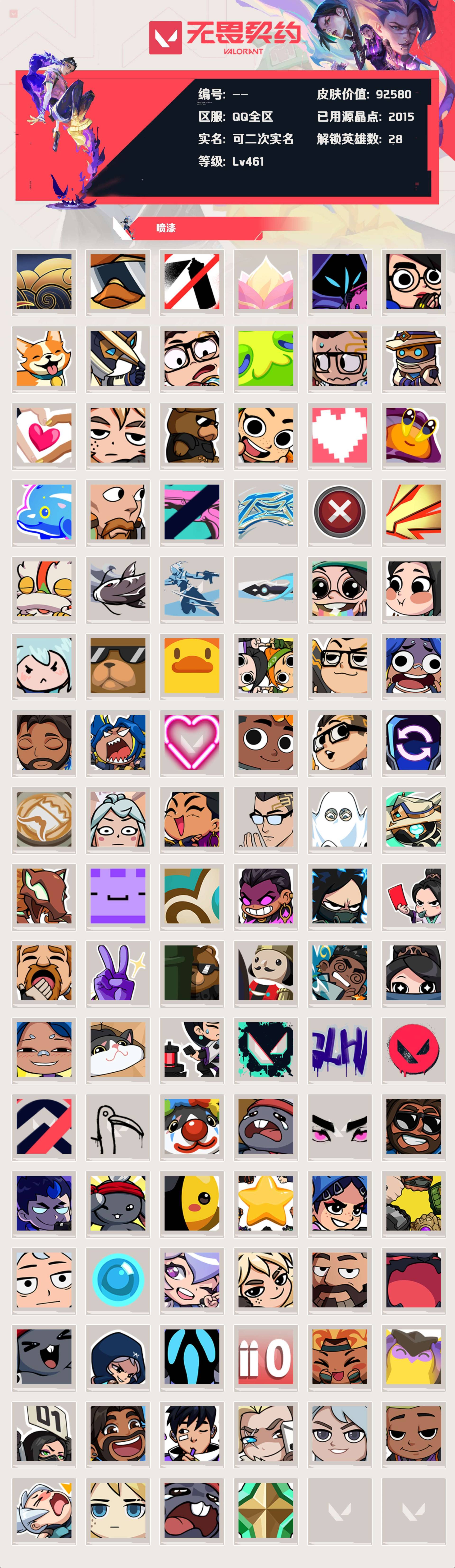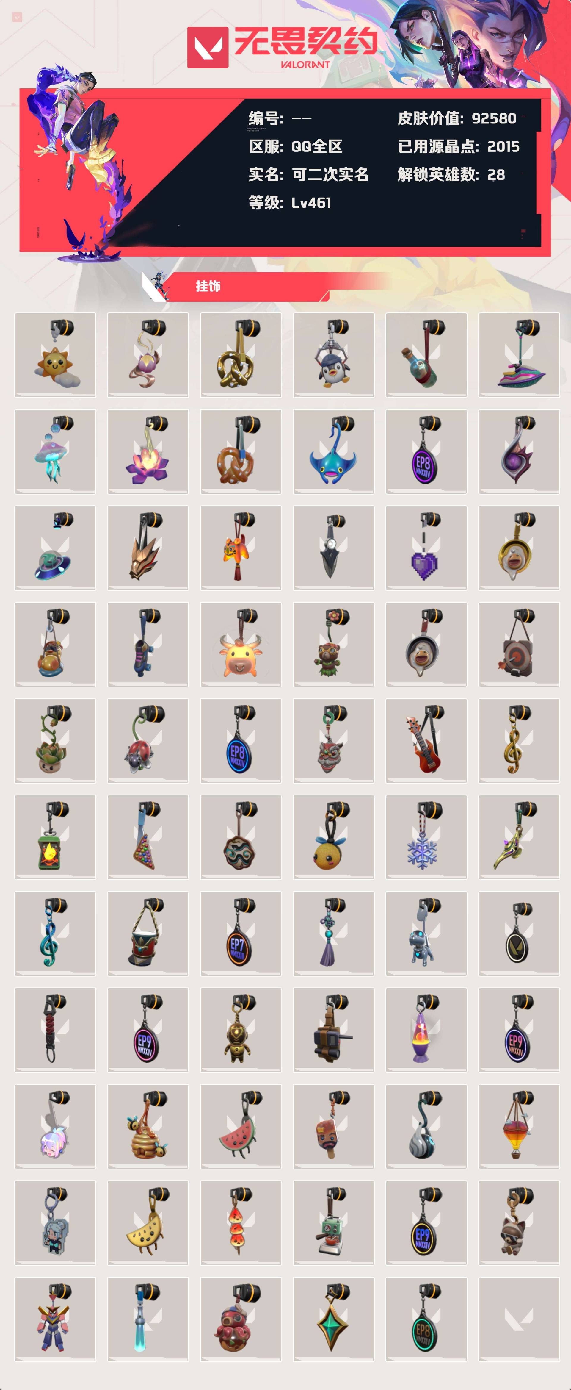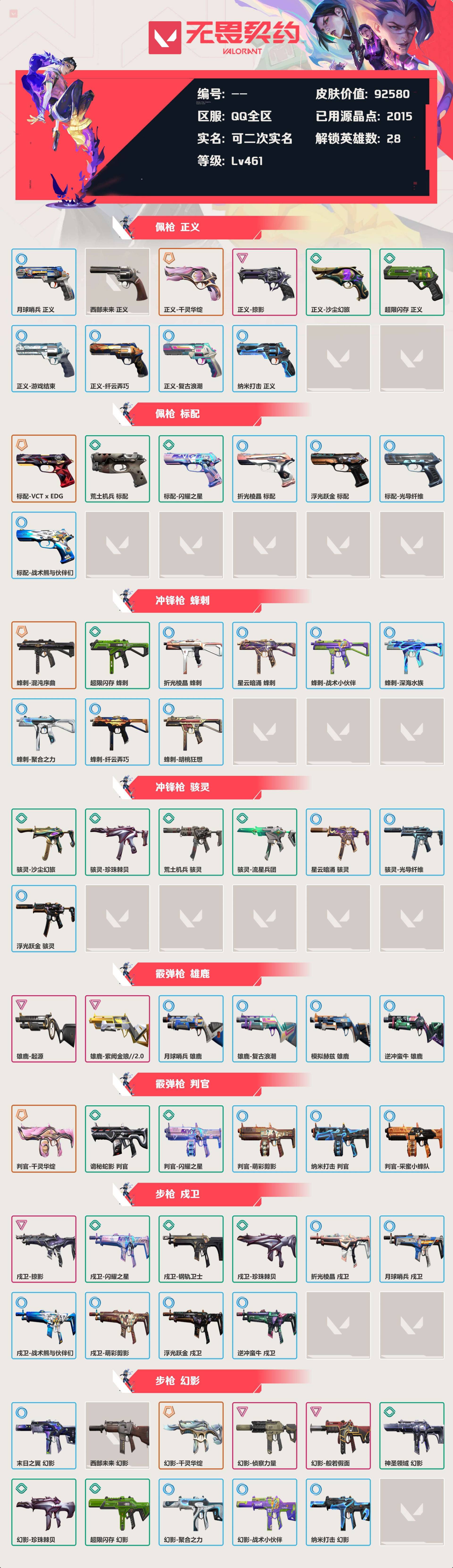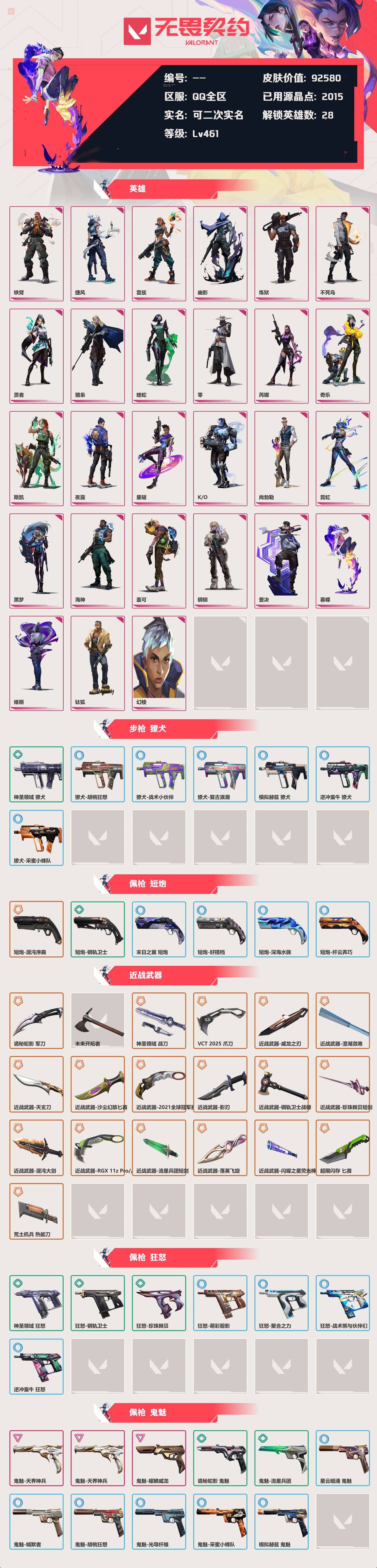 [13862359]等级:lv461 | 神话i/ 已用源晶点:2015/ 皮肤价值:92580/ 英雄数:28/ 【英雄】 铁臂 捷风 雷兹 幽影 炼狱 不死鸟 贤者 猎枭 蝰蛇 零 芮娜 奇乐 斯凯 夜露 星礈 k/o 尚勃勒 霓虹 黑梦 海神 盖可 钢锁 壹决 暮蝶 维斯 钛狐 幻棱 【套装】 偃月苍龙套装(偃月苍龙狂徒) 盖亚的复仇套装(盖亚的复仇狂徒) 紫阙金琅套装(紫阙金琅狂徒) 归零者套装(归零者狂徒归零者冥驹) 起源套装(起源雄鹿) 天界神兵套装(天界神兵鬼魅天玄刀) 日冕雄师(日冕雄师狂徒) 2021全球冠军赛套装(2021全球冠军赛狂徒2021全球冠军赛爪刀) 堕天遗武套装(堕天遗武狂徒堕天遗武冥驹) rgx 11z pro//3.0(rgx11zpro//3.0爪刀) 耀鳞威龙(耀鳞威龙狂徒耀鳞威龙鬼魅威龙之刃) vctxedg 队伍礼包(vctxedg标配) 英雄之选 礼包(天界神兵鬼魅堕天遗武冥驹紫阙金琅狂徒) 全息波普//2.0(全息波普//2.0狂徒) 侦察力量(侦察力量幻影) 千灵华绽套装(千灵华绽幻影千灵华绽正义千灵华绽判官千灵华绽冥驹落英飞旋) 紫阙金琅//2.0(紫阙金琅//2.0雄鹿) 混沌序曲 礼包(混沌序曲狂徒混沌序曲蜂刺混沌序曲短炮混沌序曲冥驹混沌大剑) 掠影 礼包(掠影狂徒掠影戍卫掠影正义掠影冥驹影刃) 回响礼包 // v25 礼包(侦察力量幻影耀鳞威龙鬼魅) rgx 11z pro 礼包(rgx11zpro狂徒) 虚空遗器 礼包(虚空遗器狂徒) vct 2025 赛季 礼包(vct2025爪刀) 西部未来 礼包(西部未来幻影西部未来飞将西部未来奥丁西部未来正义未来开拓者) 般若假面(般若假面幻影)