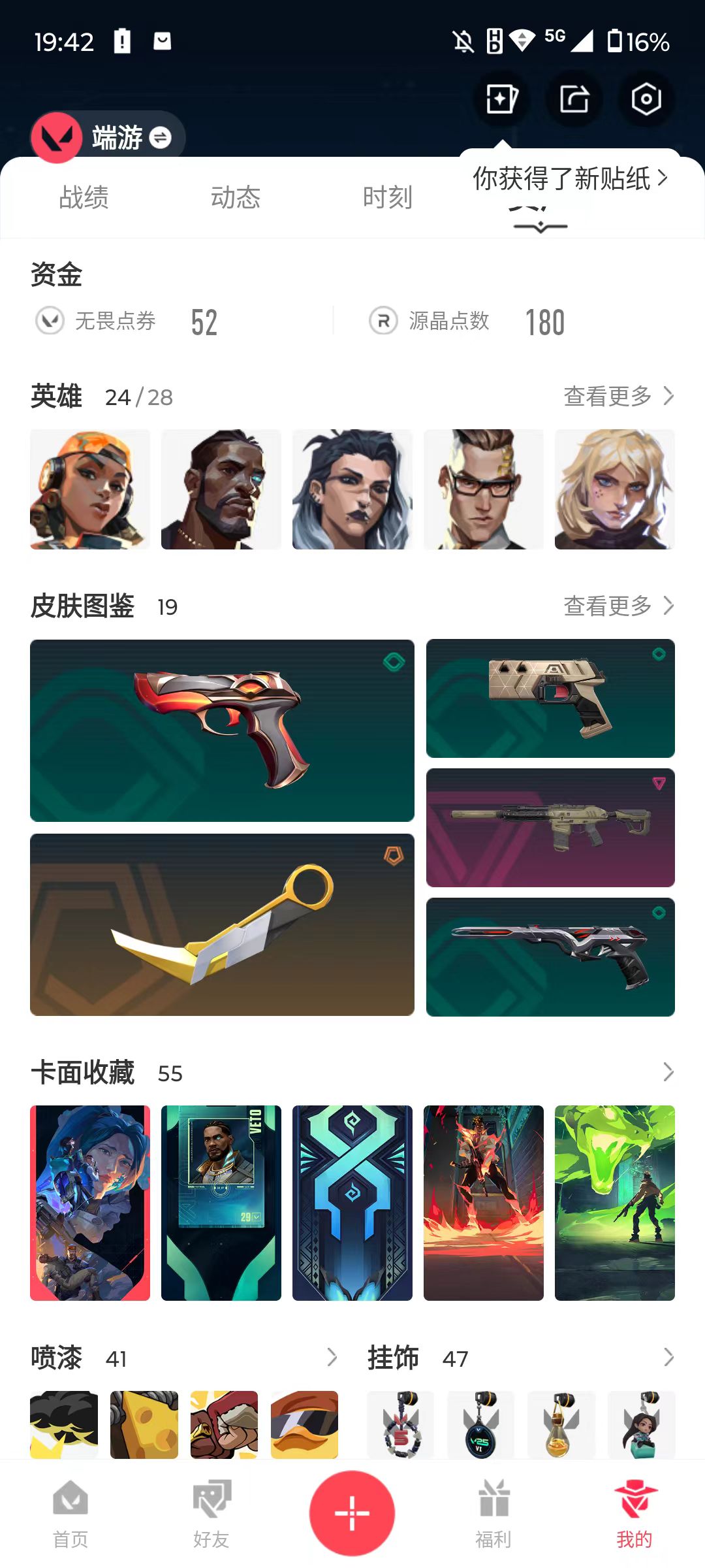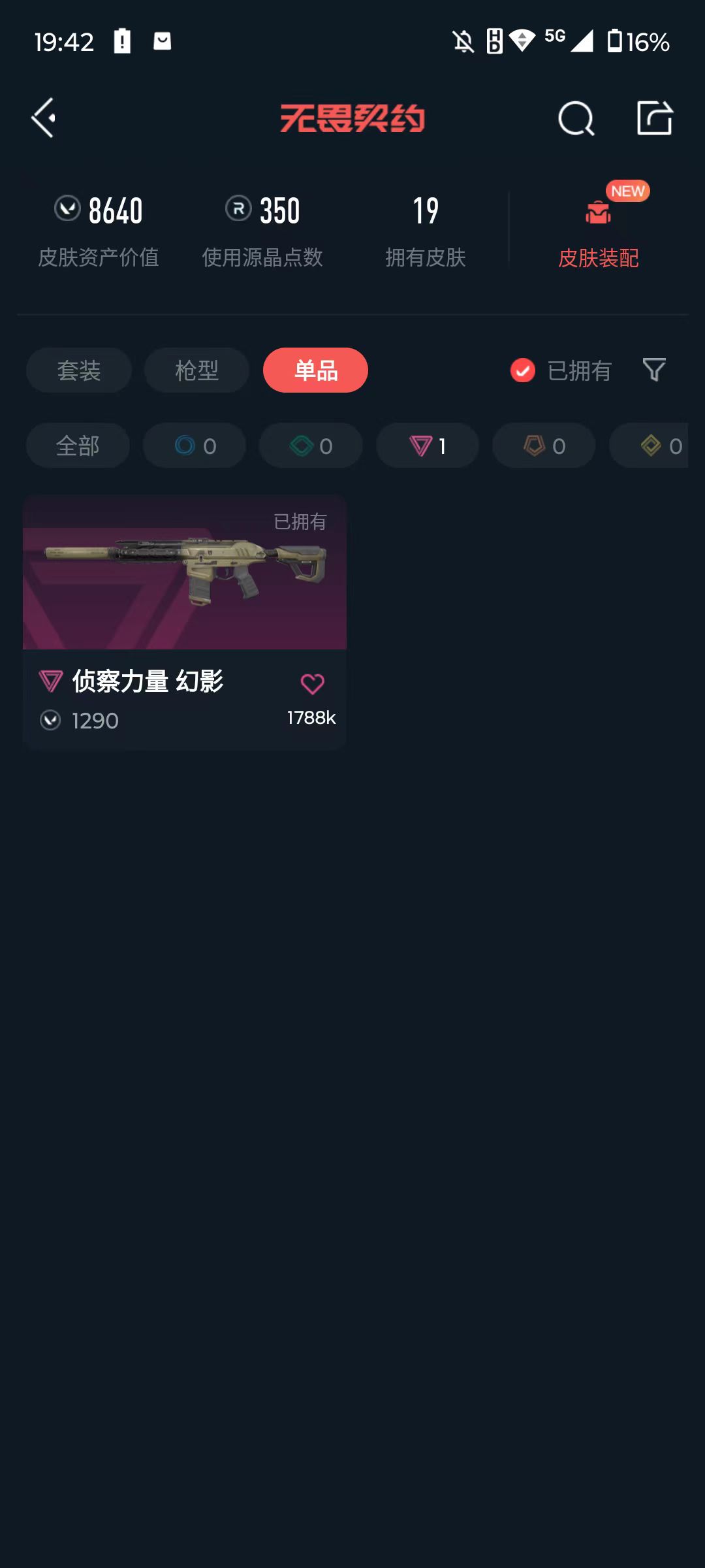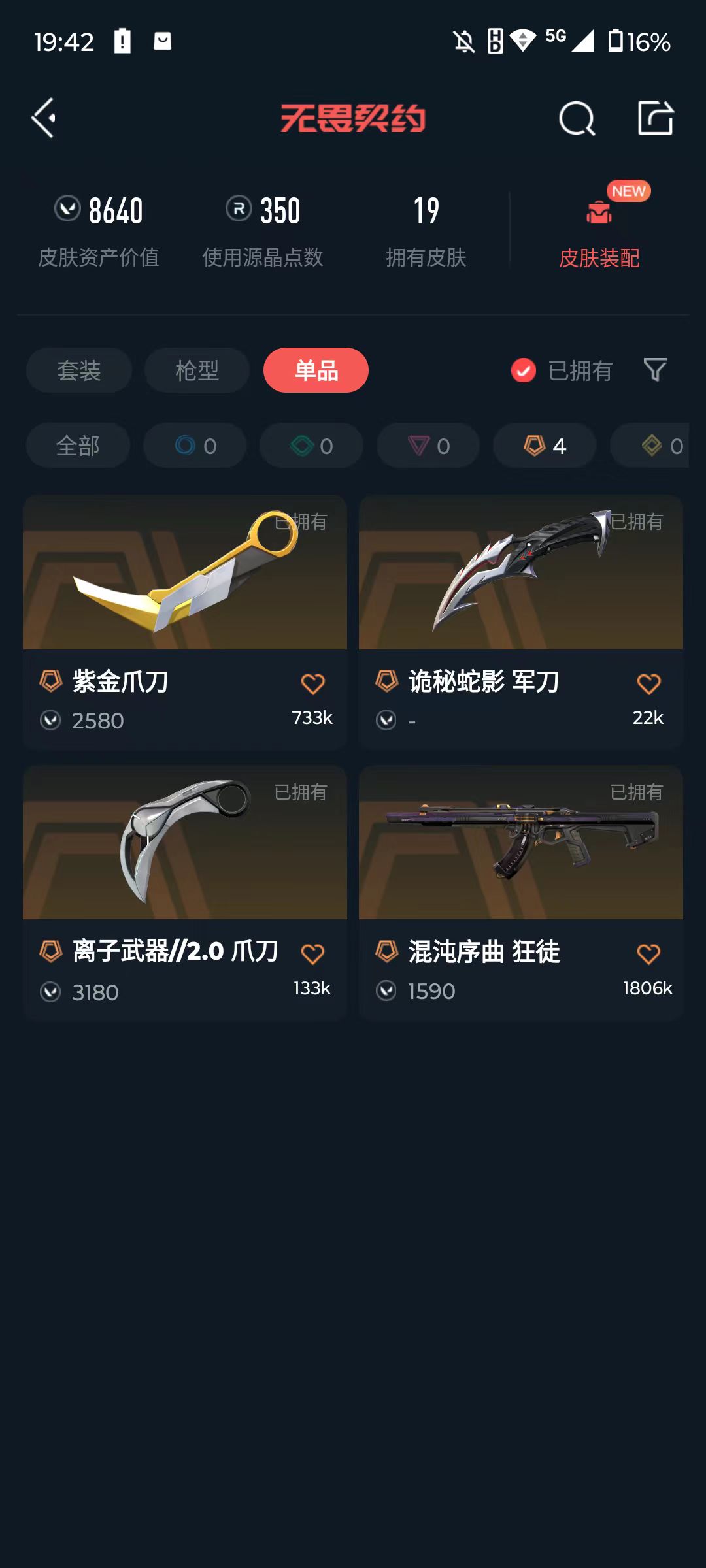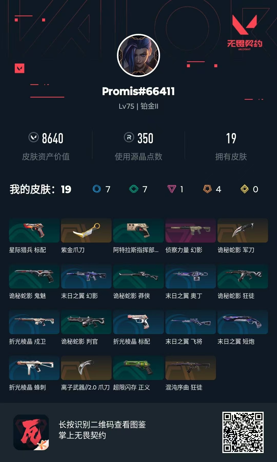 [13990448]s192023无畏契约/75等级/铂金段位/24英雄/19皮肤/资产8640/已使用r点350/剩余r点180/混沌序曲-狂徒,侦察力量-幻影,诡秘蛇影-军刀,离子武器//2.0-爪刀,紫金爪刀