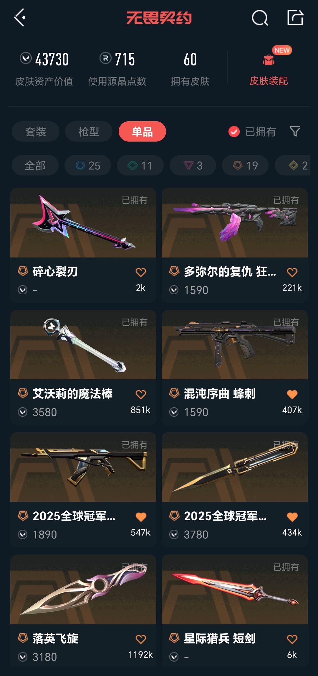 【25冠军套 滋滋x特攻队礼包】【游戏等级】lv113 【段位】 白银i 【r点】715 【皮肤总价值】43730 【英雄数量】27 【皮肤数量】60 【挂饰数量】48 【卡面数量】65 【喷漆数量】63 【近战武器】近战武器-碎心裂刃 近战武器-艾沃莉的魔法棒 近战武器-2025全球冠军赛蝴蝶刀 近战武器-落英飞旋 近战武器-星际猎兵短剑 近战武器-神之刃 近战武器-奇点//2.0蝴蝶刀 近