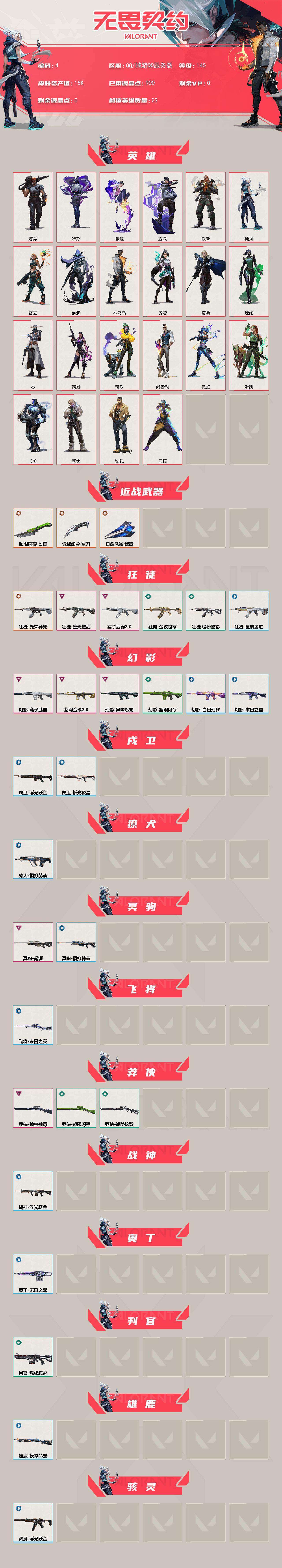 【游戏等级】lv140 【段位】 黄金i 【r点】900 【皮肤总价值】15870 【英雄数量】23 【皮肤数量】54 【挂饰数量】83 【卡面数量】92 【喷漆数量】80 【近战武器】近战武器-日耀风暴遗器 近战武器-诡秘蛇影军刀 近战武器-超限闪存匕首 【正义】正义-日耀风暴 正义-纳米打击 正义-超限闪存 【冥驹】冥驹-甜蜜战术 冥驹-起源 冥驹-模拟赫兹 【骇灵】骇