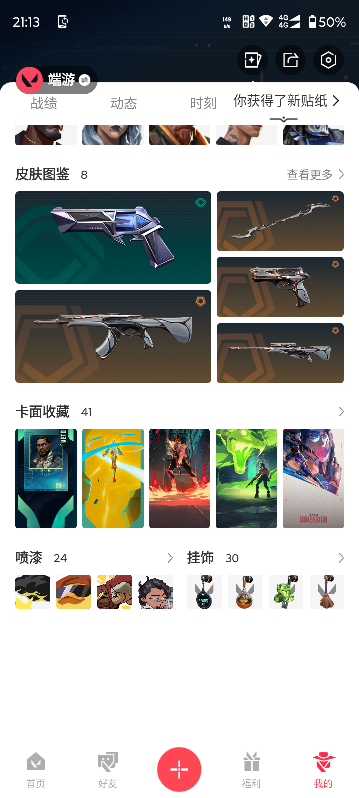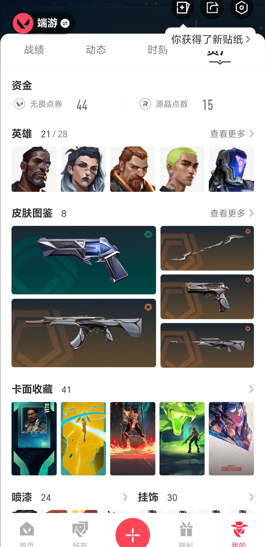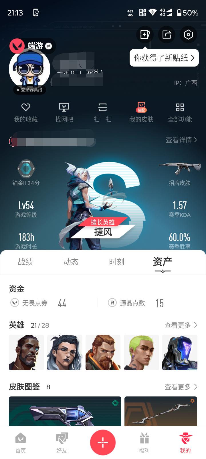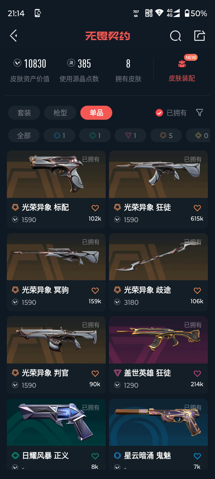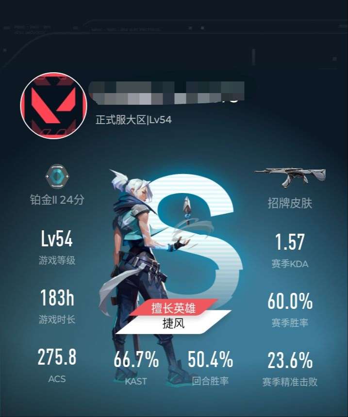 【游戏等级】lv54 【段位】 铂金ii 【r点】385 【皮肤总价值】10830 【英雄数量】21 【皮肤数量】8 【挂饰数量】30 【卡面数量】41 【喷漆数量】24 【正义】正义-日耀风暴 【标配】标配-光荣异象 【狂徒】狂徒-光荣异象 狂徒-盖世英雄 【冥驹】冥驹-光荣异象 【近战武器】近战武器-光荣异象歧途 【判官】判官-光荣异象 【鬼魅】鬼魅-星云暗涌