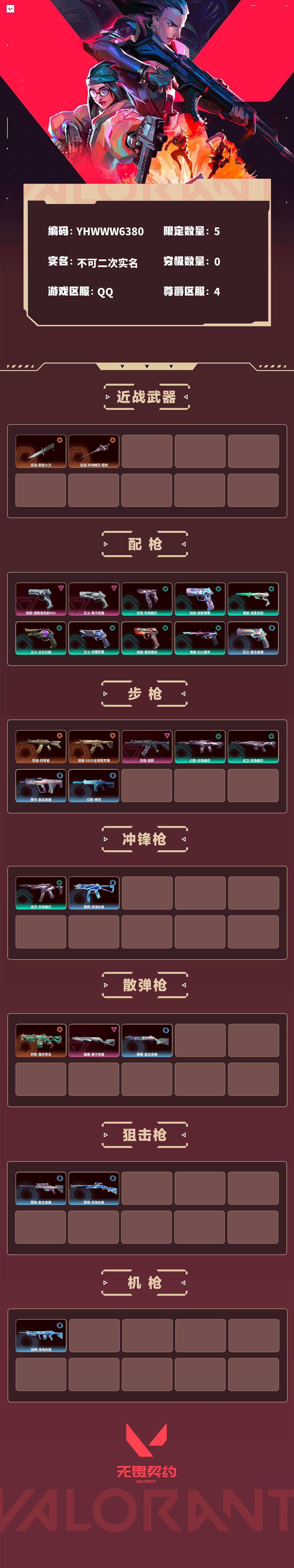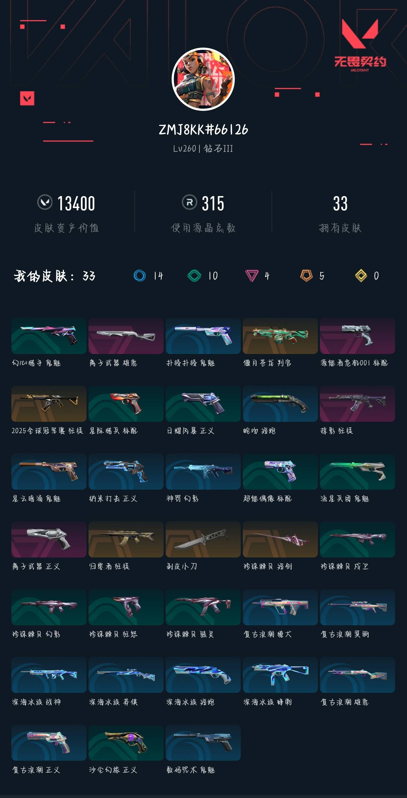 【无畏契约】【yhwww6380】等级:260,已用无畏点13400,已用源晶点315,橙皮:近战-剥皮小刀|近战-珍珠棘贝 短剑|狂徒-归零者|判官-偃月苍龙|狂徒-2025全球冠军赛__紫皮:标配-源能者危机001|雄鹿-离子武器|正义-离子武器|狂徒-掠影__绿皮:骇灵-珍珠棘贝|幻影-珍珠棘贝|狂怒-珍珠棘贝|戍卫-珍珠棘贝|标配-超能偶像|鬼魅-流星兵团|正义-沙尘幻旅|正义-日耀风暴|标配-星际猎兵|鬼魅-幻心猎手__蓝皮:獠犬-复古浪潮|冥驹-复古浪潮|雄鹿-复古浪潮|正义-复古浪潮|短炮-蛇吻|鬼魅-数码咒术|正义-纳米打击|鬼魅-星云暗涌|鬼魅-扑棱扑棱|战神-深海水族|短炮-深海水族|蜂刺-深海水族|莽侠-深海水族|幻影-神罚__段位:钻石__英雄:尚勃勒|维斯|黑梦|斯凯|暮蝶|盖可|霓虹|壹决|星礈|k/o|幽影|夜露|钢锁|海神|奇乐|炼狱|铁臂|贤者|猎枭|钛狐|芮娜|零|捷风|蝰蛇|不死鸟|幻棱|雷兹|禁灭
