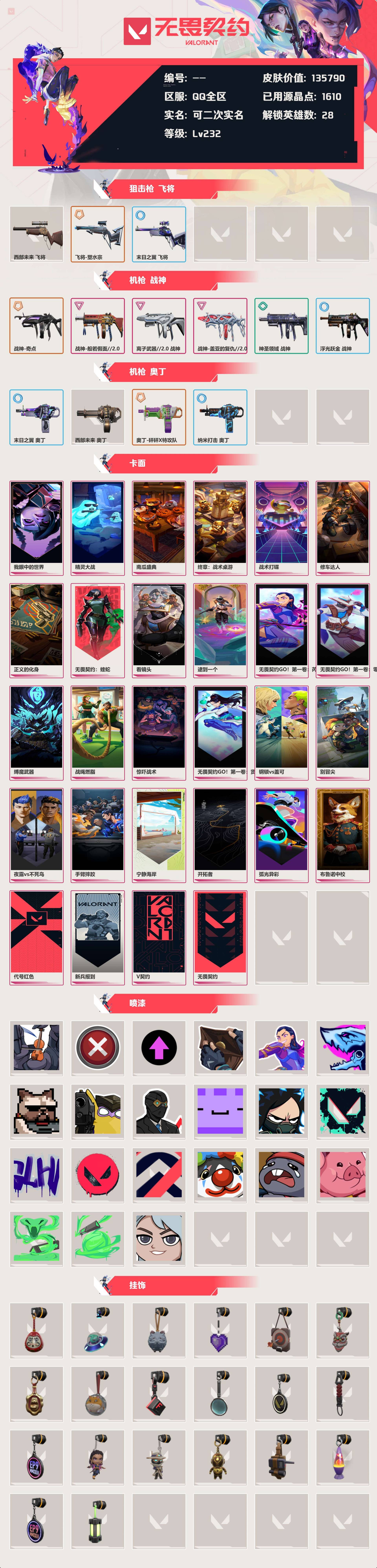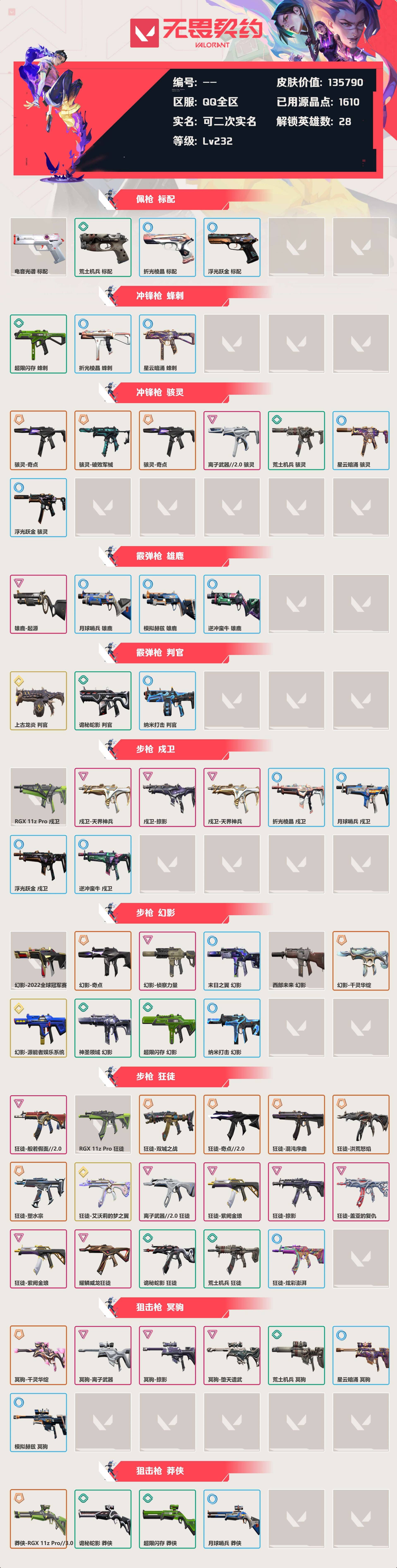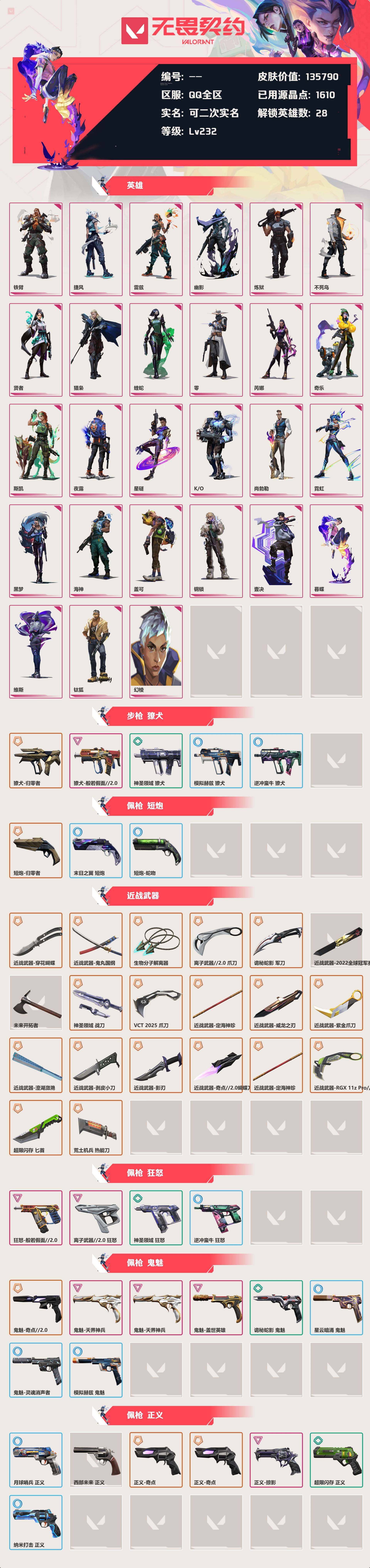 [13990946]等级:lv232 | 铂金i/ 已用源晶点:1610/ 皮肤价值:135790/ 英雄数:28/ 【英雄】 铁臂 捷风 雷兹 幽影 炼狱 不死鸟 贤者 猎枭 蝰蛇 零 芮娜 奇乐 斯凯 夜露 星礈 k/o 尚勃勒 霓虹 黑梦 海神 盖可 钢锁 壹决 暮蝶 维斯 钛狐 幻棱 【套装】 盖亚的复仇套装(盖亚的复仇狂徒) 紫阙金琅套装(紫阙金琅狂徒) 归零者套装(归零者短炮归零者獠犬) 砰砰x特攻队套装(砰砰x特攻队奥丁) 起源套装(起源雄鹿) 天界神兵套装(天界神兵戍卫天界神兵鬼魅) 盖世英雄套装(盖世英雄鬼魅定海神珍) 黑市 礼包(穿花蝴蝶) 破败军械套装(破败军械骇灵) 塑水宗套装(塑水宗狂徒塑水宗飞将) 堕天遗武套装(堕天遗武冥驹) 般若假面//2.0 礼包(般若假面//2.0狂徒般若假面//2.0战神般若假面//2.0狂怒般若假面//2.0獠犬鬼丸国纲) 洪荒怒焰套装(洪荒怒焰狂徒) 盖亚的复仇//2.0(盖亚的复仇//2.0战神) 异形猎人(剥皮小刀) rgx 11z pro//3.0(rgx11zpro//3.0莽侠rgx11zpro//3.0爪刀) 《双城之战》收藏套装 礼包(双城之战狂徒) 耀鳞威龙(耀鳞威龙狂徒威龙之刃) 英雄之选 礼包(天界神兵鬼魅天界神兵戍卫堕天遗武冥驹紫阙金琅狂徒定海神珍) 源能者娱乐系统(源能者娱乐系统幻影) 离子武器(离子武器冥驹) 艾沃莉的梦之翼(艾沃莉的梦之翼狂徒) 侦察力量(侦察力量幻影) 千灵华绽套装(千灵华绽幻影千灵华绽冥驹) 紫阙金琅//2.0(紫金爪刀) 混沌序曲 礼包(混沌序曲狂徒) 奇点//2.0 礼包(奇点//2.0狂徒奇点//2.0鬼魅奇点//2.0蝴蝶刀) 掠影 礼包(掠影狂徒掠影戍卫掠影正义掠影冥驹影刃) 2022全球冠军赛套装(2022全球冠军赛蝴蝶刀2022全球冠军赛幻影) 回火礼包:奇点 礼包(奇点//2.0狂徒奇点//2.0鬼魅奇点//2.0蝴蝶刀奇点幻影奇点正义奇点骇灵) 黑市 礼包(穿花蝴蝶) 回响礼包 // v25 礼包(侦察力量幻影) rgx 11z pro 礼包(rgx11zpro狂徒rgx11zpro戍卫) 电音光谱 礼包(电音光谱标配) 离子武器//2.0 礼包(离子武器//2.0狂徒离子武器//2.0骇灵离子武器//2.0狂怒离子武器//2.0战神离子武器//2.0爪刀) vct 2025 赛季 礼包(vct2025爪刀) 西部未来 礼包(西部未来幻影西部未来飞将西部未来奥丁西部未来正义未来开拓者) 上古龙炎 礼包(上古龙炎判官) 归零者//2.0 礼包(生物分子解离器) 【步呛 獠犬】 獠犬-般若假面//2.0 神圣领域 獠犬 模拟赫兹 獠犬 逆冲蛮牛 獠犬 獠犬-归零者 【佩呛 短炮】 末日之翼 短炮 短炮-蛇吻 短炮-归零者 【近战武器】 近战武器-穿花蝴蝶 近战武器-鬼丸国纲 生物分子解离器 离子武器//2.0 爪刀 诡秘蛇影 军刀 近战武器-2022