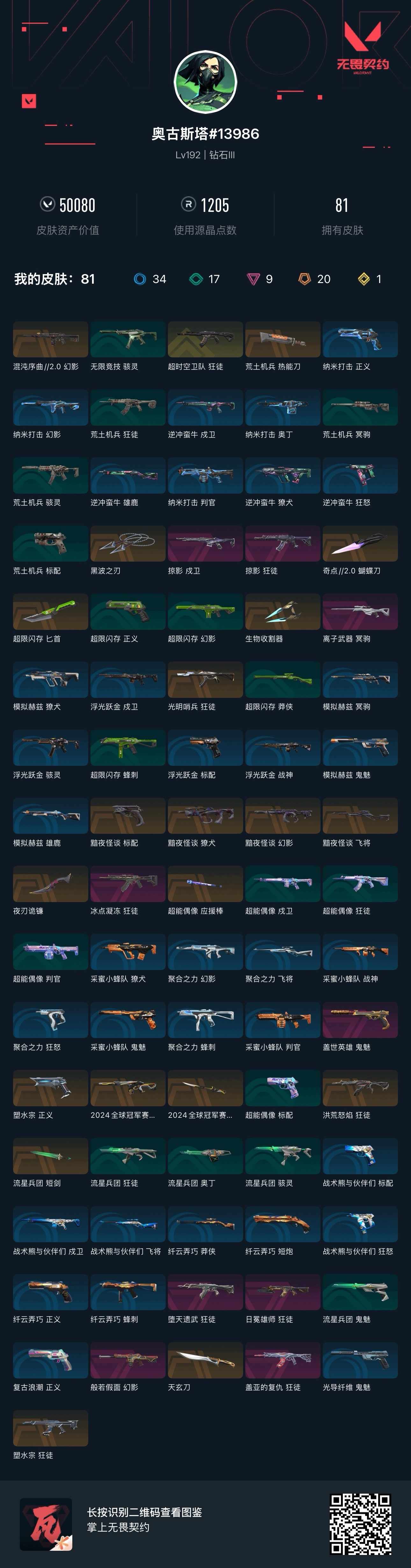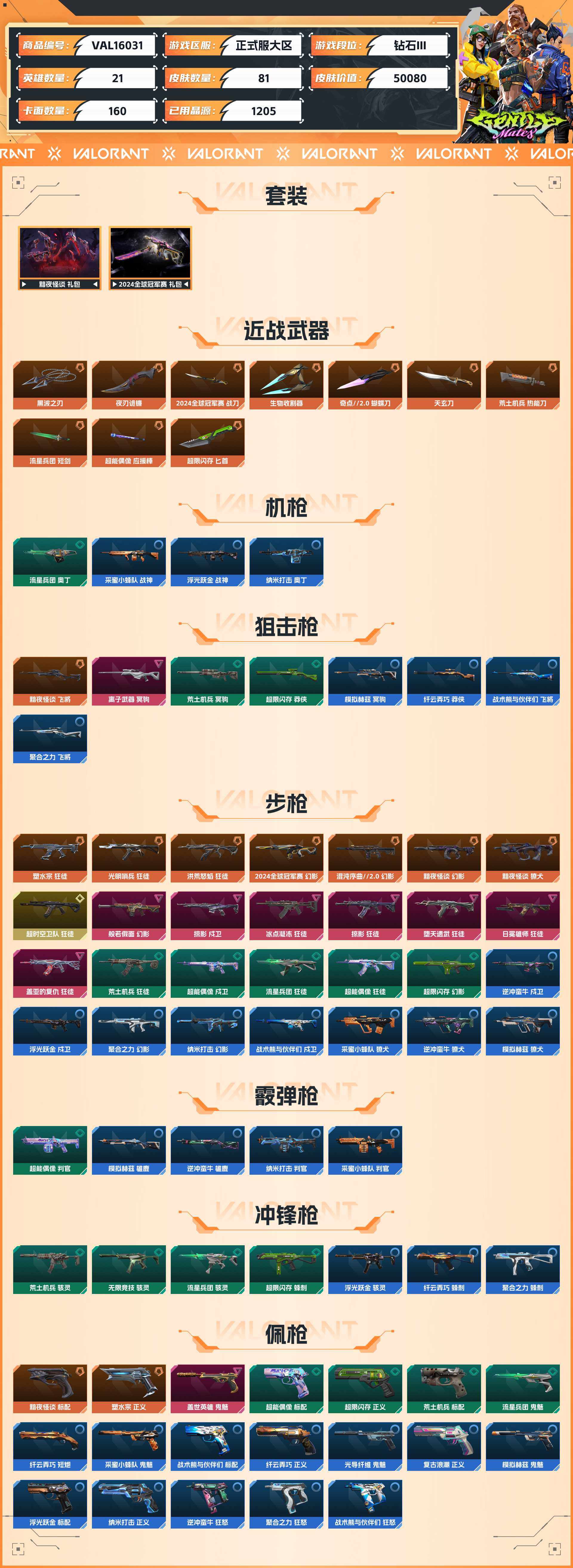 val16031|可二次 钻石iii 皮肤价值50080 已用晶源1205 皮肤数量81 套装数量2 终极1 限定20 卓越9 奢华17 精选34【拥有套装】黯夜怪谈 礼包2024全球冠军赛 礼包【拥有皮肤】黑波之刃夜刃诡