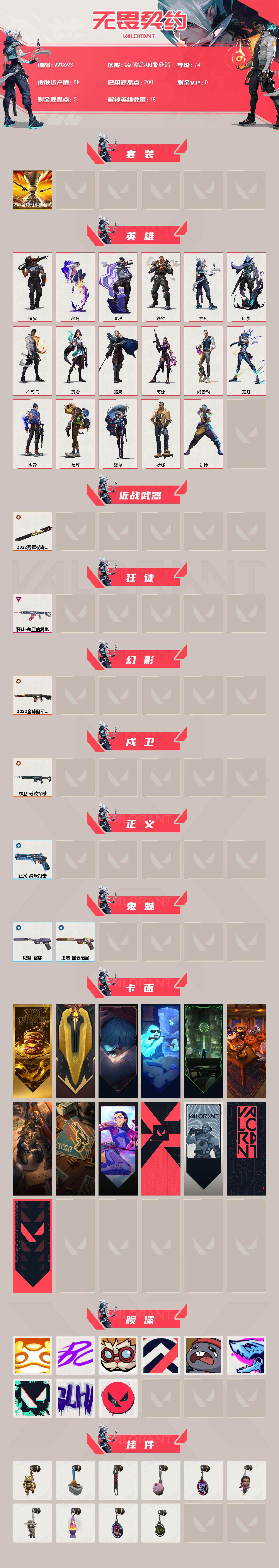 【wwc693】终极3/卓越1/皮肤8/等级74/段位:黄金/2022全球冠军赛套装/幻棱/炼狱/暮蝶/钛狐/壹决/铁臂/捷风/幽影/不死鸟/贤者/猎枭/芮娜/尚勃勒/霓虹/夜露/盖可/黑梦/近战武器-2022全球冠军赛 蝴蝶刀/狂徒-盖亚的复仇/幻影-2022全球冠军赛/戍卫-破败军械/正义-纳米打击/鬼魅-宿怨/鬼魅-星云暗涌/终章:激斗汉堡 卡面/进入射程 卡面/《双城之战》拥抱 卡面/精灵大战 卡面/欢迎来到底城 卡面/南瓜盛典 卡面/修车达人 卡面/正义的化身 卡面/无畏契约go!第一卷:芮娜 卡面/代号红色 卡面/新兵报到 卡面/v契约 卡面/无畏契约 卡面/嗨宝南瓜灯 喷漆/嘭! 喷漆/都算到了 喷漆/控场勿近 喷漆/熊抱 喷漆/暴走萝莉 喷漆/胜利属于无畏契约 喷漆/glhf 喷漆/无畏契约 喷漆/终章:猫猫木乃伊 挂饰/悠闲鸡块 挂饰/伞绳 挂饰/《双城之战》小蛋糕 挂饰/第九季//第三幕 纪念币 挂饰/无畏契约go!第一卷 芮娜 挂饰/无畏契约go!第一卷 零 挂饰/熔岩灯 挂饰/第九季//第二幕 纪念币 挂饰/无畏契约 纪念币 挂饰