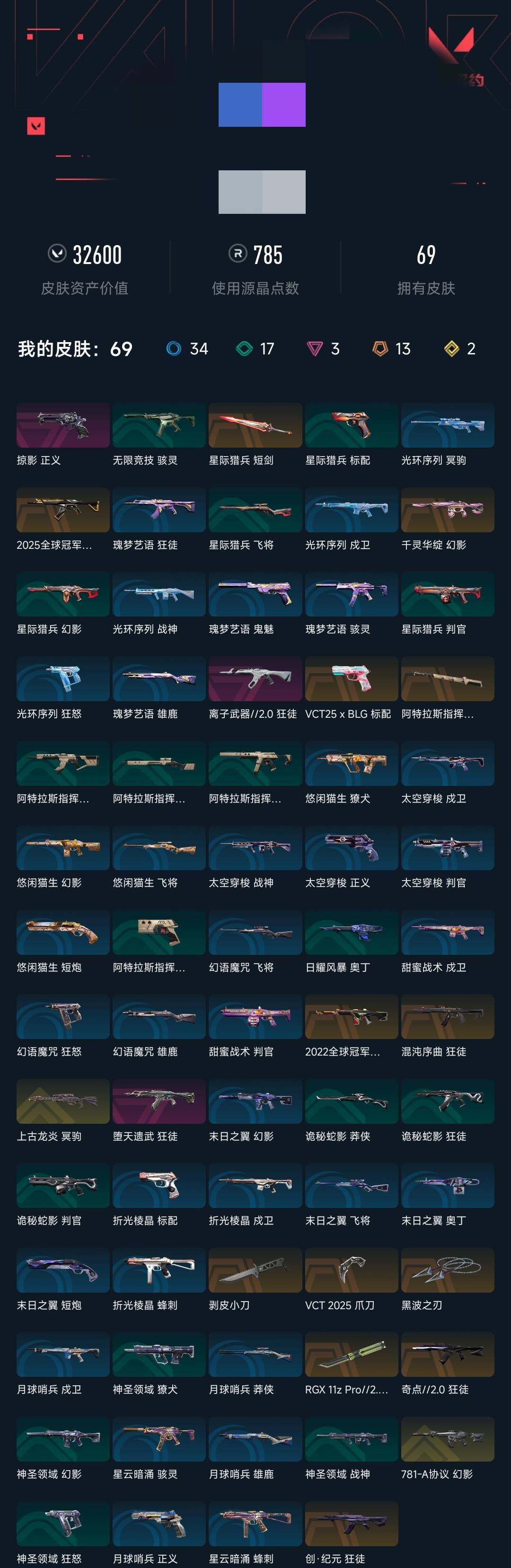 【wwn706】终极13/传奇2/卓越3/皮肤69/等级77/段位:白银/vct 2025 赛季/幻棱/炼狱/暮蝶/钛狐/壹决/铁臂/捷风/幽影/不死鸟/贤者/猎枭/零/芮娜/奇乐/尚勃勒/霓虹/夜露/k/o/盖可/黑梦/rgx-11z-pro//2.0-蝴蝶刀/剥皮小刀/vct-2025-爪刀/黑波之刃/近战武器-阿特拉斯指挥部 甩棍/近战武器-星际猎兵 短剑/狂徒-2025全球冠