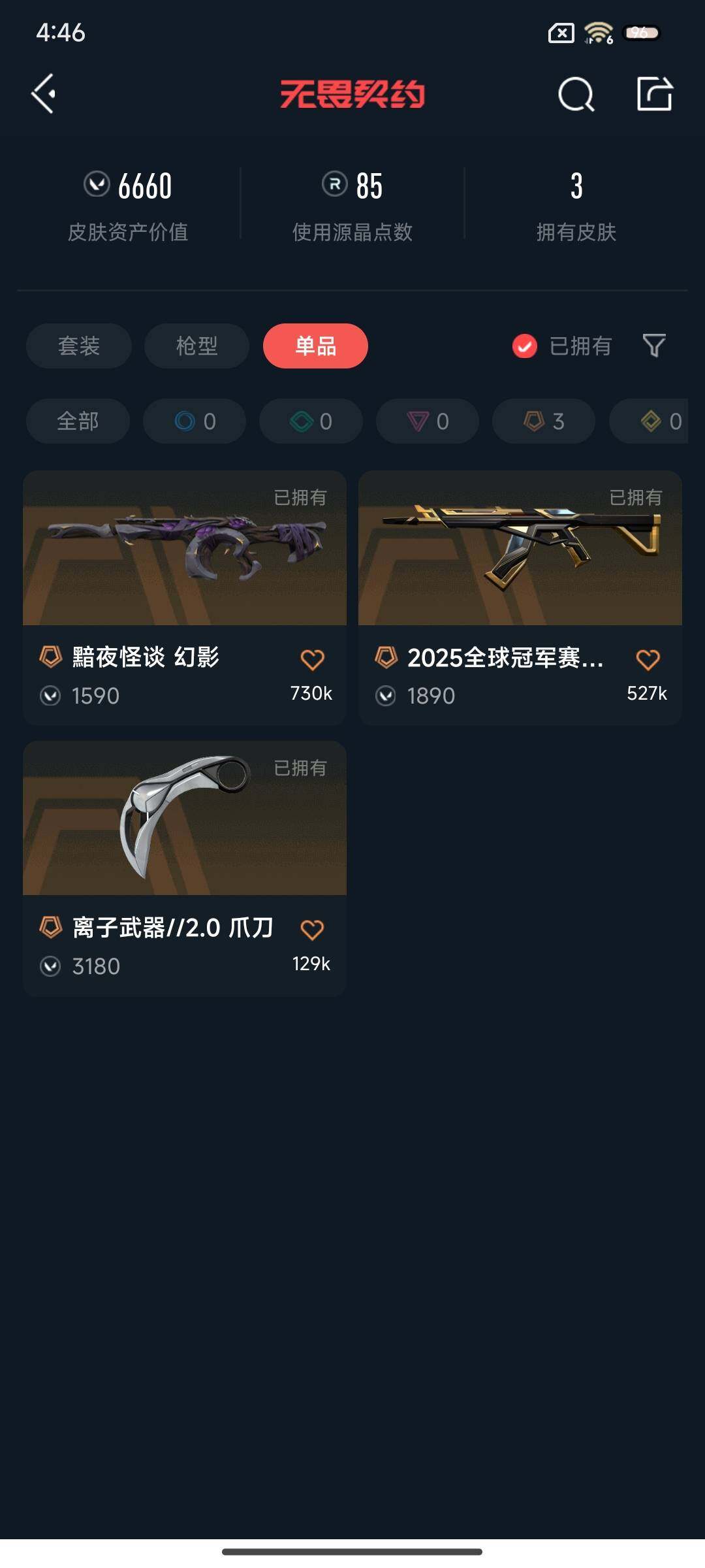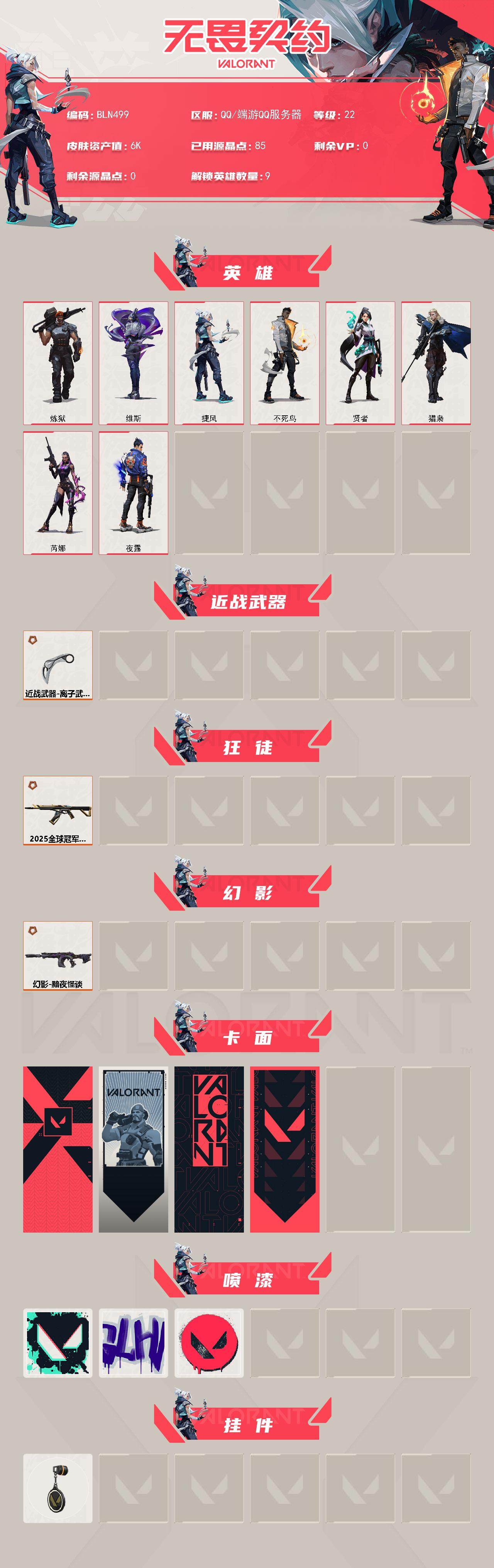 【bln499】终极3/皮肤3/等级22/段位:黑铁/炼狱/维斯/捷风/不死鸟/贤者/猎枭/芮娜/夜露/离子武器2.0爪刀/狂徒-2025全球冠军赛/黯夜怪谈-幻影/代号红色 卡面/新兵报到 卡面/v契约 卡面/无畏契约 卡面/胜利属于无畏契约 喷漆/glhf 喷漆/无畏契约 喷漆/无畏契约 纪念币 挂饰